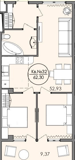 Общая площадь 62,7 кв.м.