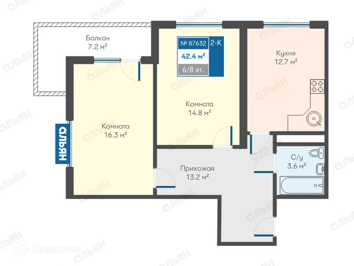 Кухня 16,3 м2, санузел 3,6 м2, прихожая 13,2 м2, комната 14,8 м2, комната 12,7 м2, балкон 7,2 м2.