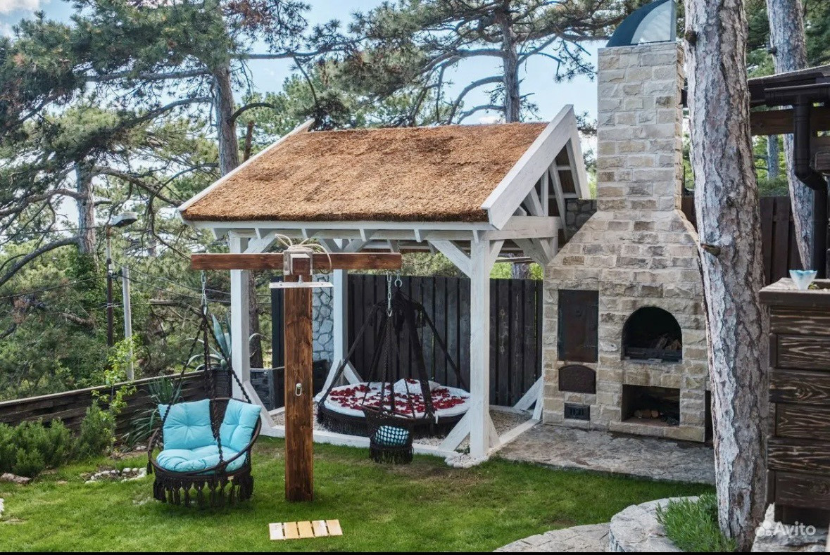 Двор площадью 100 м.кв. с беседкой, мангалом для барбекю и зоной отдыха.