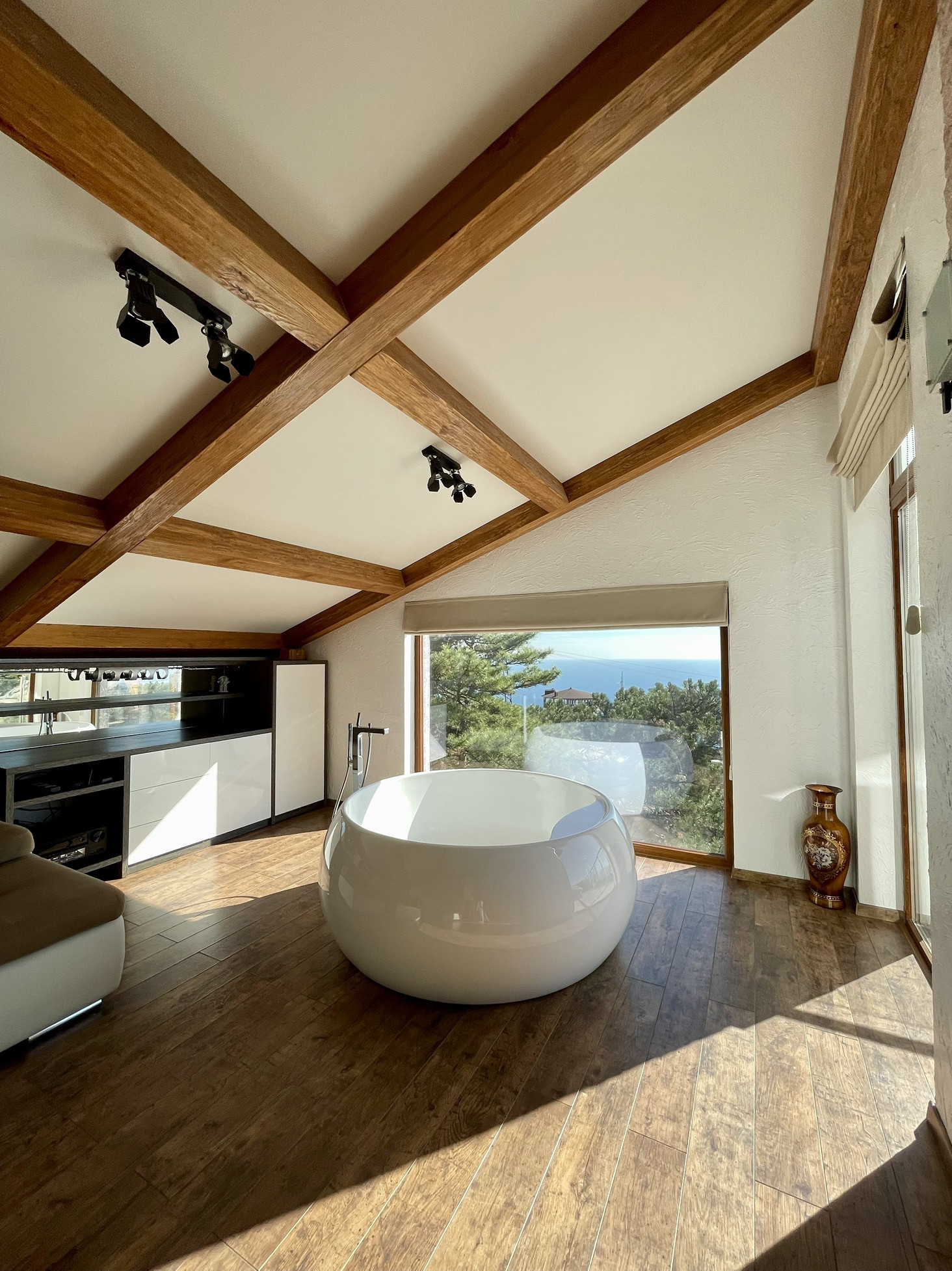 Третий этаж-огромная дизайнерская спальня с круглой ванной, камином и выходом на террасу с прекрасным видом на море, горы, сосны; санузел (туалет, душ).