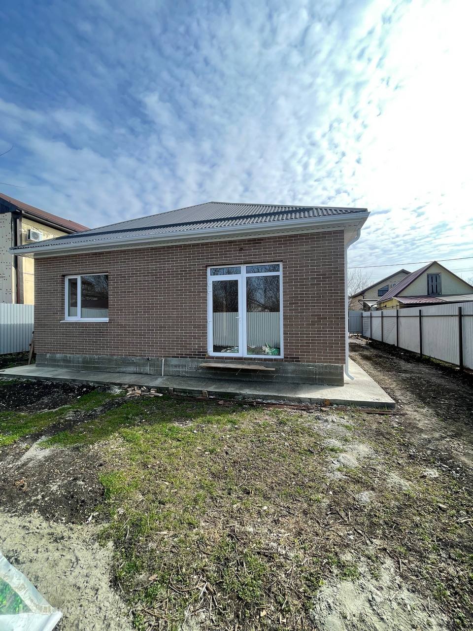 Двор забетонирован под 2 машины. Территория огорожена, участок отсыпан чрноземом.