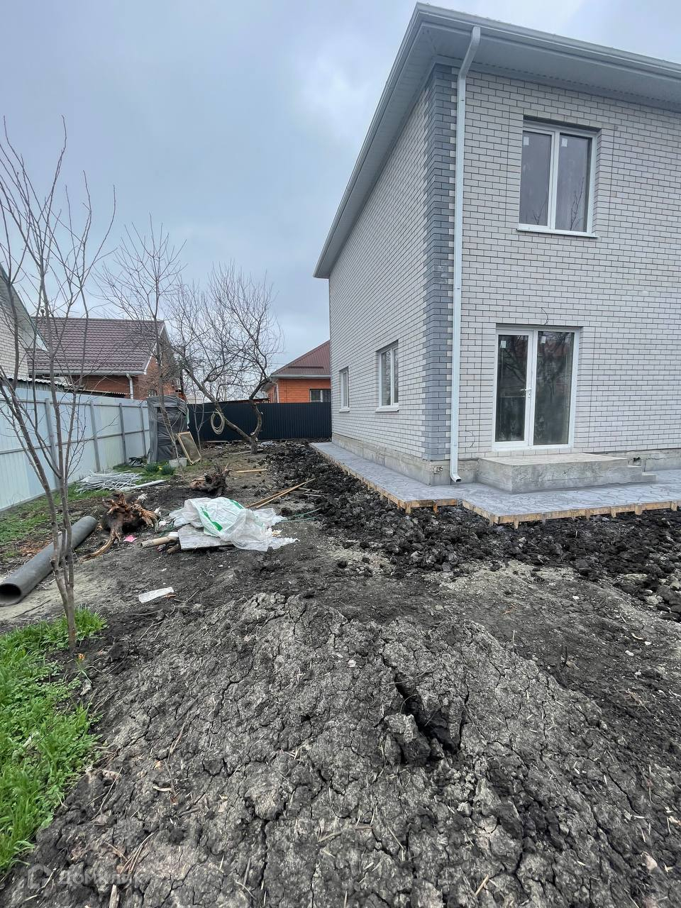 Двор забетонирован под 2 машины. Территория огорожена, участок отсыпан чрноземом.