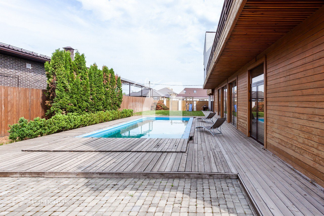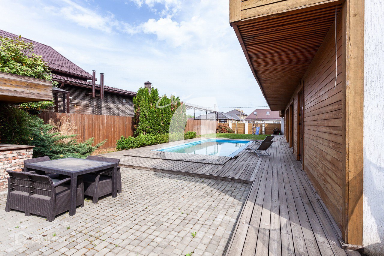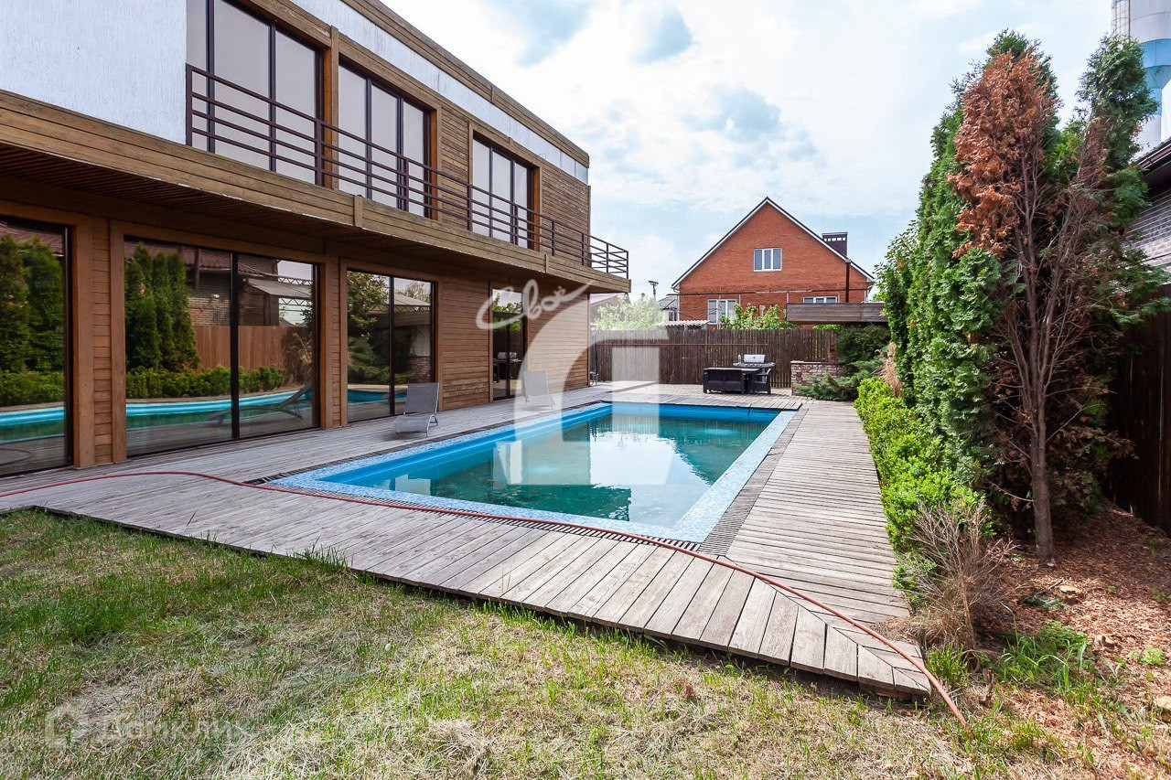 - расположен на 7 сотках облагороженной земли с зеленой зоной, зоной барбекю, террасой и переливным бассейном 4х12 метров