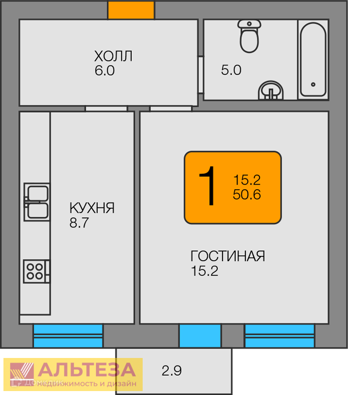 , Янтарный пгт, Советская улица 104Б, 1 комн., общ. пл. 53.5 кв.м., жил.пл. 15.2 кв.м., комнаты 15.2, кухня 8.7 кв.м., 6/6 этаж, окна панорамный вид, санузел совмещенный, балкон, без отделки, Номер лота: 4240979