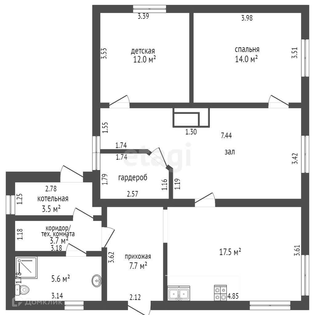 В доме три комнаты, кухня, санузел, кладовая,котельная.