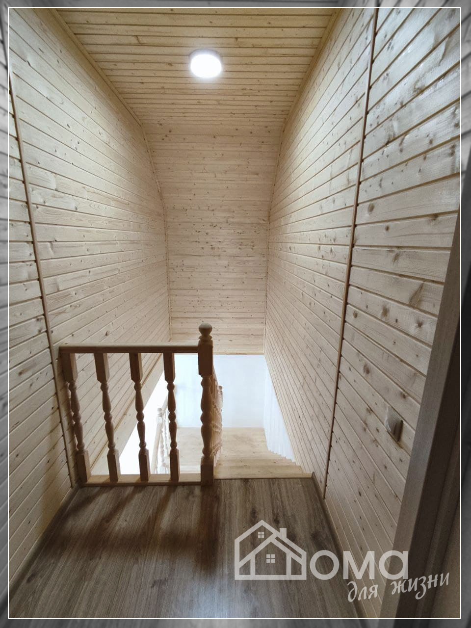 Холл второго этажа отделан вагонкой в натуральном оттенке.