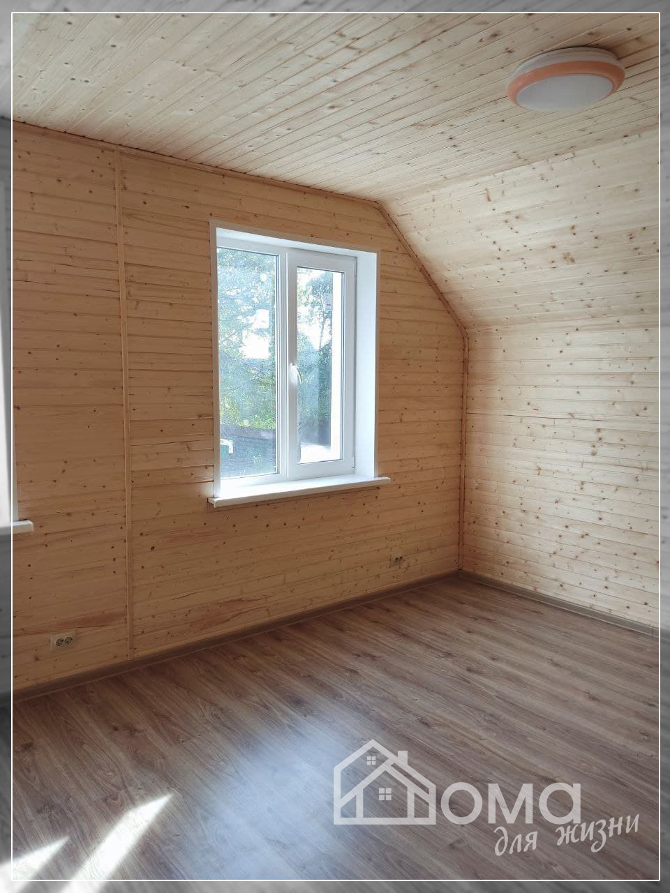 Потолок мансардный, со скосами, отделан натуральной деревянной вагонкой;