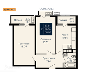 Общая площадь: 60.08 м2