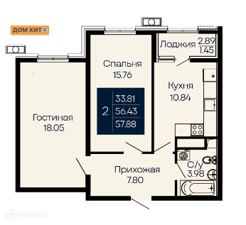 Общая площадь 57.88 м2
