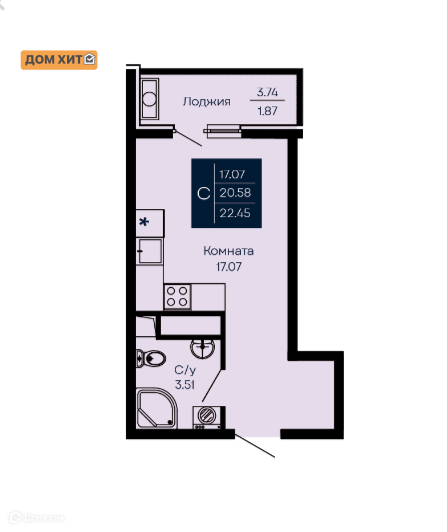 Общая площадь 22.45 м2
