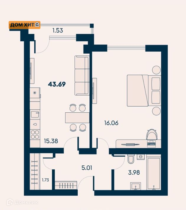 Общая площадь 43.69 м2