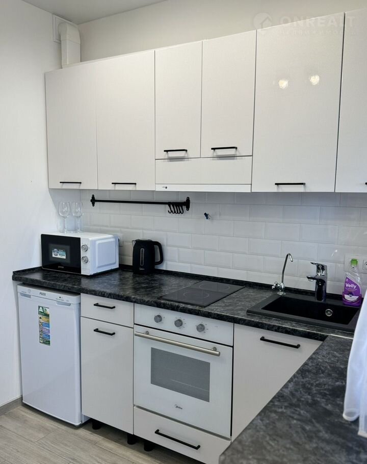 кухня с индукционной печью, микроволновкой, электрочайником, холодильником и всей необходимой посудой
