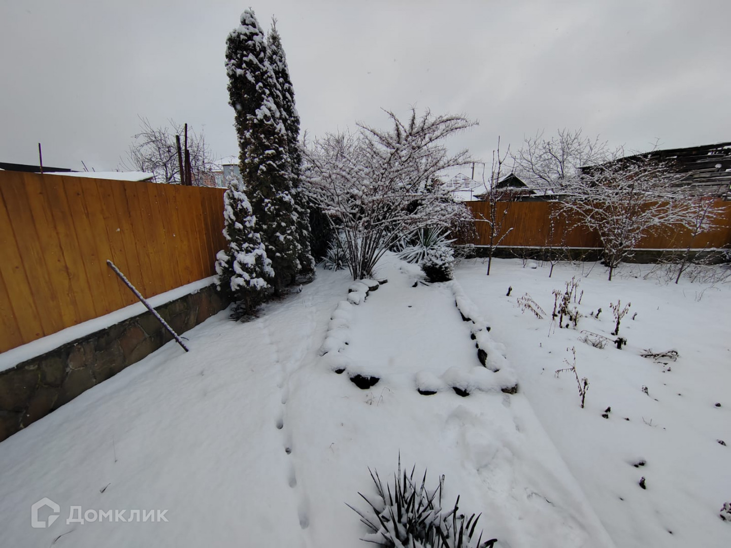 В саду несколько фруктовых деревьев маленький пруд в котором плавают караси и водопадик навес где по утрам можно пить кофе.