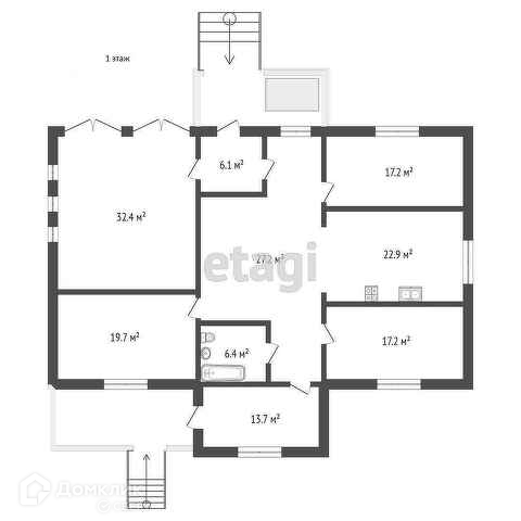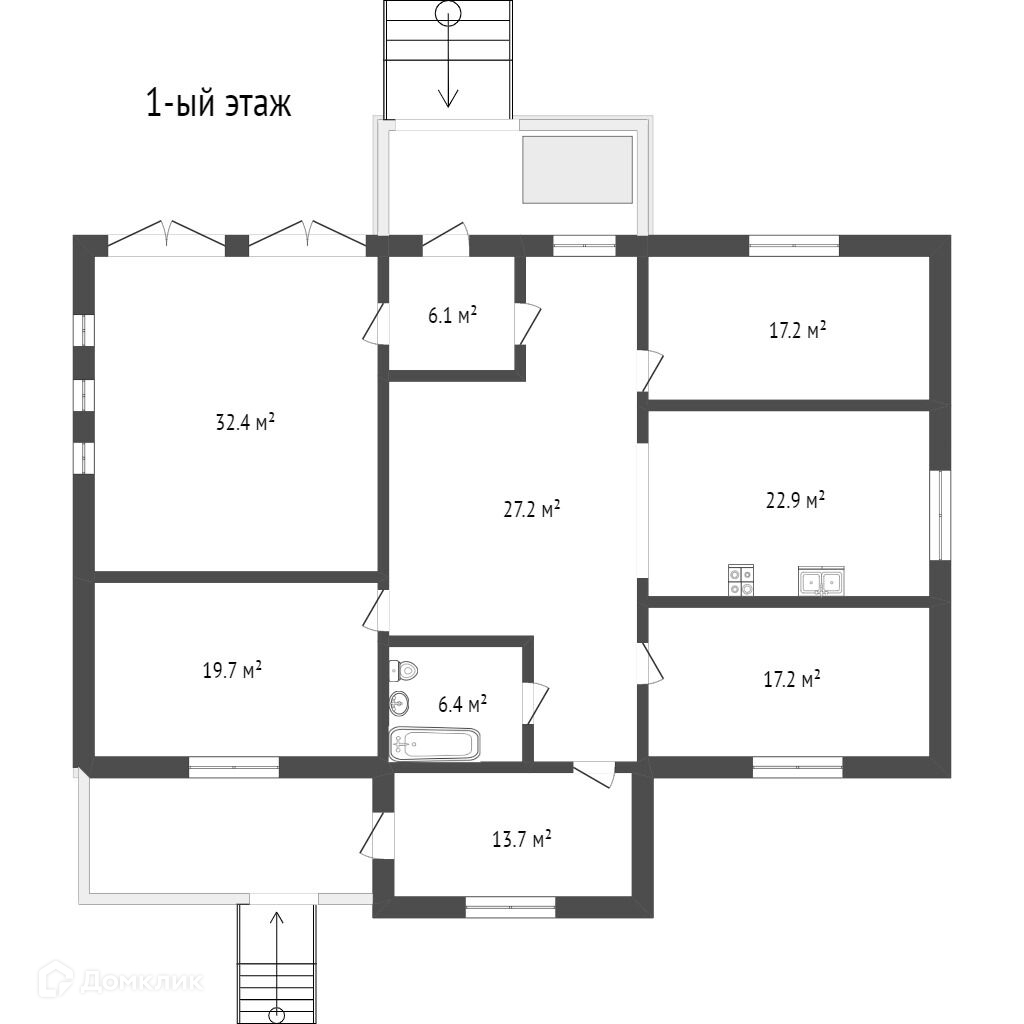 1. Первый этаж: гостиная, три спальни, кухня, ванная комната, две прихожие, гараж на два автомобиля, летняя веранда, крыльцо.