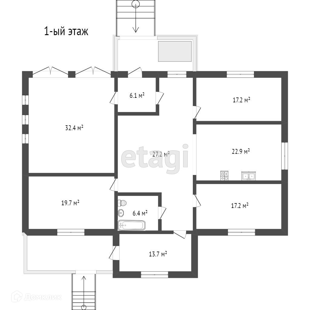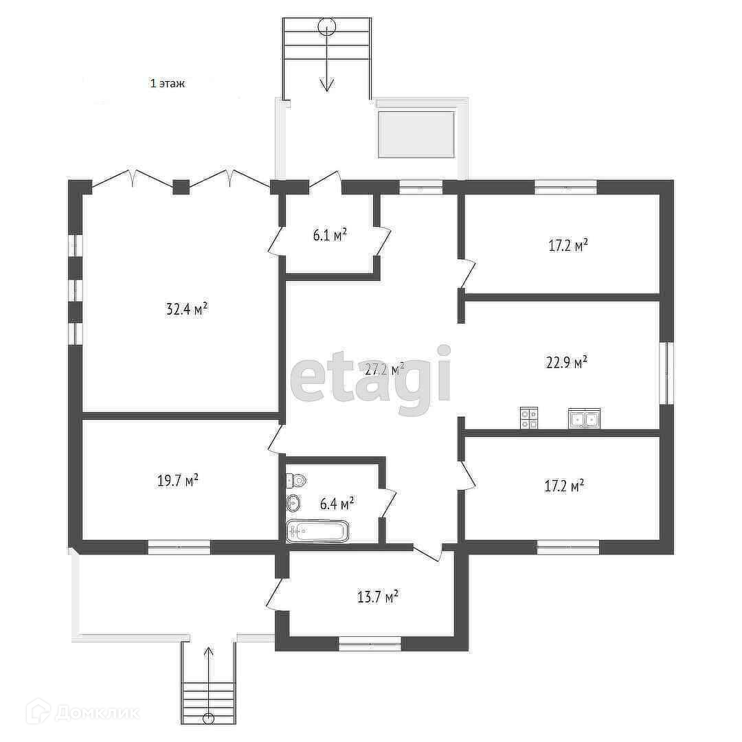 1. Первый этаж: гостиная, три спальни, кухня, ванная комната, две прихожие, гараж на два автомобиля, летняя веранда, крыльцо.