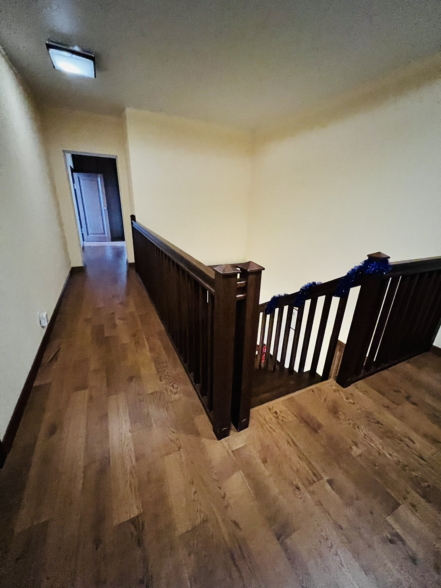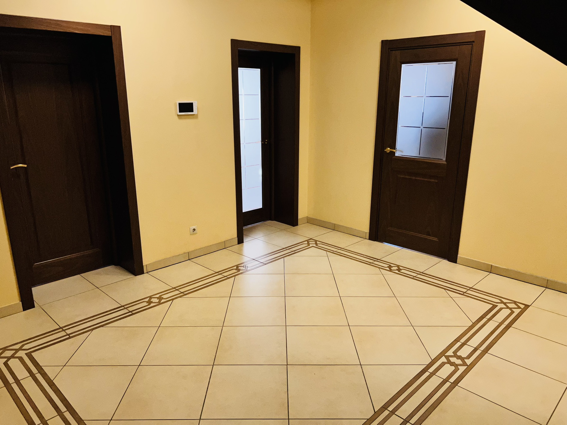 Установлен домофон. Широкий лестничный марш. Лестница выполнена из массива дуба.