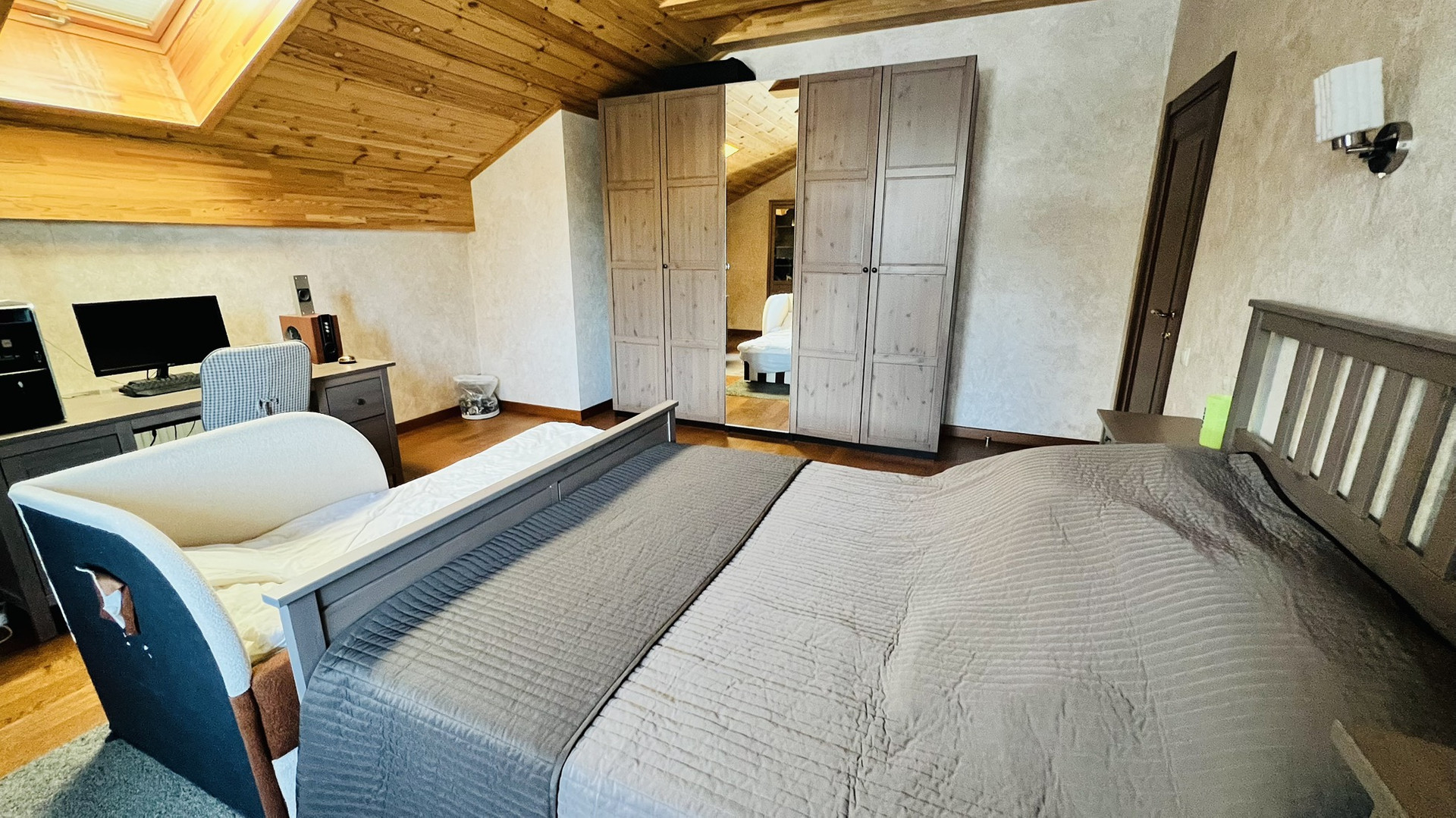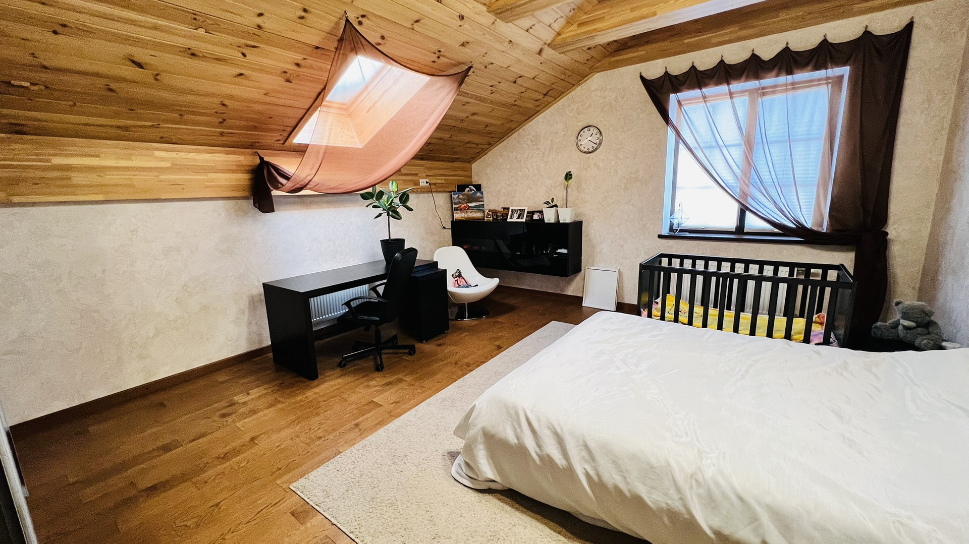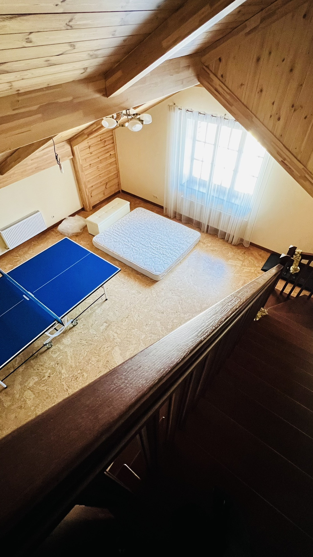 Третий этаж мансардный , оборудован под рабочий кабинет и зону отдыха. Отделка полов и стен - дерево.