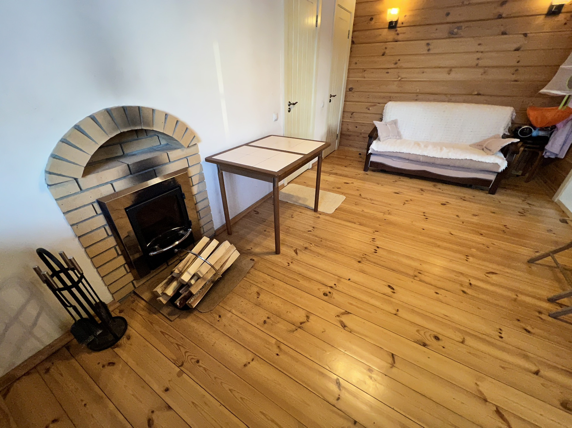 кухня-столовая, гостиная с камином (чугунная топка) и панорамным окном.