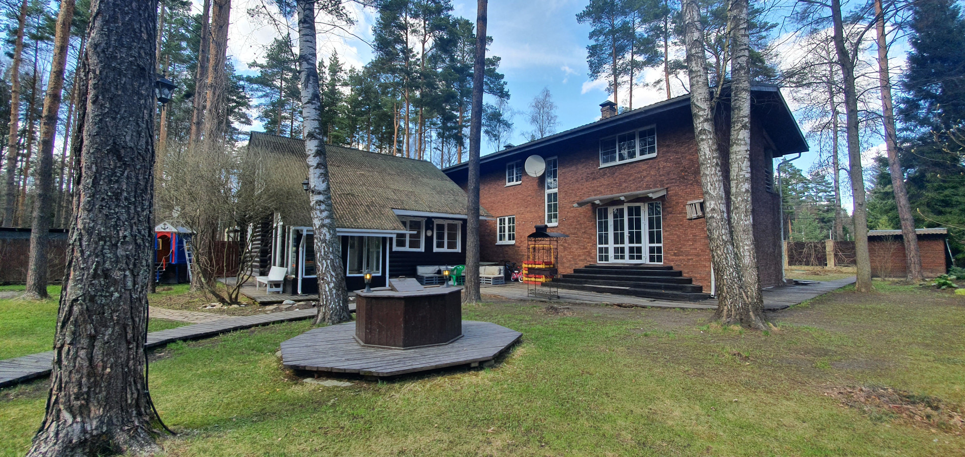 На участке 12,5 соток, прилегающим к лесу, расположены 2 дома, полностью автономных, удобных и готовых к проживанию в прекрасном поселке, расположенном в хвойном лесу, вдали от городской суеты. 80% владельцев домов проживают круглогодично.