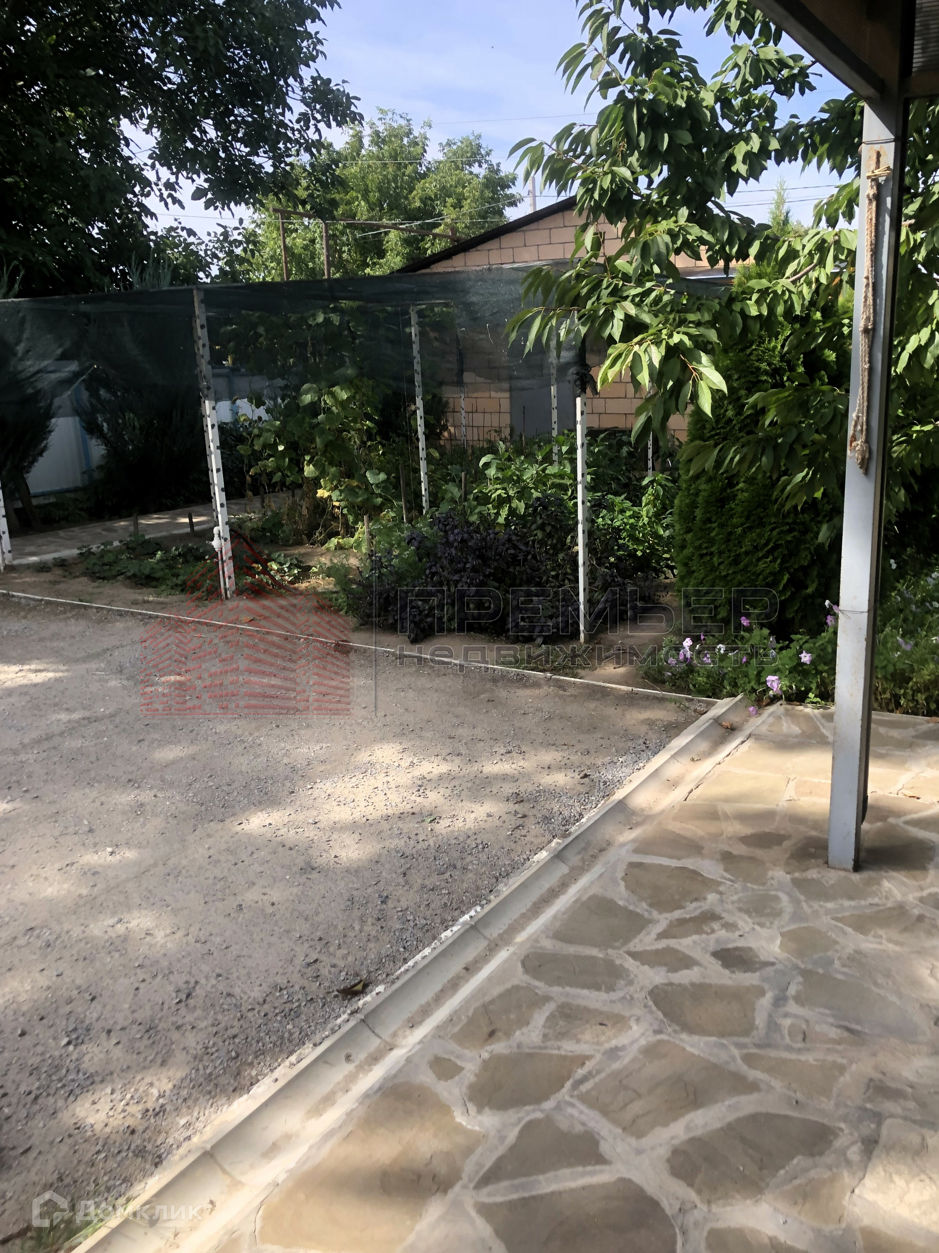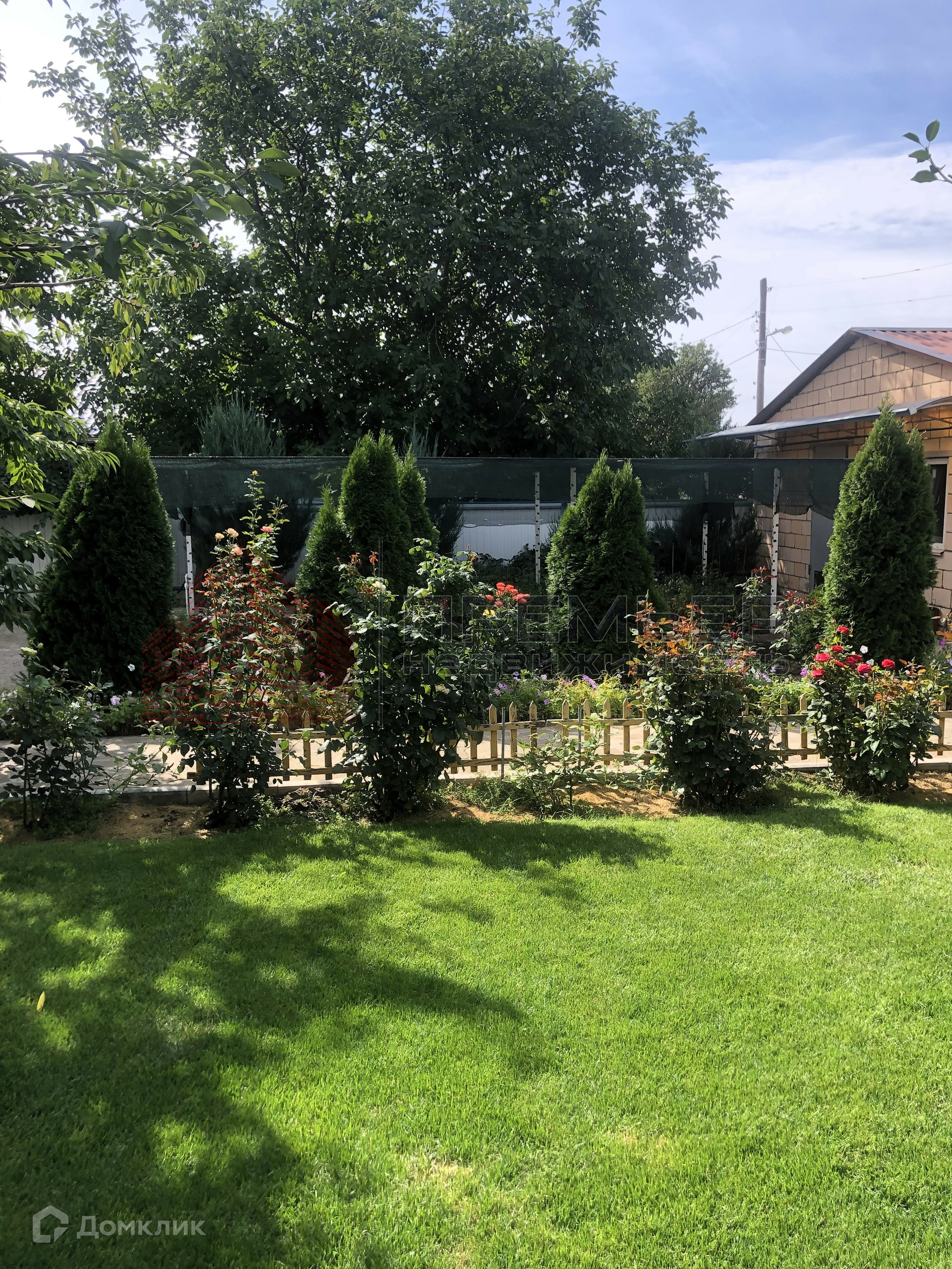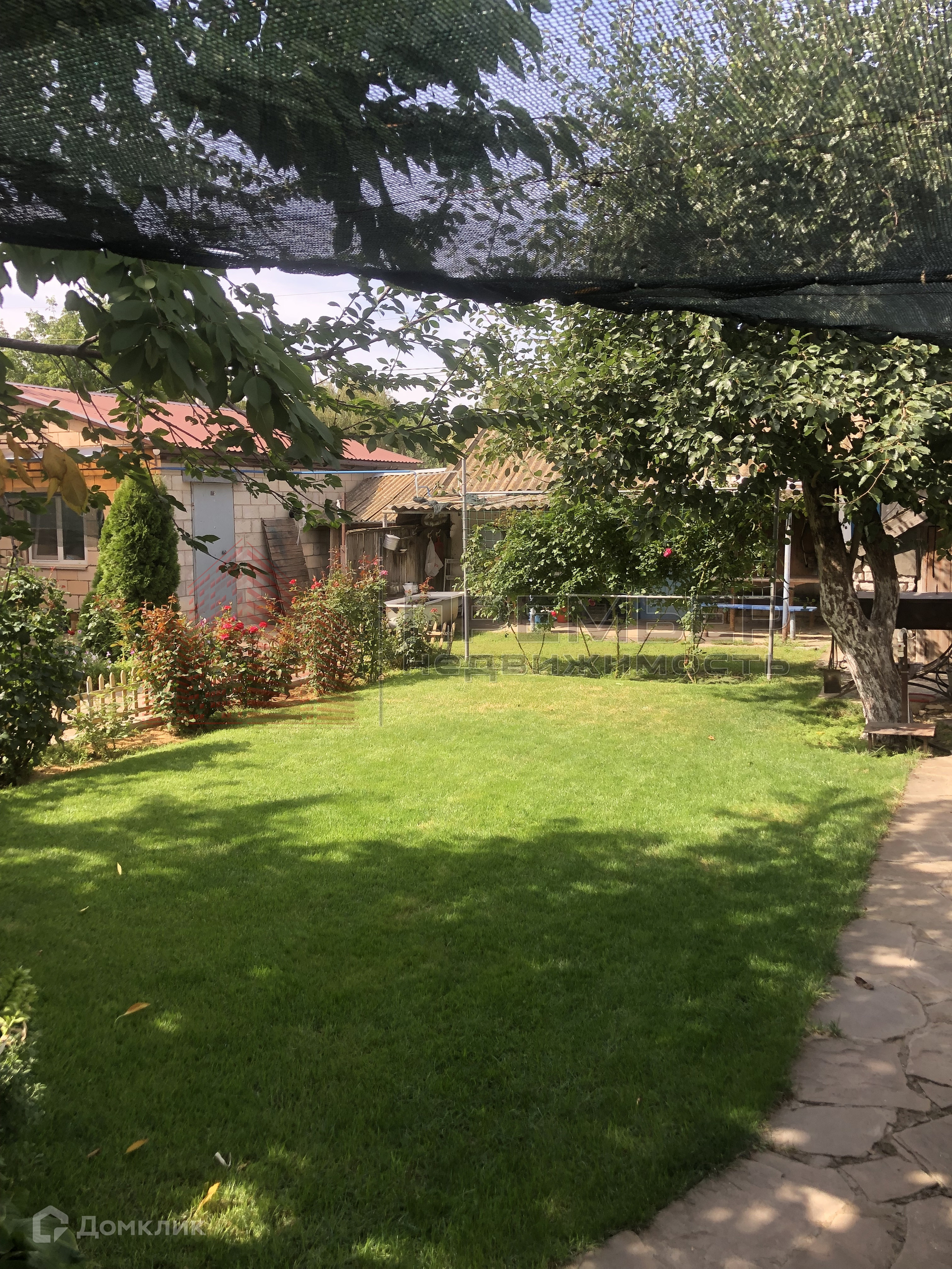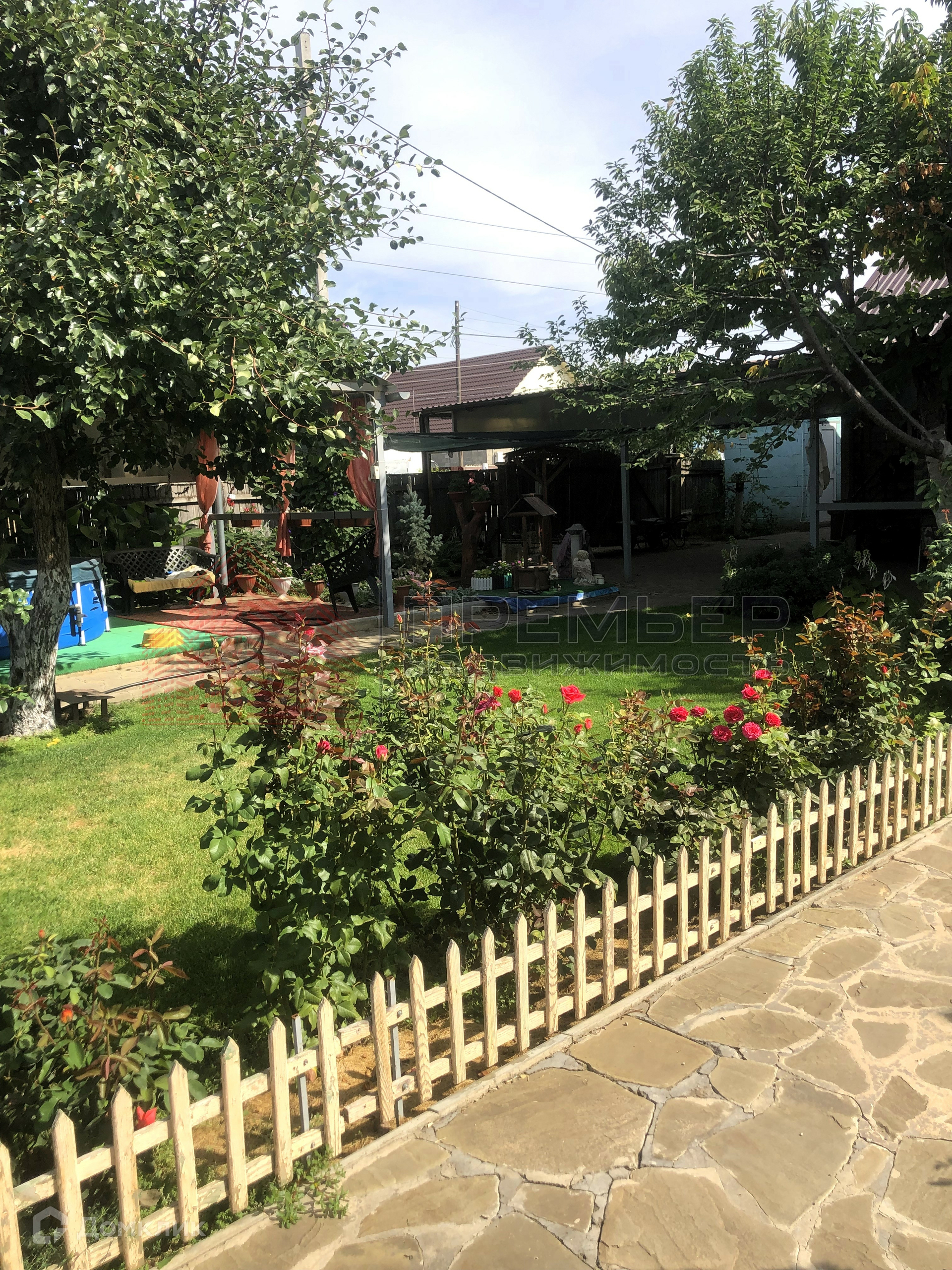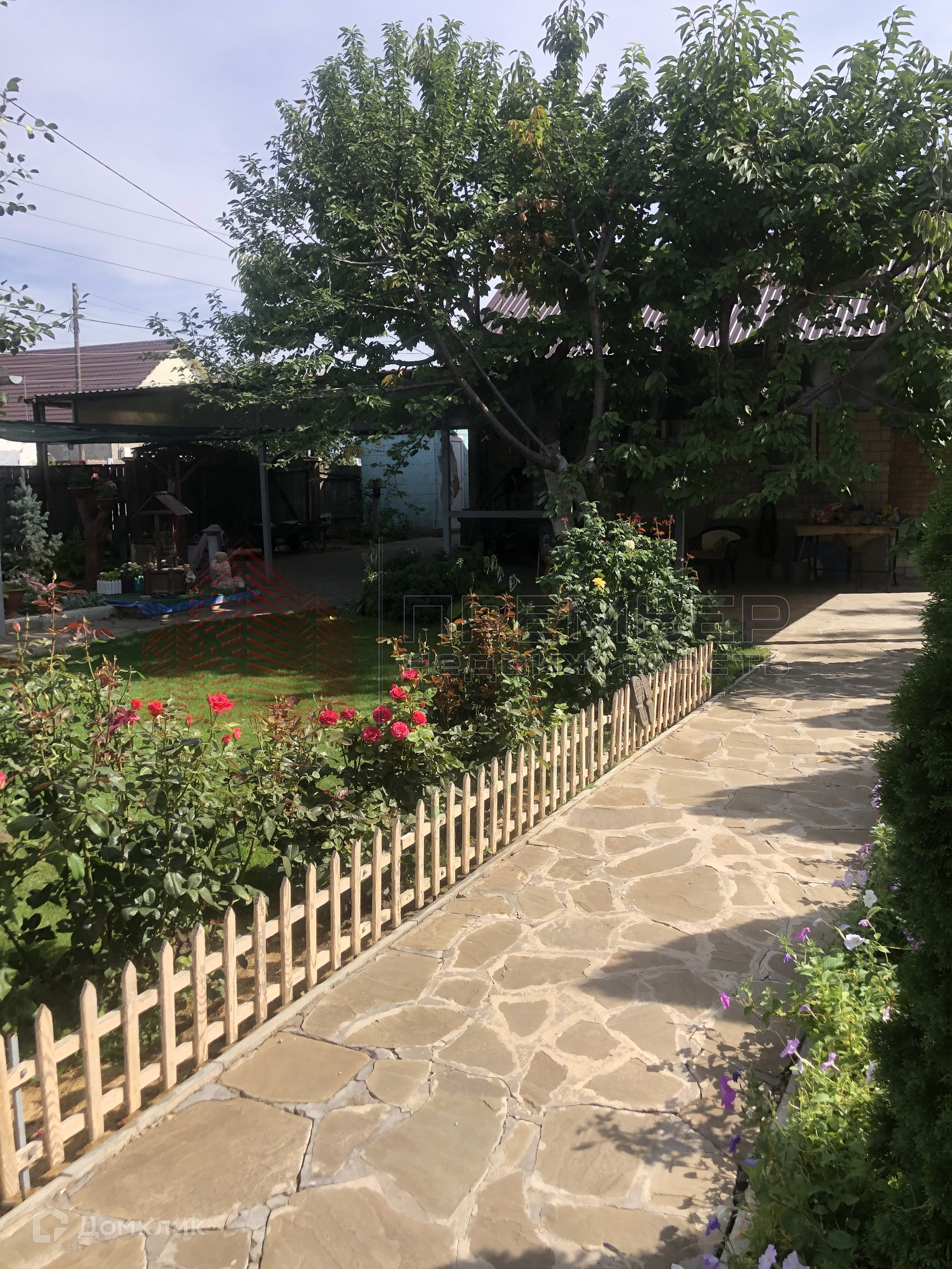 Облагороженный двор . Застелен натуральным камнем - пластушка . Освещение  . Установлена летняя кухня с газом . Во дворе навес и два гаража ( один большой на 3 машины) . Ворота для въезда в гараж открываются с пульта . Под навесом подготовленная площадка для бассейна . Скважина и колодец , поливные трубы закопаны в землю , что избавляет вас от шлангов на участке . Засеян  газон, растут туи и молодые плодовые деревья . На территории участка кирпичный хоз.блок и баня ( не достроенная ) . 3 фазы электричества подключены к новой линии электропередач .