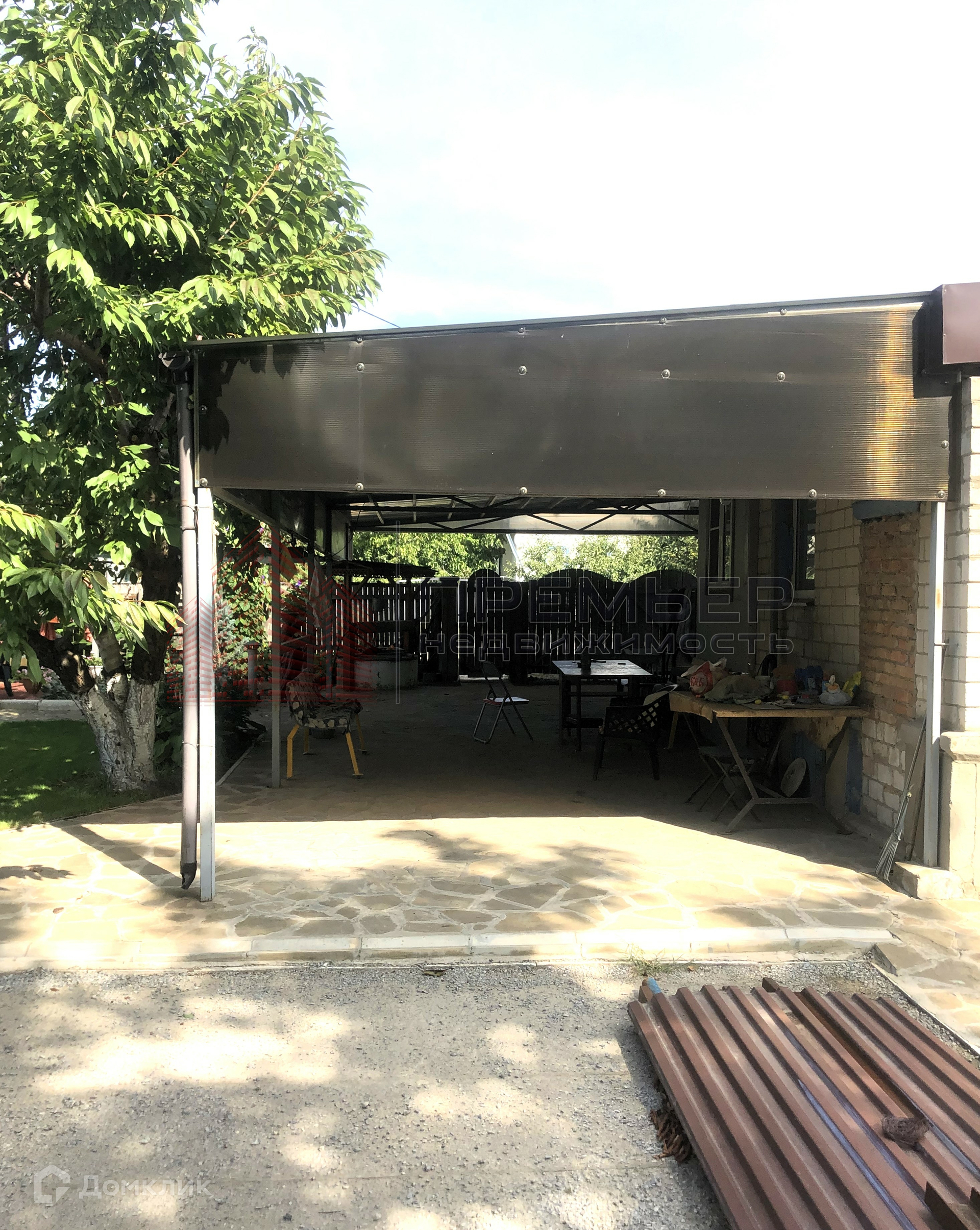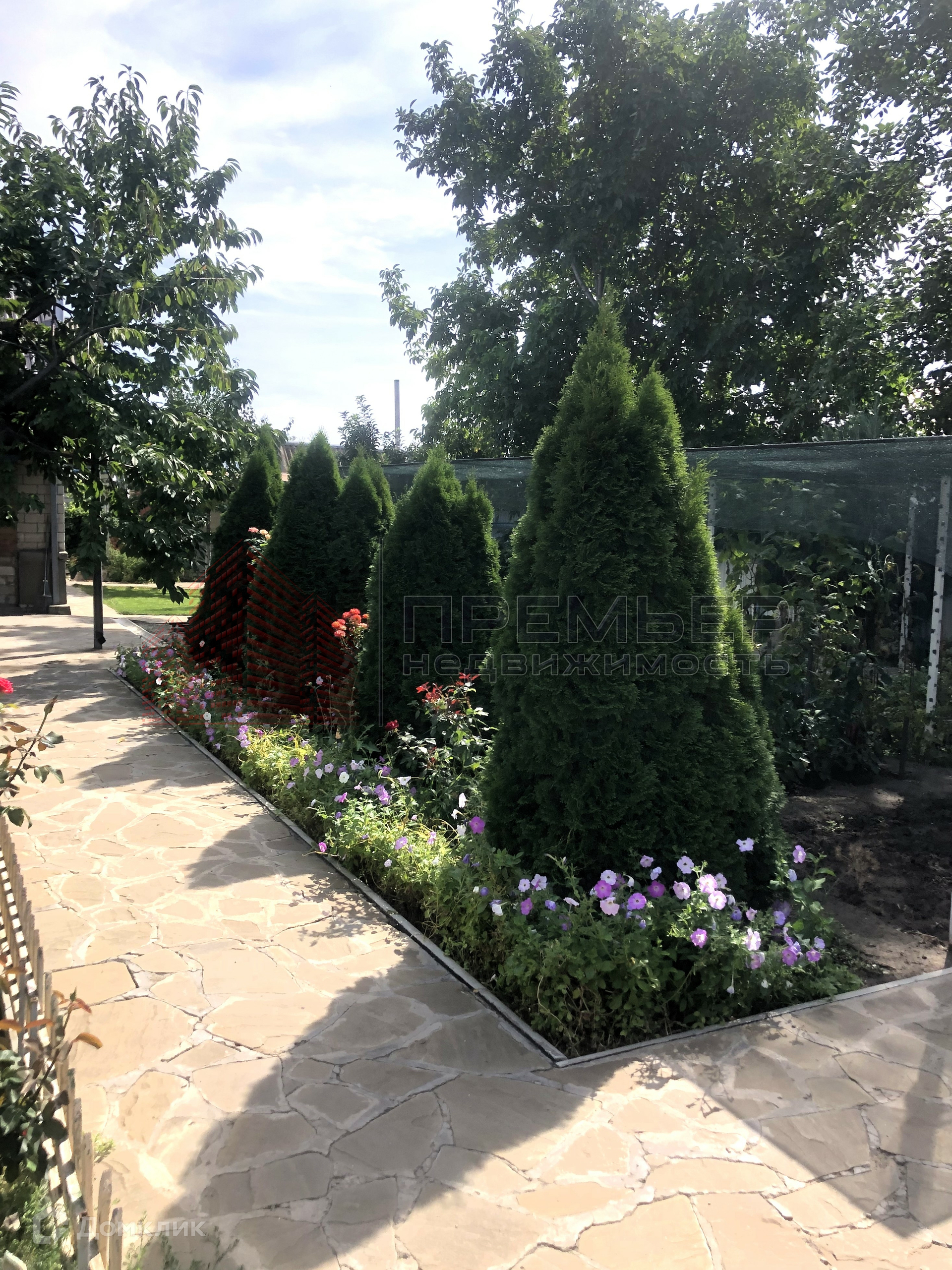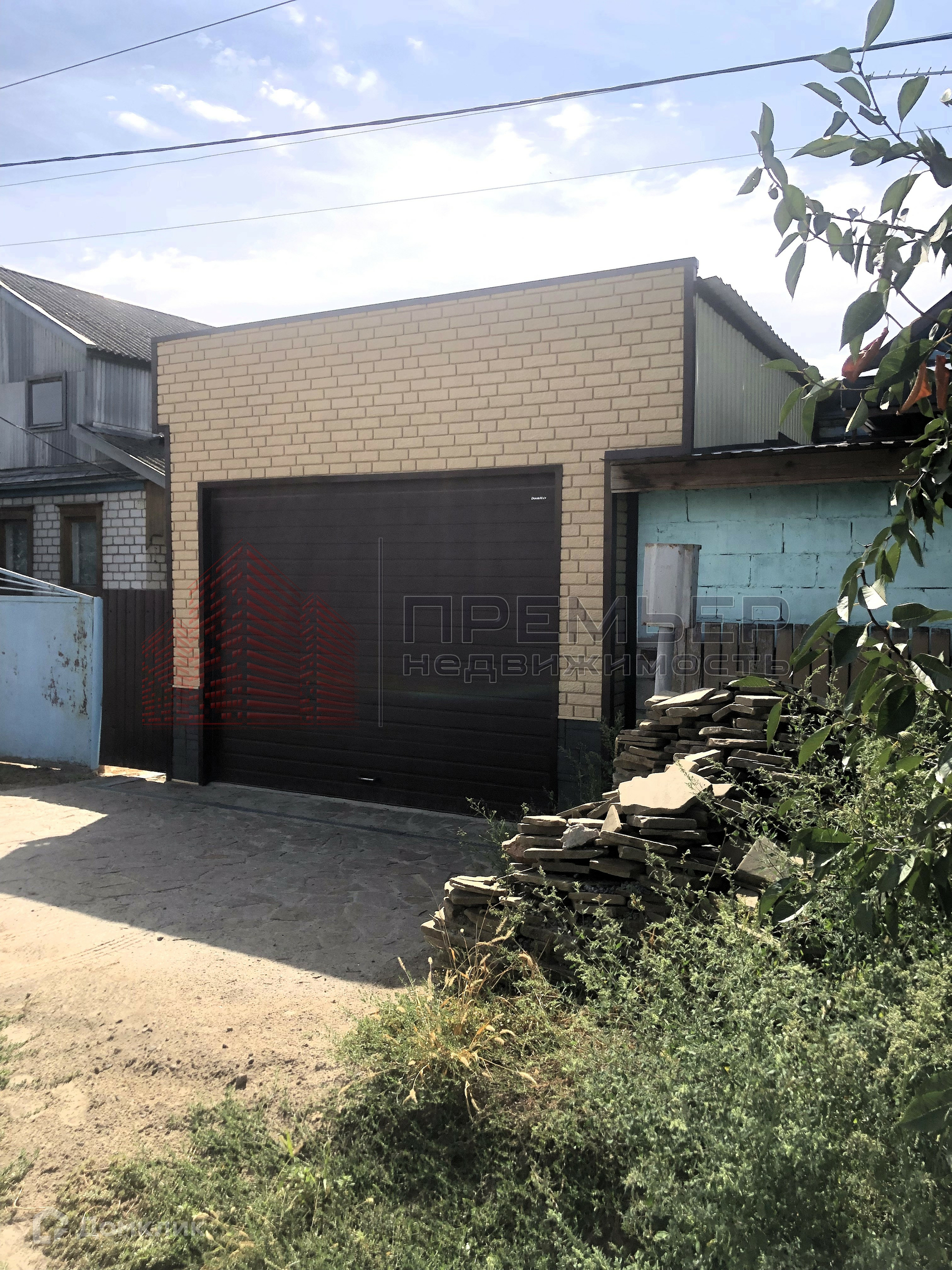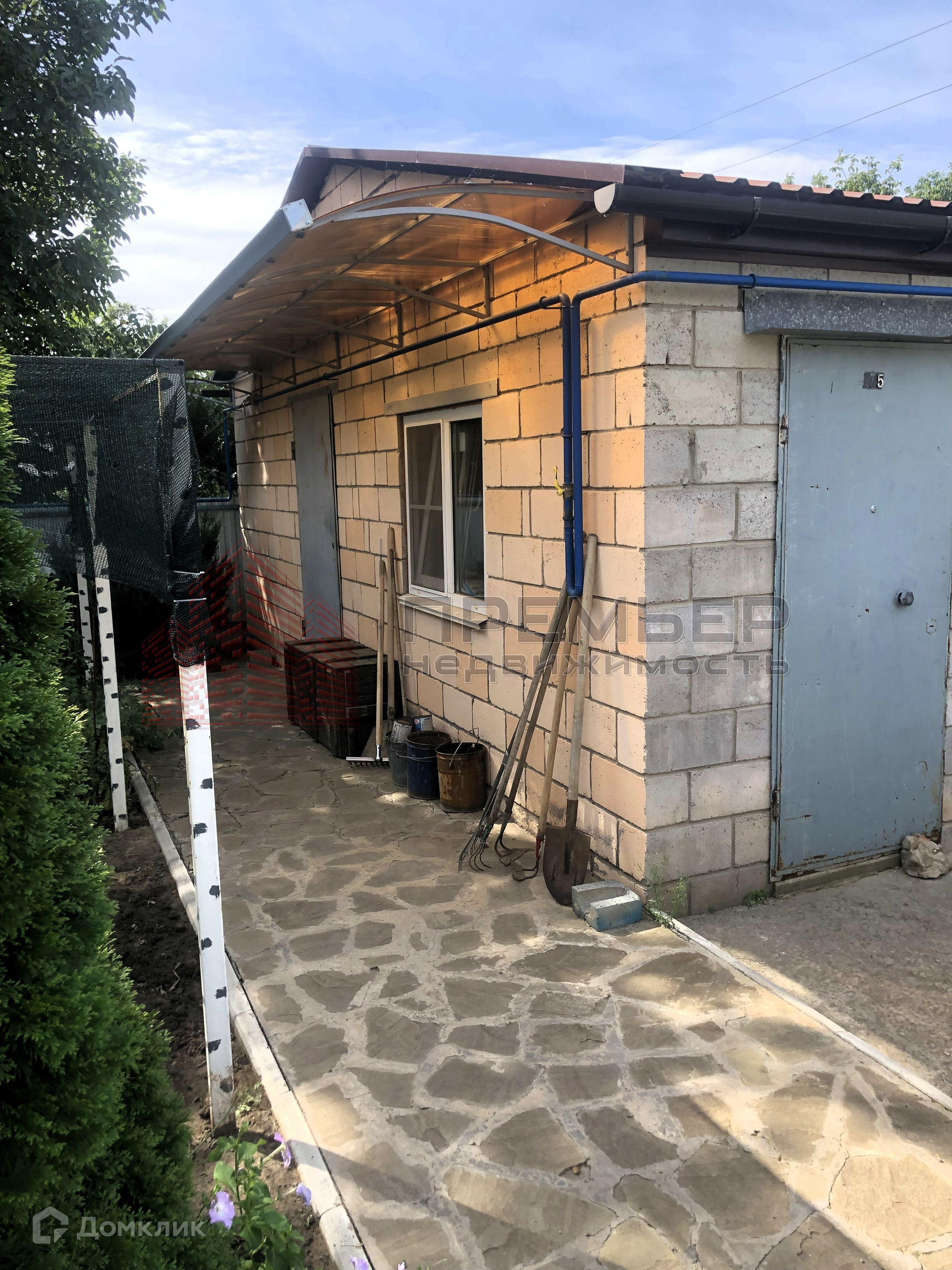 Облагороженный двор . Застелен натуральным камнем - пластушка . Освещение  . Установлена летняя кухня с газом . Во дворе навес и два гаража ( один большой на 3 машины) . Ворота для въезда в гараж открываются с пульта . Под навесом подготовленная площадка для бассейна . Скважина и колодец , поливные трубы закопаны в землю , что избавляет вас от шлангов на участке . Засеян  газон, растут туи и молодые плодовые деревья . На территории участка кирпичный хоз.блок и баня ( не достроенная ) . 3 фазы электричества подключены к новой линии электропередач .