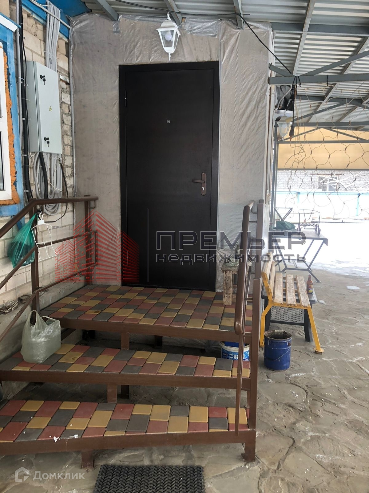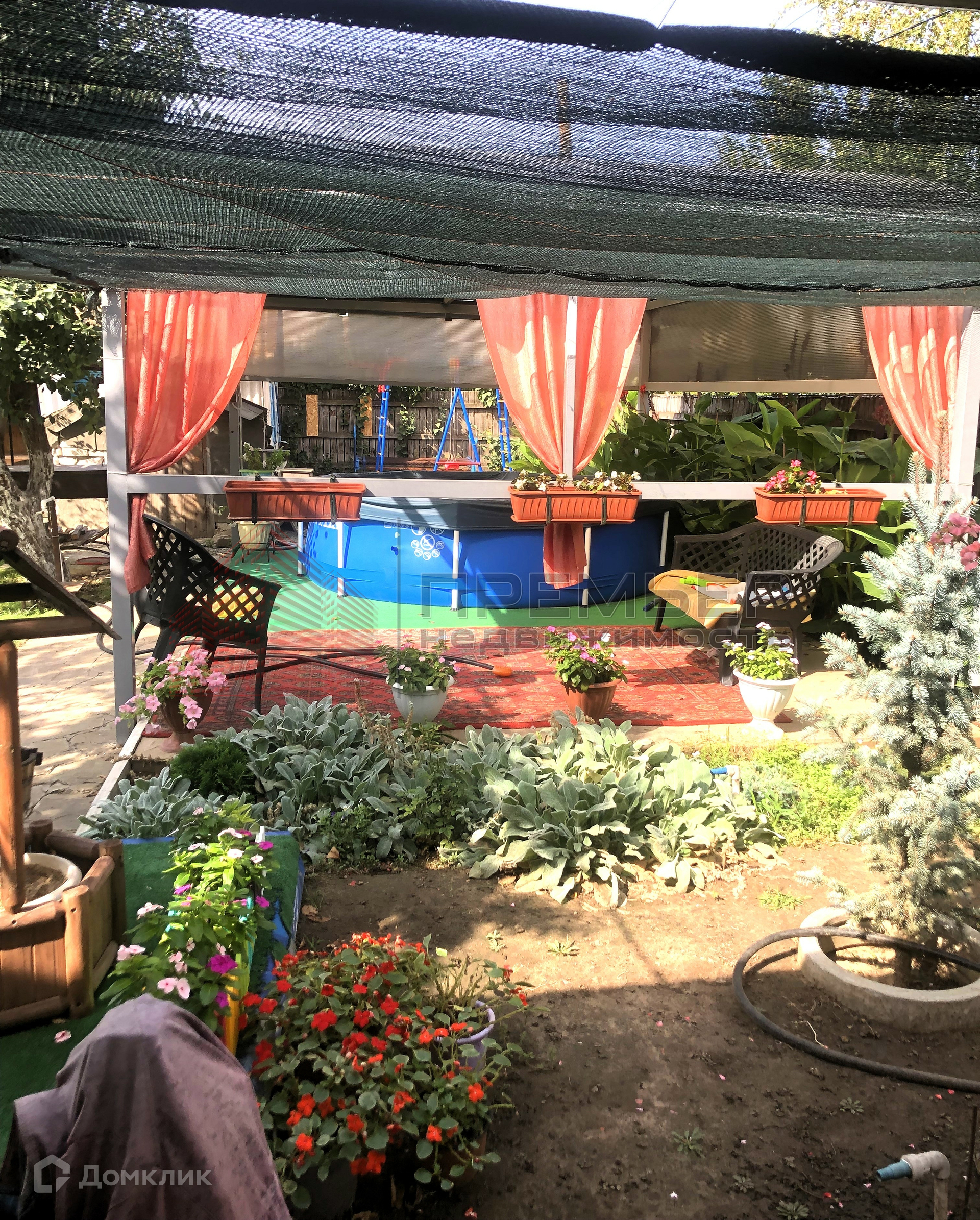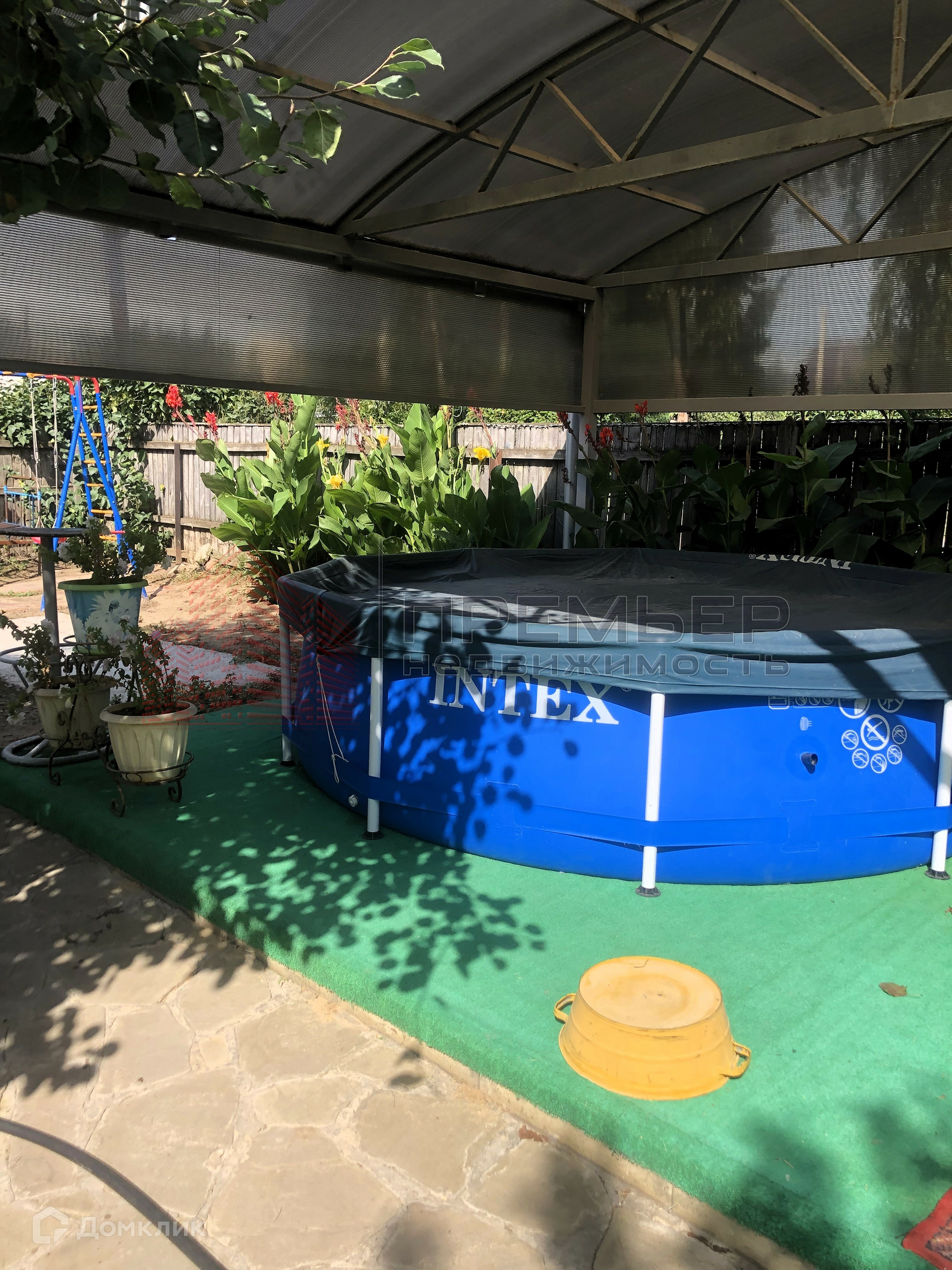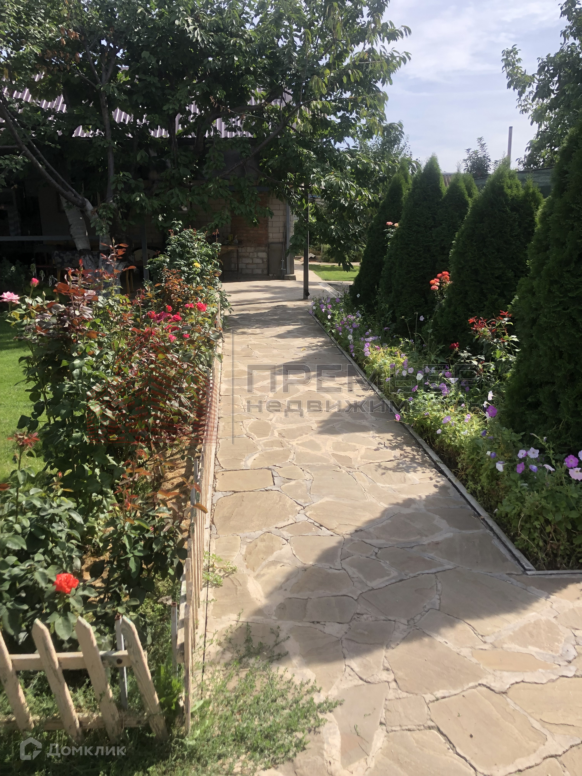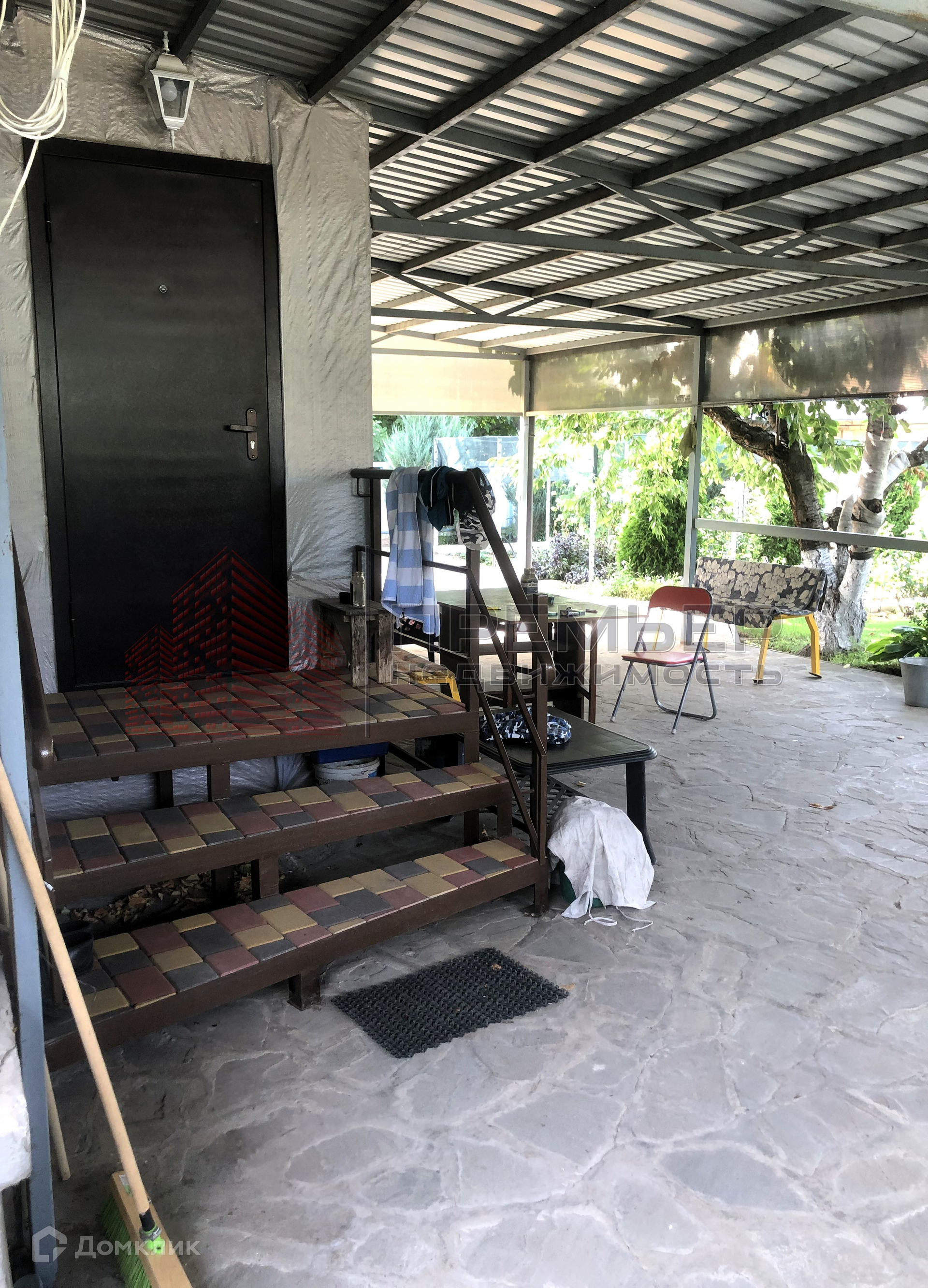 Облагороженный двор . Застелен натуральным камнем - пластушка . Освещение  . Установлена летняя кухня с газом . Во дворе навес и два гаража ( один большой на 3 машины) . Ворота для въезда в гараж открываются с пульта . Под навесом подготовленная площадка для бассейна . Скважина и колодец , поливные трубы закопаны в землю , что избавляет вас от шлангов на участке . Засеян  газон, растут туи и молодые плодовые деревья . На территории участка кирпичный хоз.блок и баня ( не достроенная ) . 3 фазы электричества подключены к новой линии электропередач .