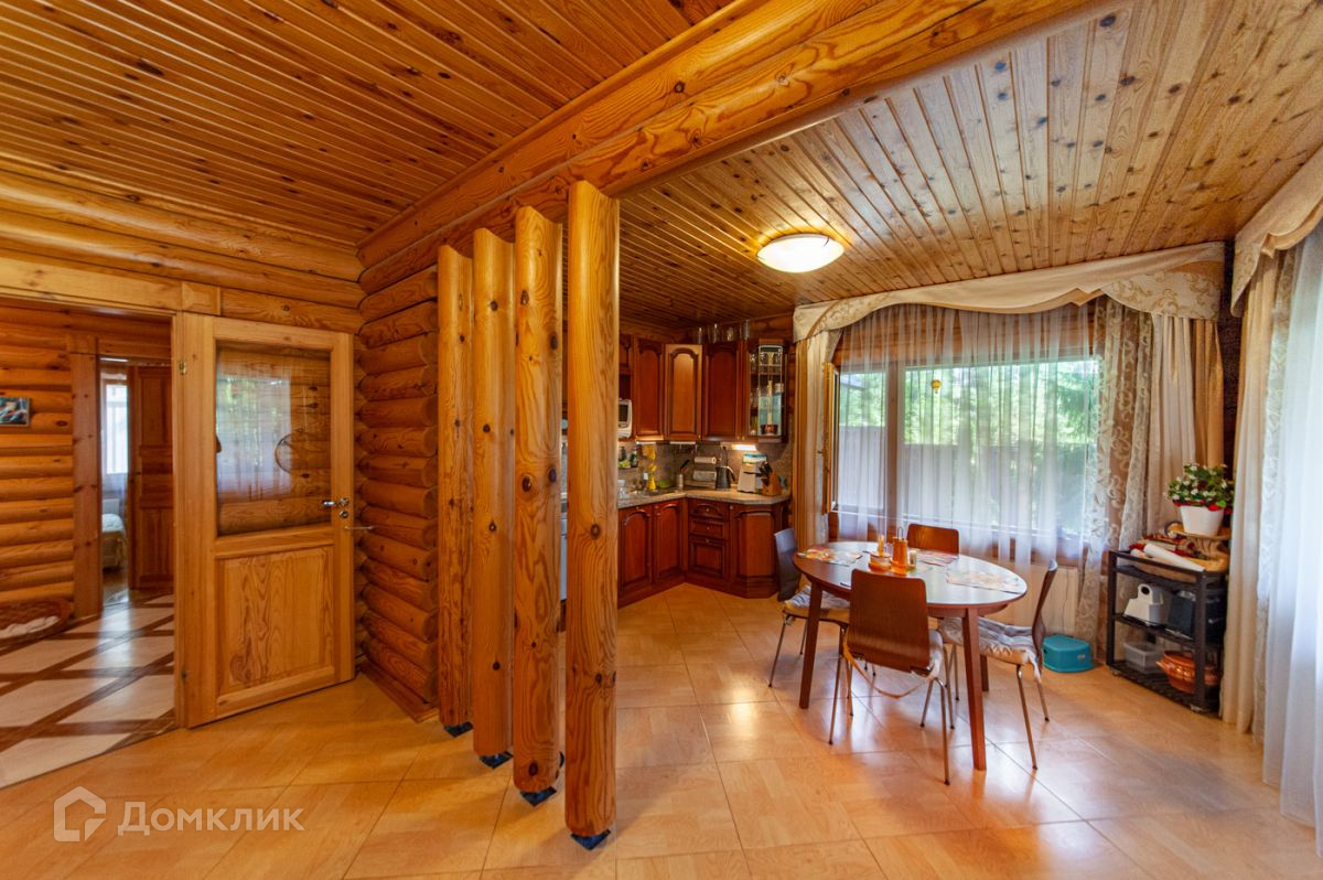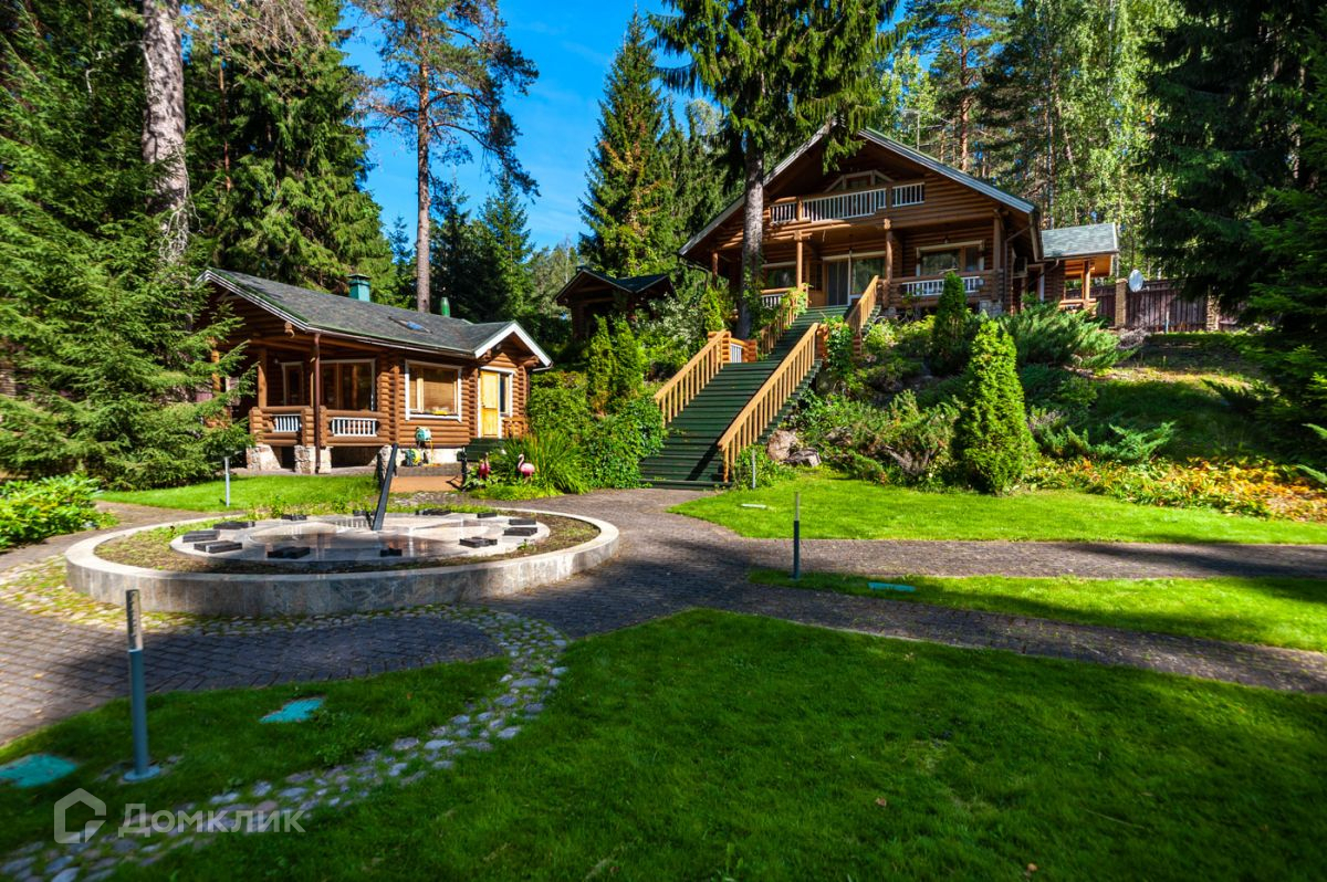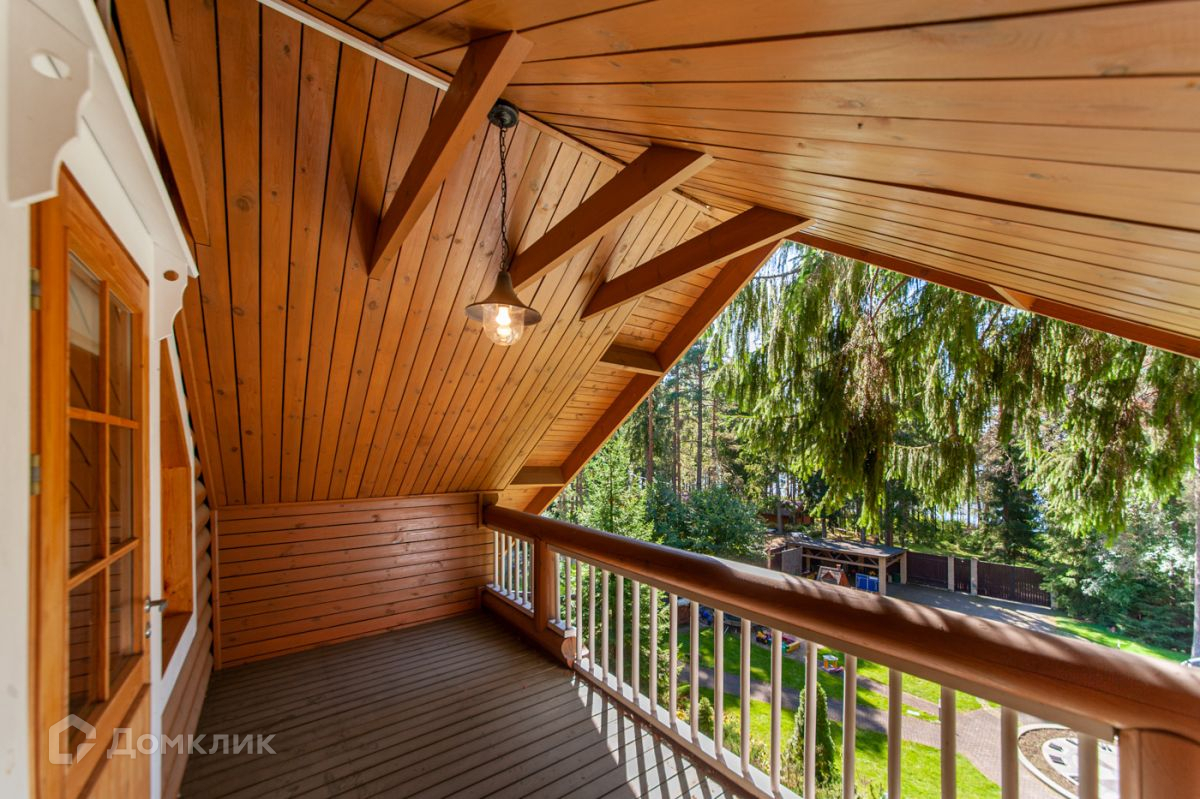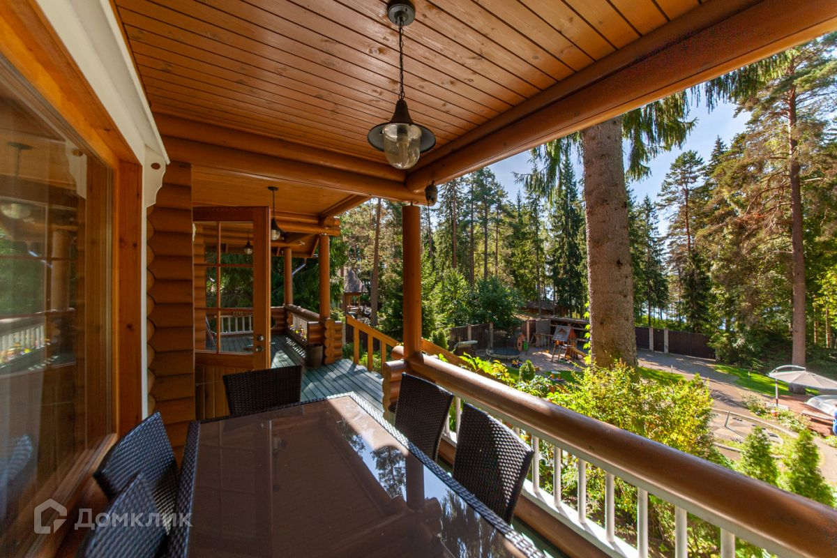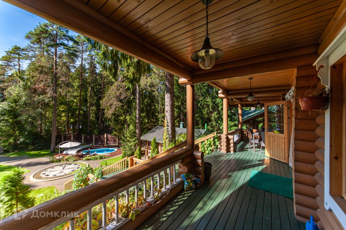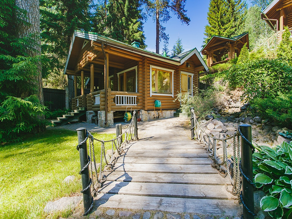Дом построен из калиброванного бревна, стоит на возвышенности. С террасы, окон гостиной и спальни на втором этаже открывается панорамный вид на участок и озеро.