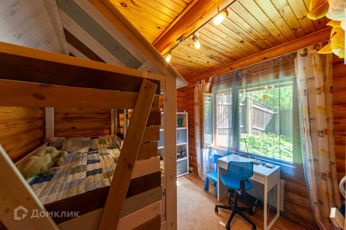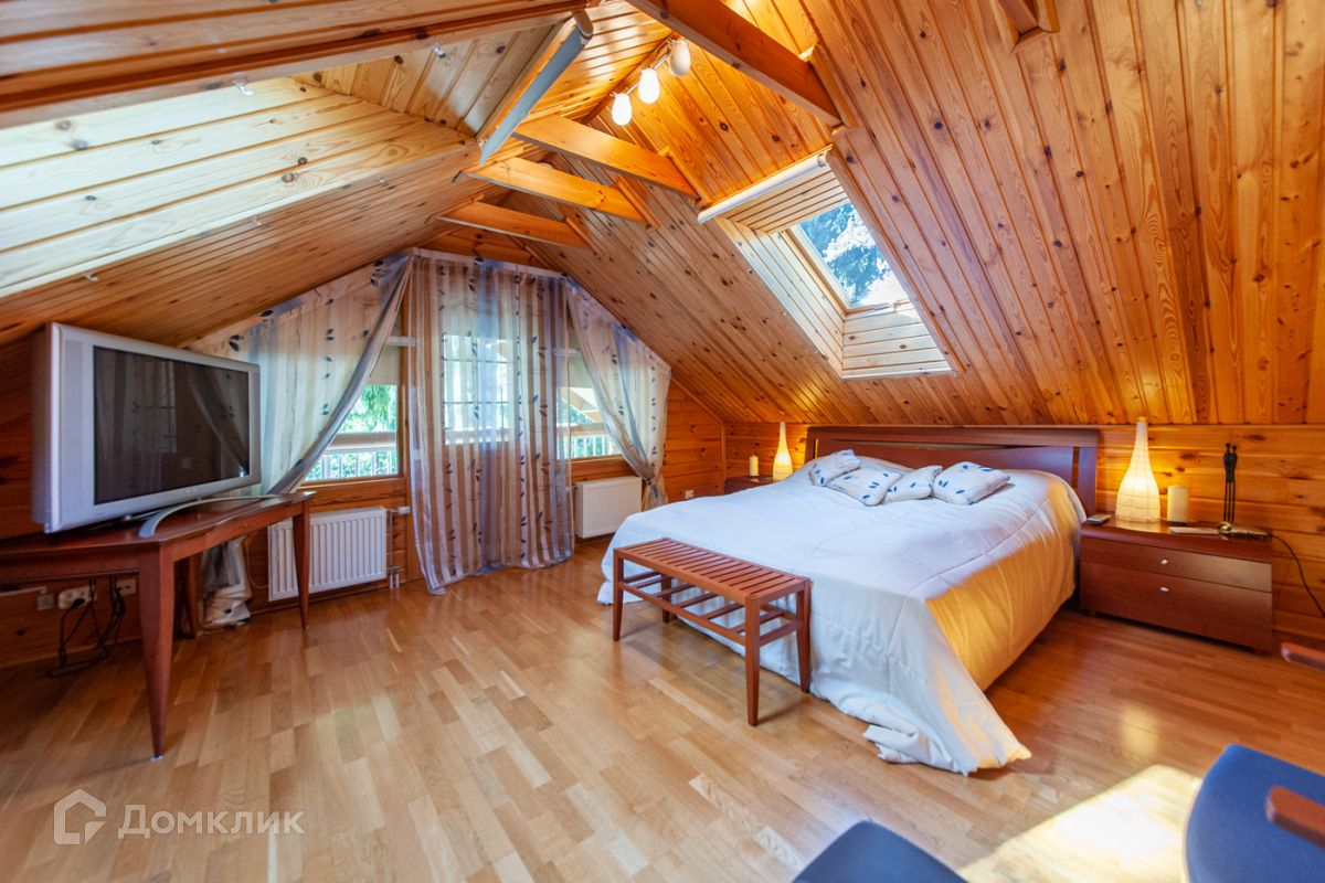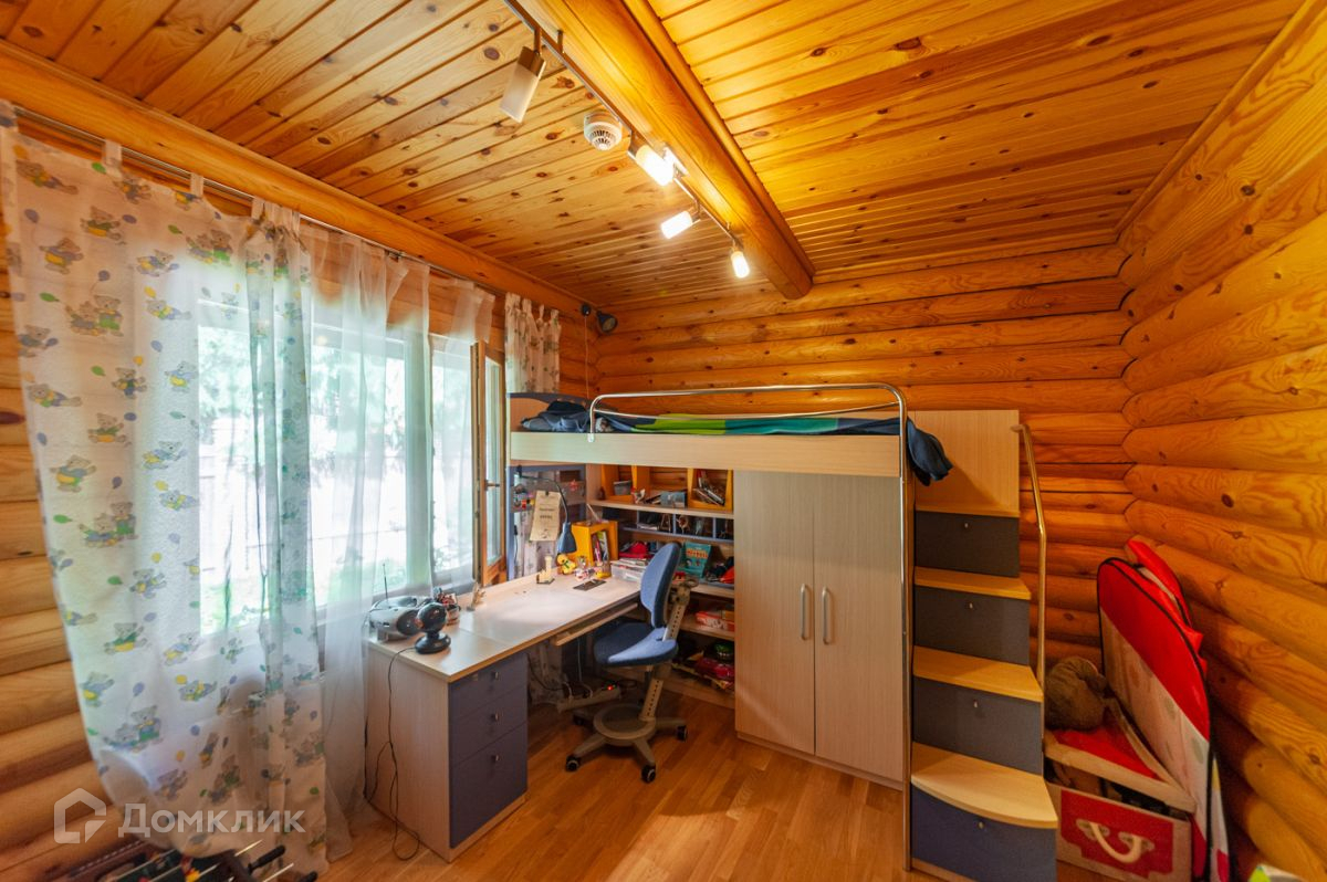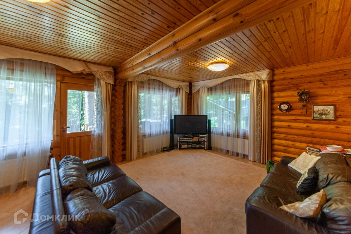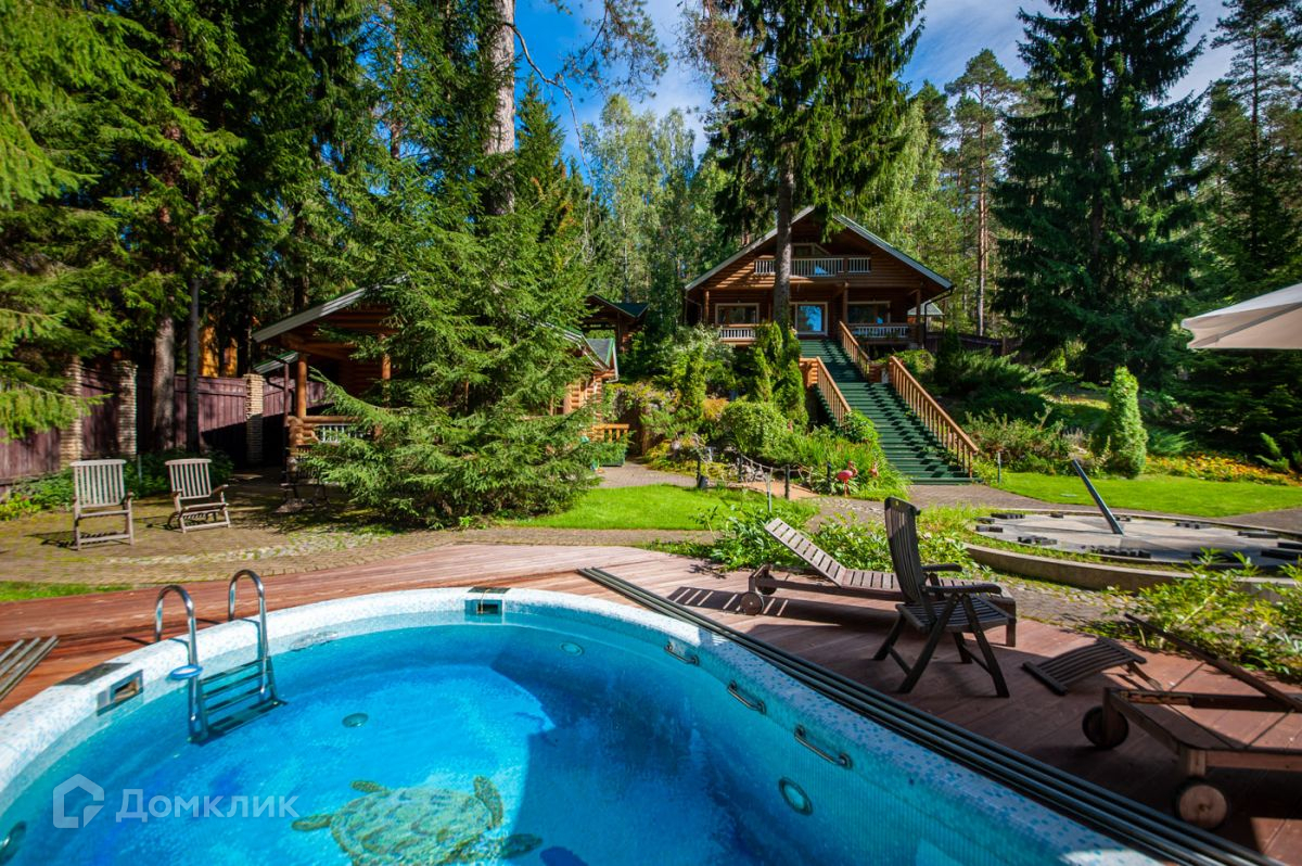 Дом построен из калиброванного бревна, стоит на возвышенности. С террасы, окон гостиной и спальни на втором этаже открывается панорамный вид на участок и озеро.