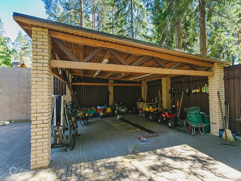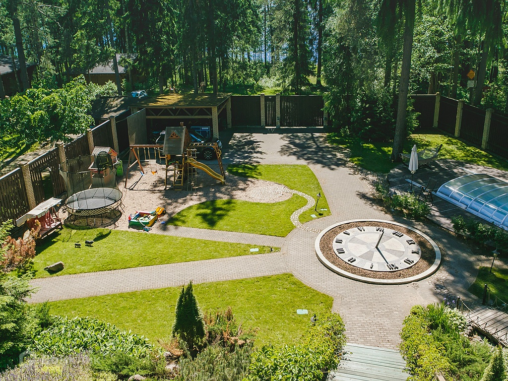 На территории выполнен ландшафтный дизайн с освещением и озеленением территории, установлен бассейн с подогреваемой водой. Также построен навес на 2 м/м.
