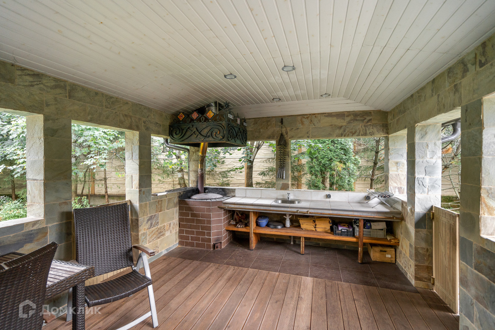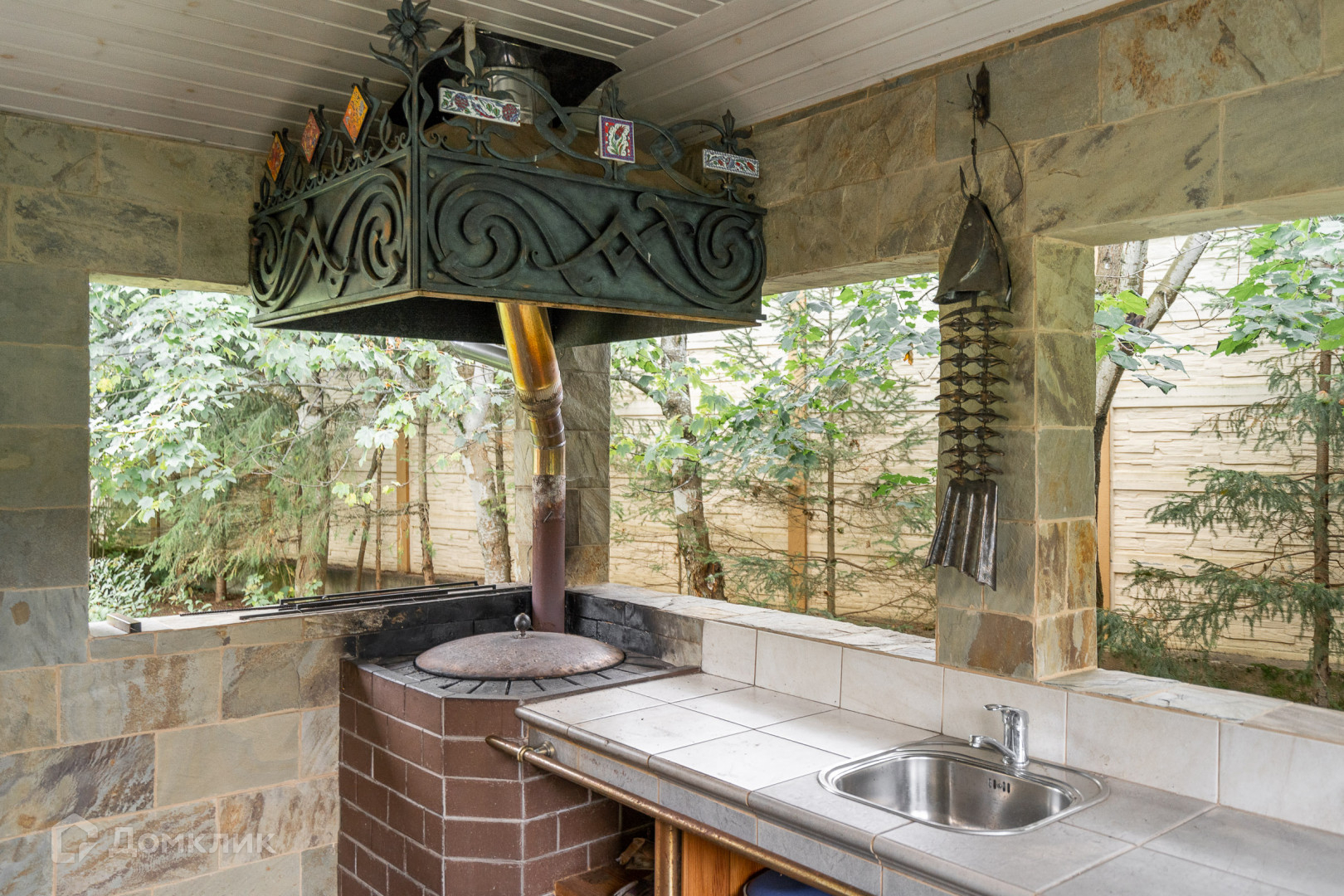 Открытая веранда с летней кухней, в которой установлен тандыр. Есть зона барбекю. Летняя кухня украшена художественными кованными изделиями. Особое внимание на себя обращает кованный зонтик и скульптура рыбы.