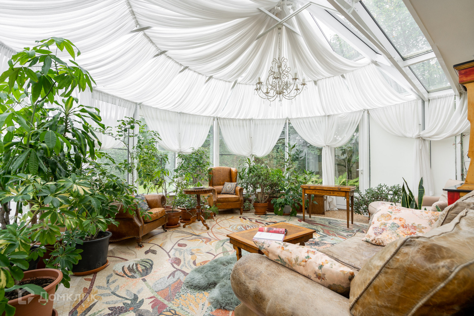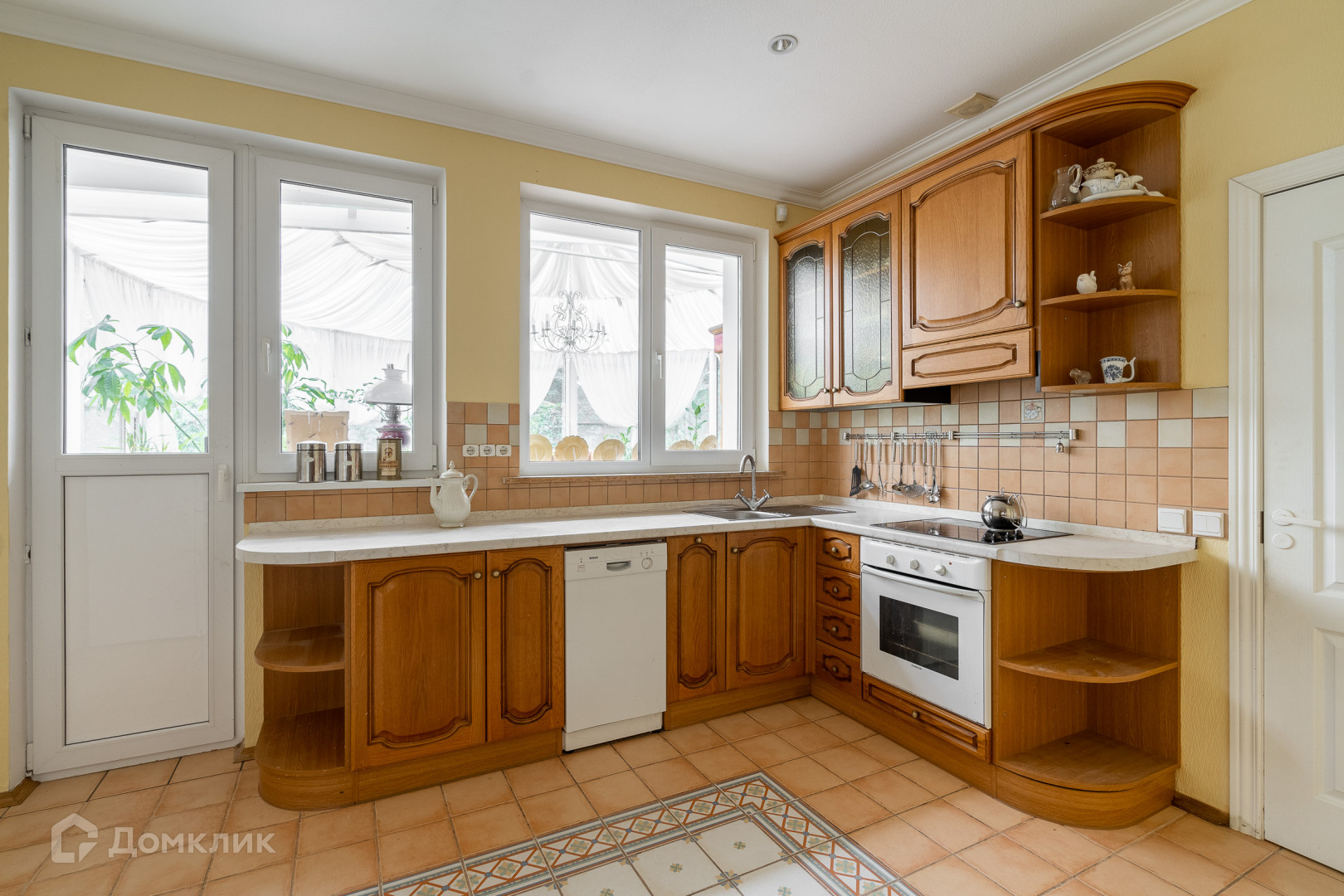 Кухня с выходом в зимний сад - застекленная просторная веранда 35 кв. м с мозаичным полом, окна "Века" отлично держат тепло. Кухня оборудована всей необходимой бытовой техникой.