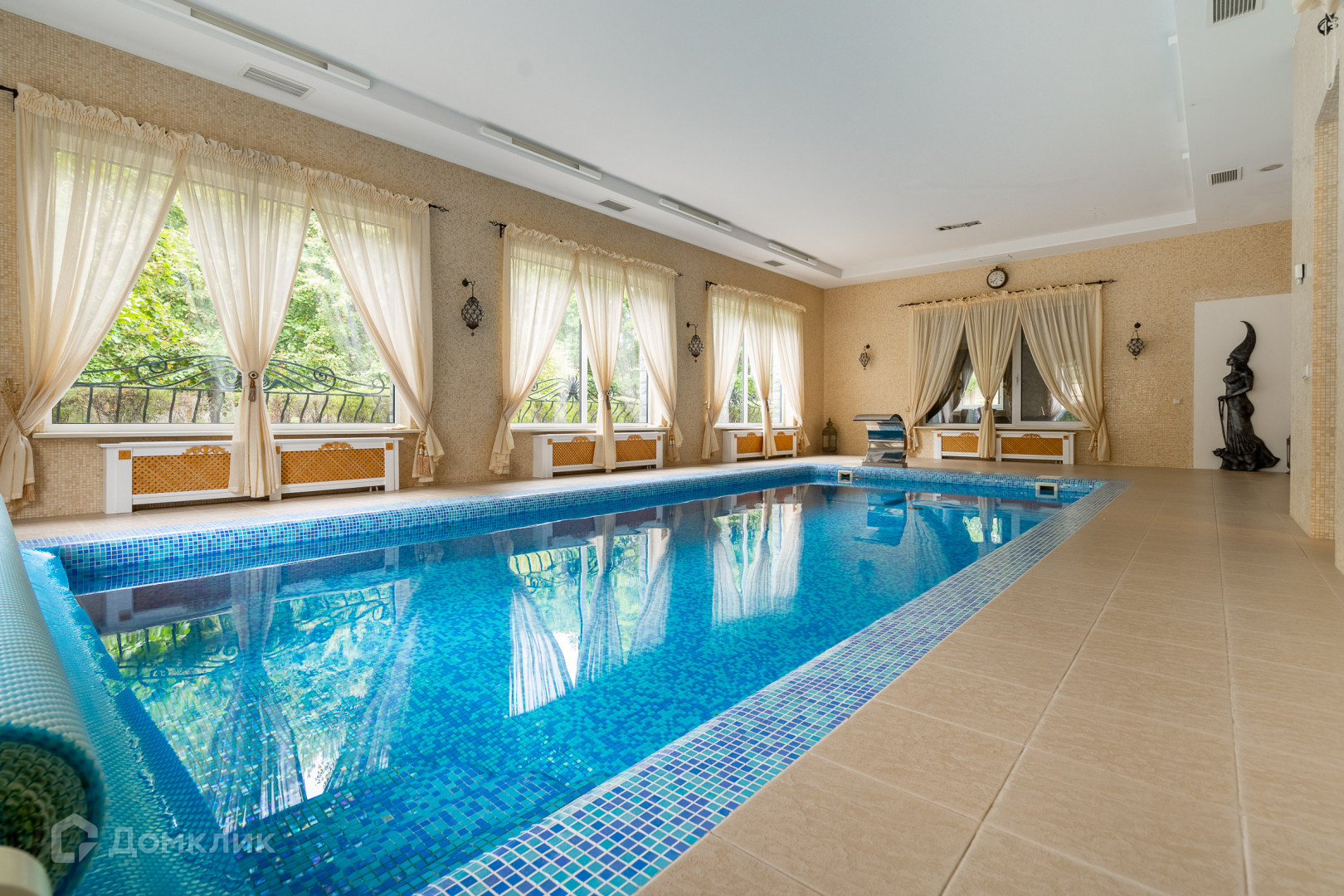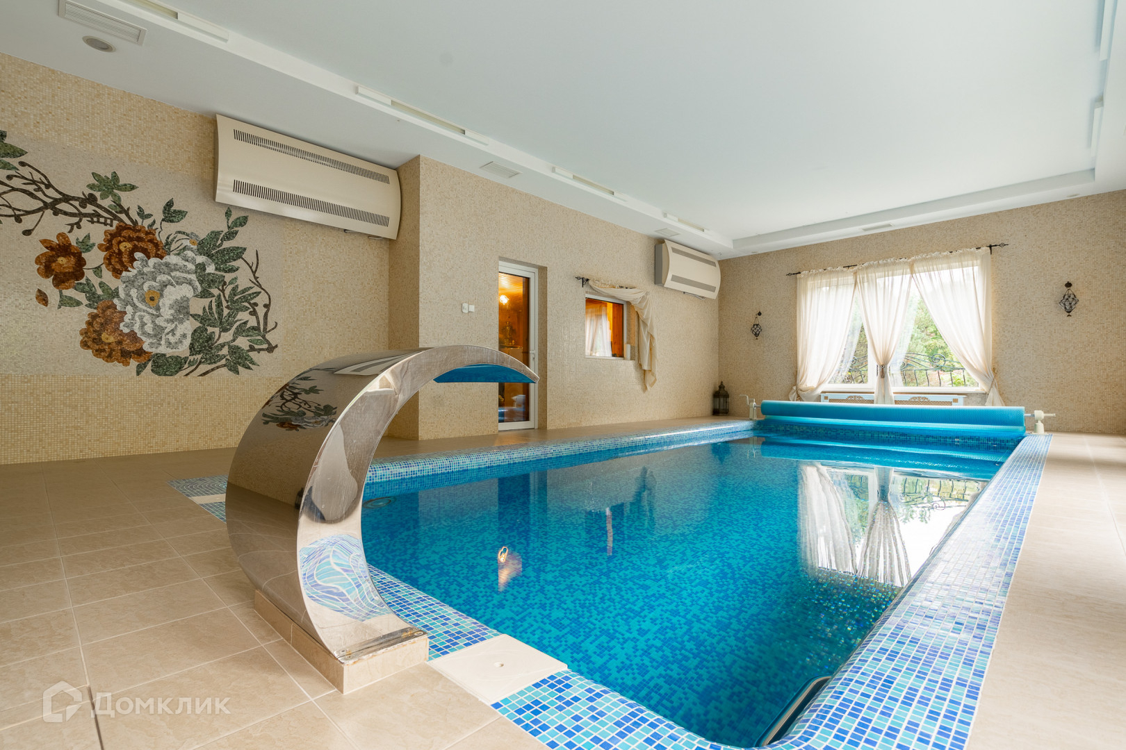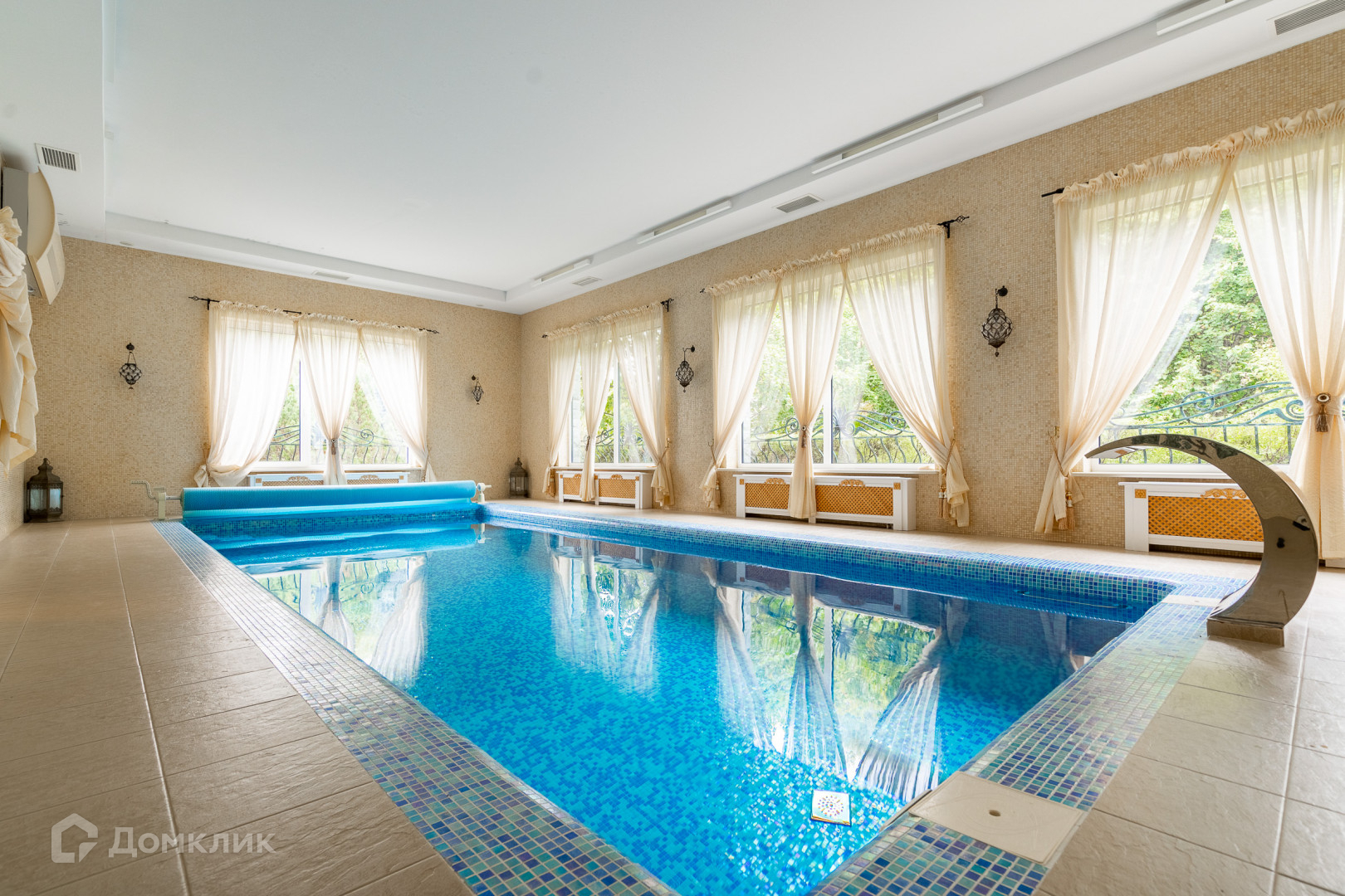 Бассейн: помещение 70 кв. м с 8 метровой чашей водной глади, противотоком, массажем. Установлено немецкое оборудование, осушитель воздуха против запотевания помещения.
