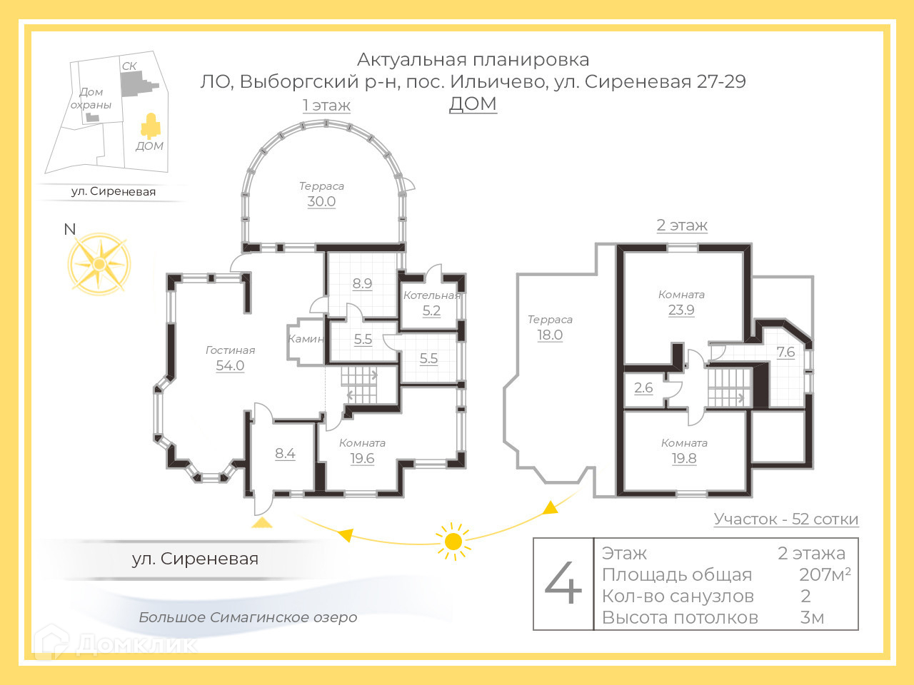 Арт. 51808520 Уникальное родовое поместье в самом центре поселка Ильичёва, расположенное на участке земли ИЖС, площадью 52 сотки, рядом с Большим Симагинским озером.