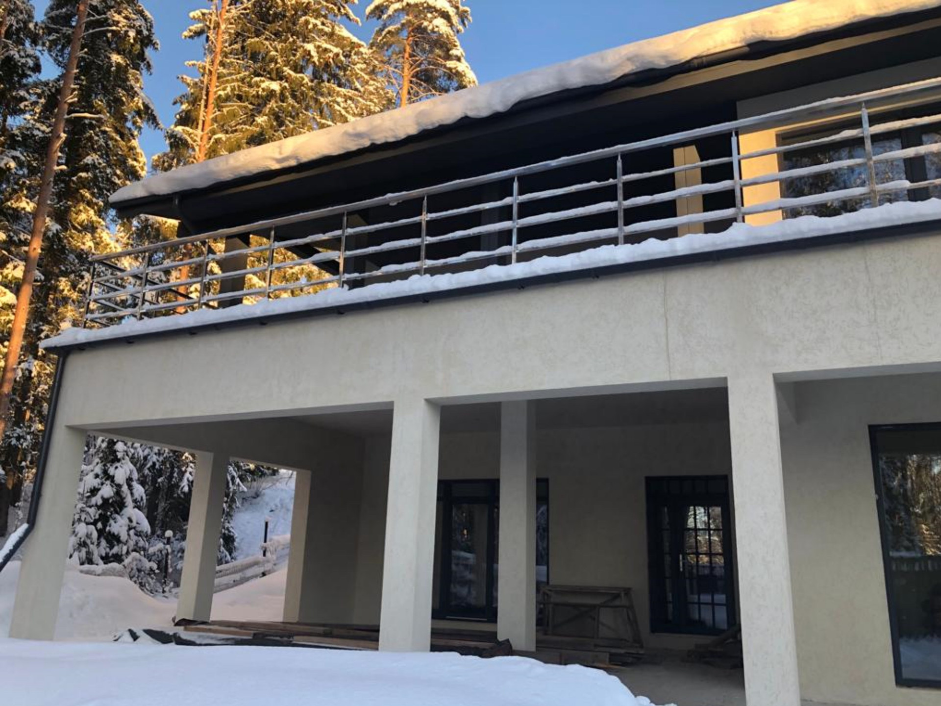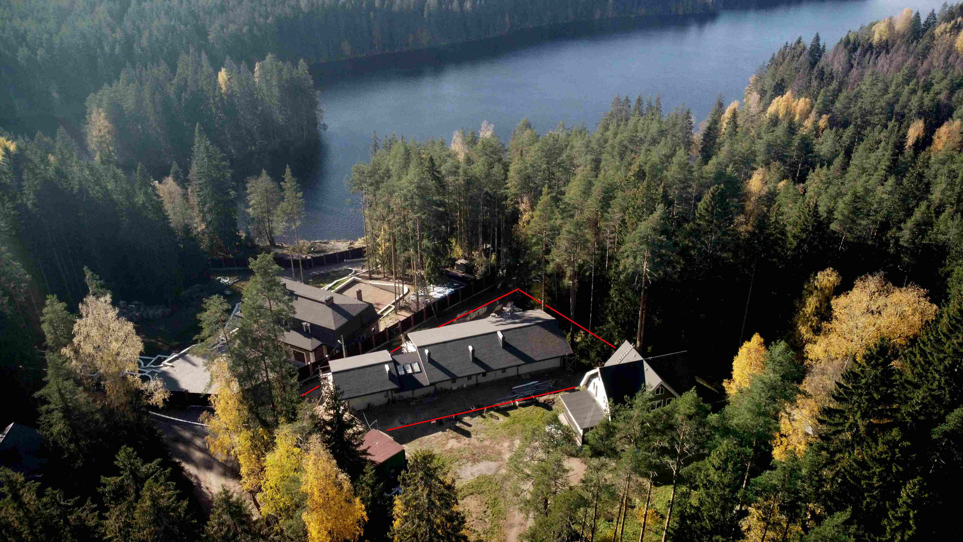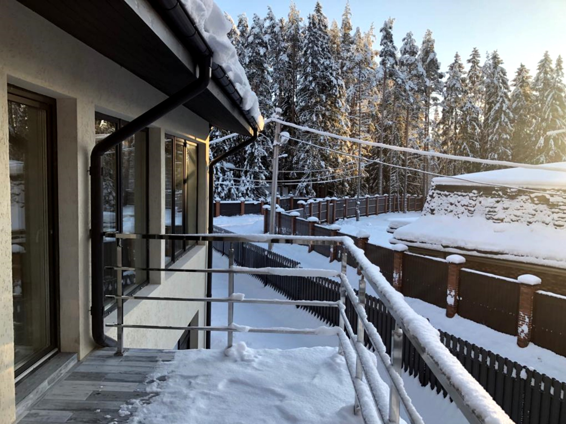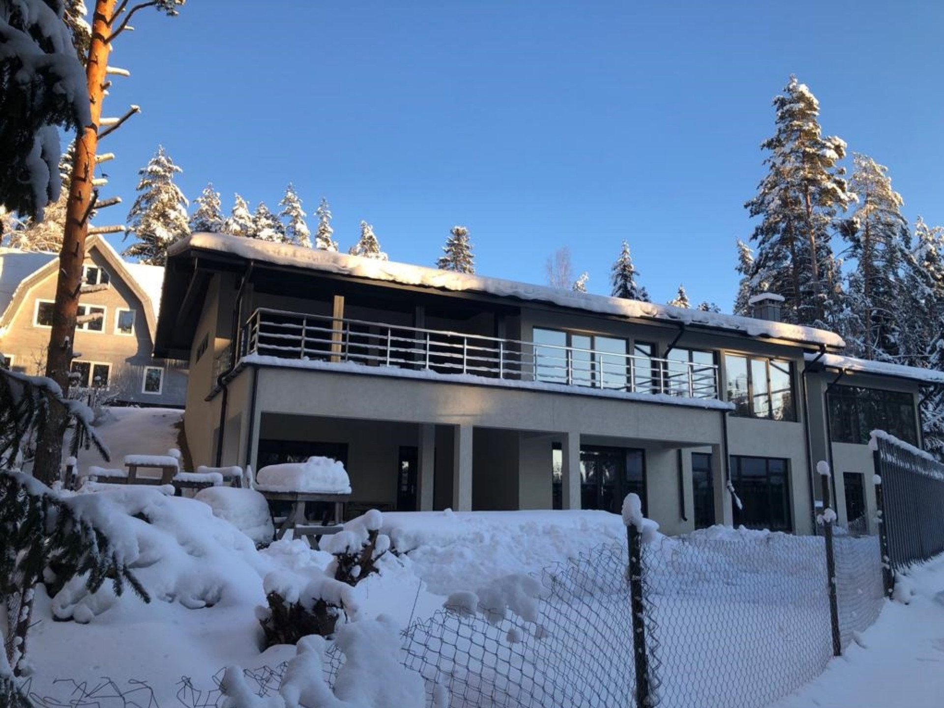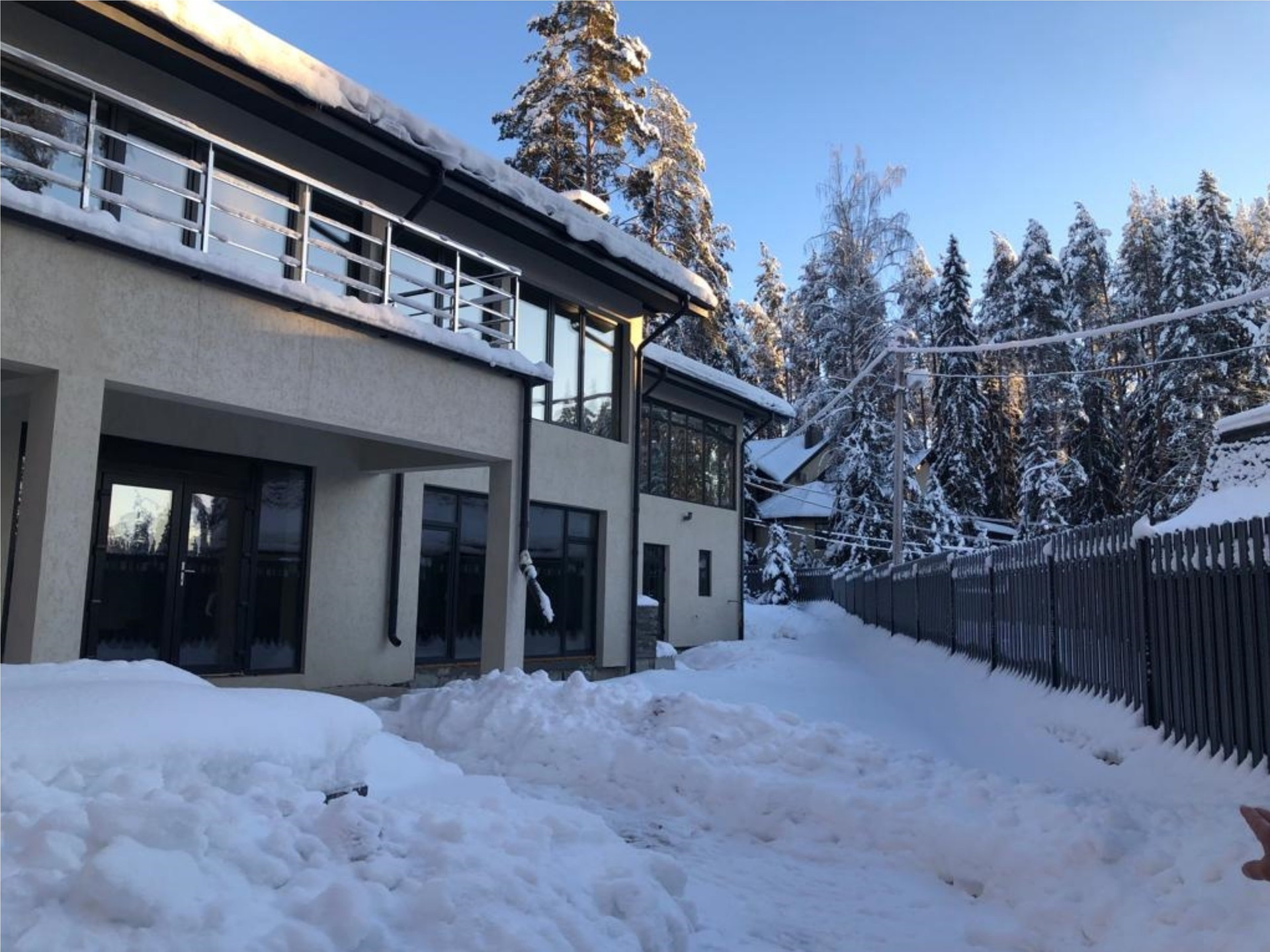 Коттедж без внутренней отделки, отопление – два газовых котла и теплые полы по всему периметру. Водопровод – собственная скважина, электричество – 30кВт, канализация локальная, центральный газ. В доме множество жилых и хозяйственных помещений, видовых террас и балконов (см. поэтажные планы). Вид из всех окон 2-го этажа - на озеро Длинное (150 метров).