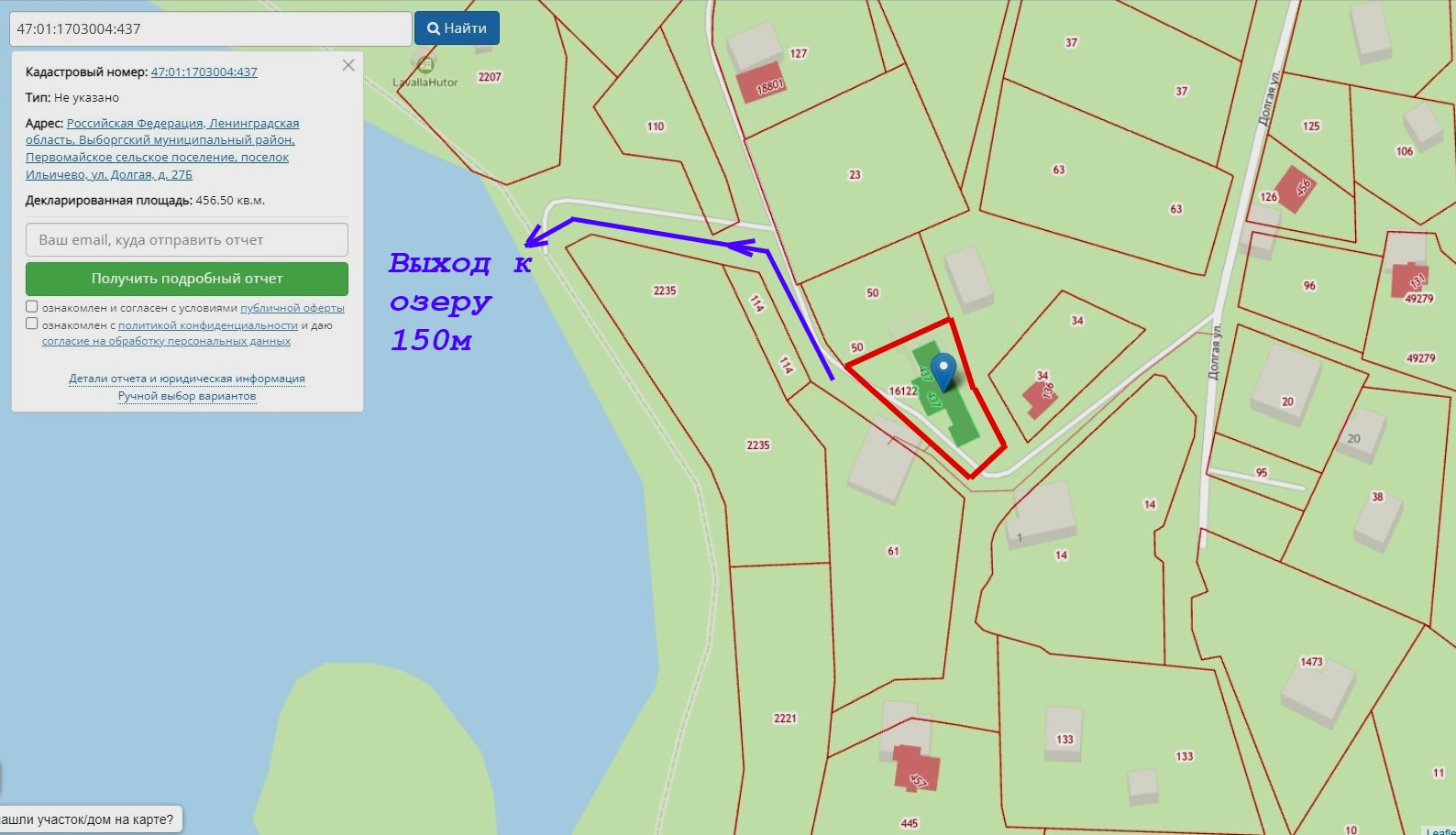 Кадастровый номер участка: 47:01:0000000:16122. Кадастровый номер дома: 47:01:1703004:437. Координаты для навигатора: 60.272363, 29.782726.