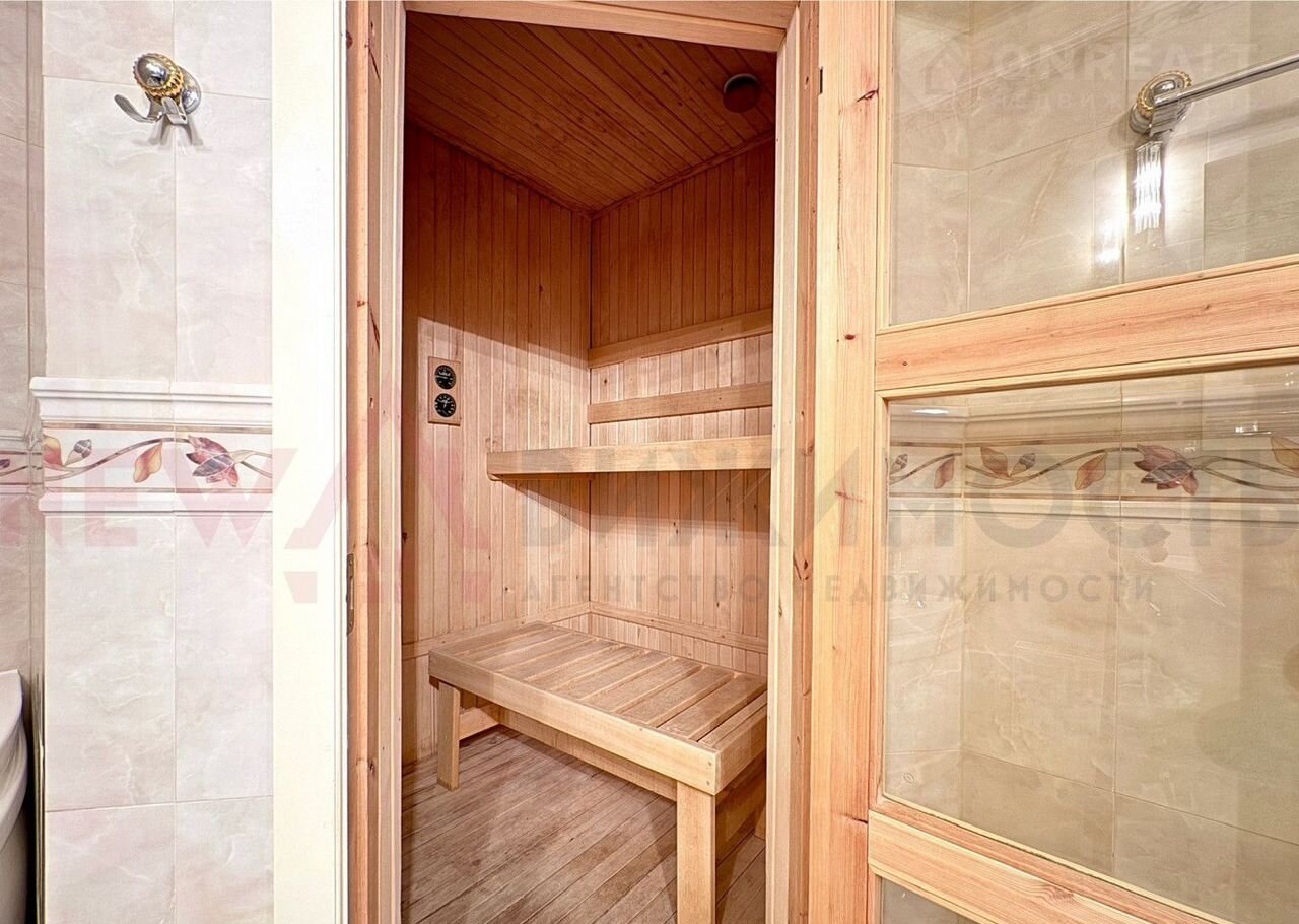 Первый этаж: Кухня 18 кв. м, раздельный санузел; сауна, гостиная около 30 кв. м. с лестницей на второй этаж, а так же спальня на 18 кв. м. На первом этаже расположены две печи.