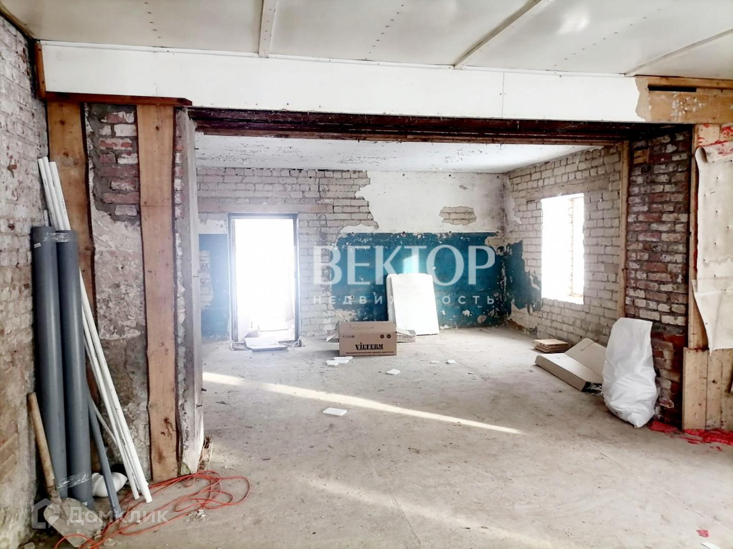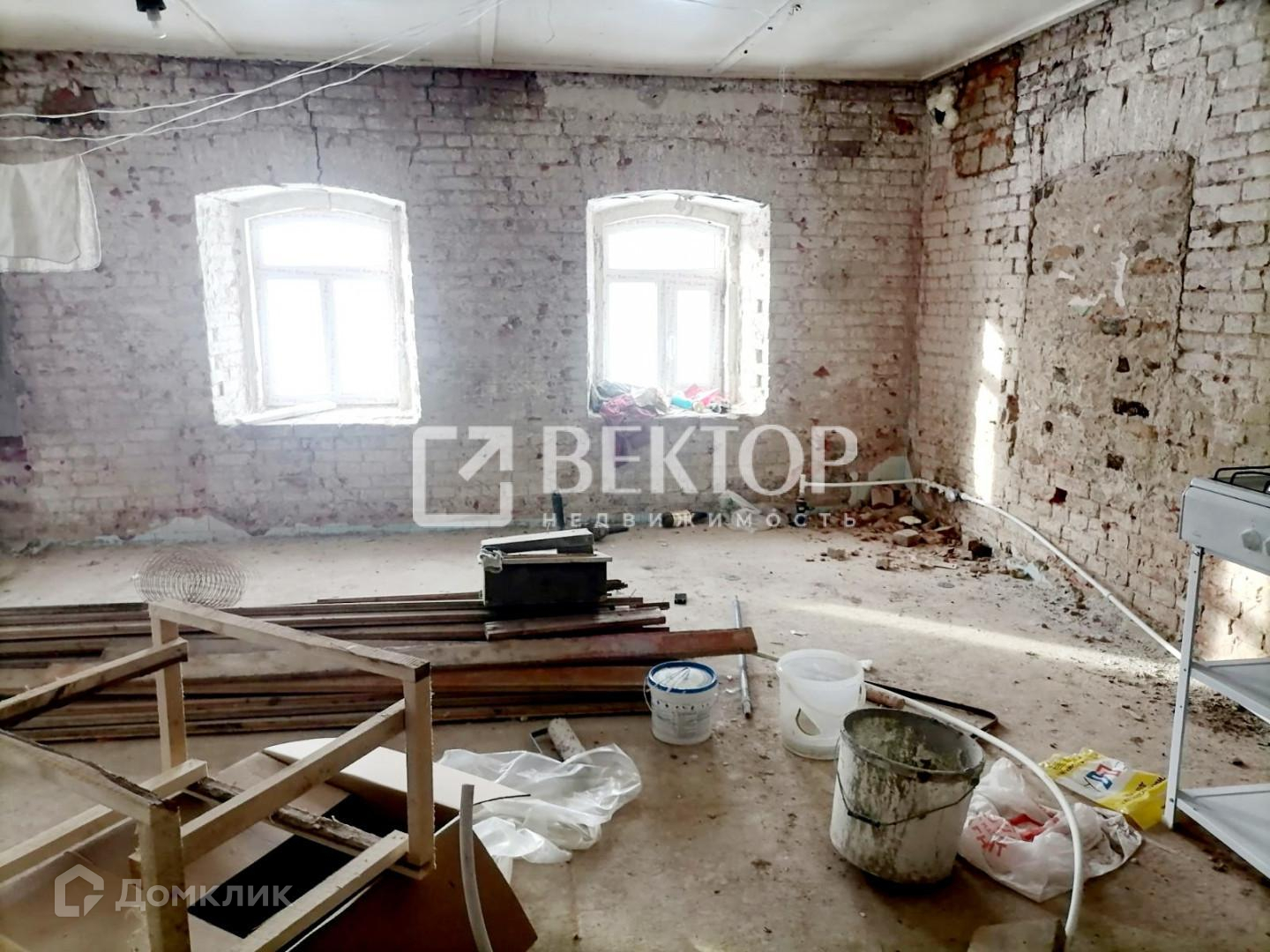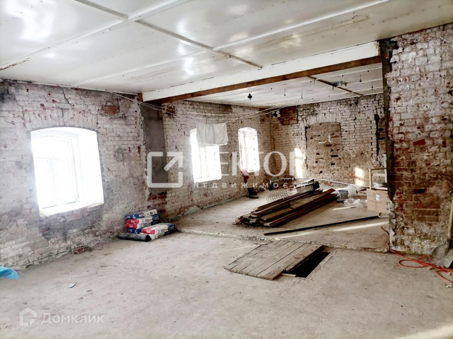 Два отдельных входа в здание. Произведен полный демонтаж стен внутри (толщина стен 70 см.), во всем здании установлены пластиковые окна, полы залиты бетоном, выровнены, перекрытия железобетонные плиты. Есть подвал.