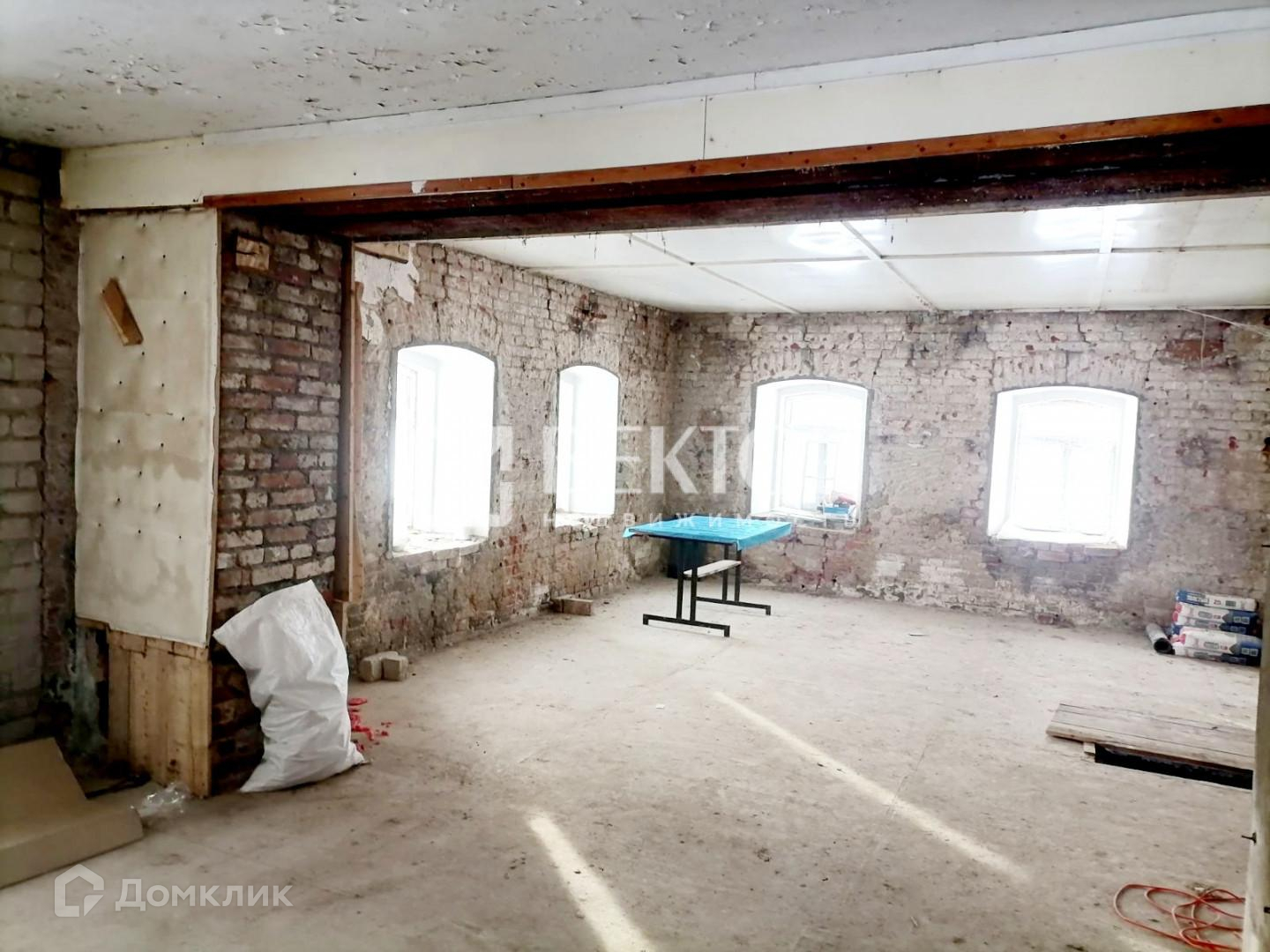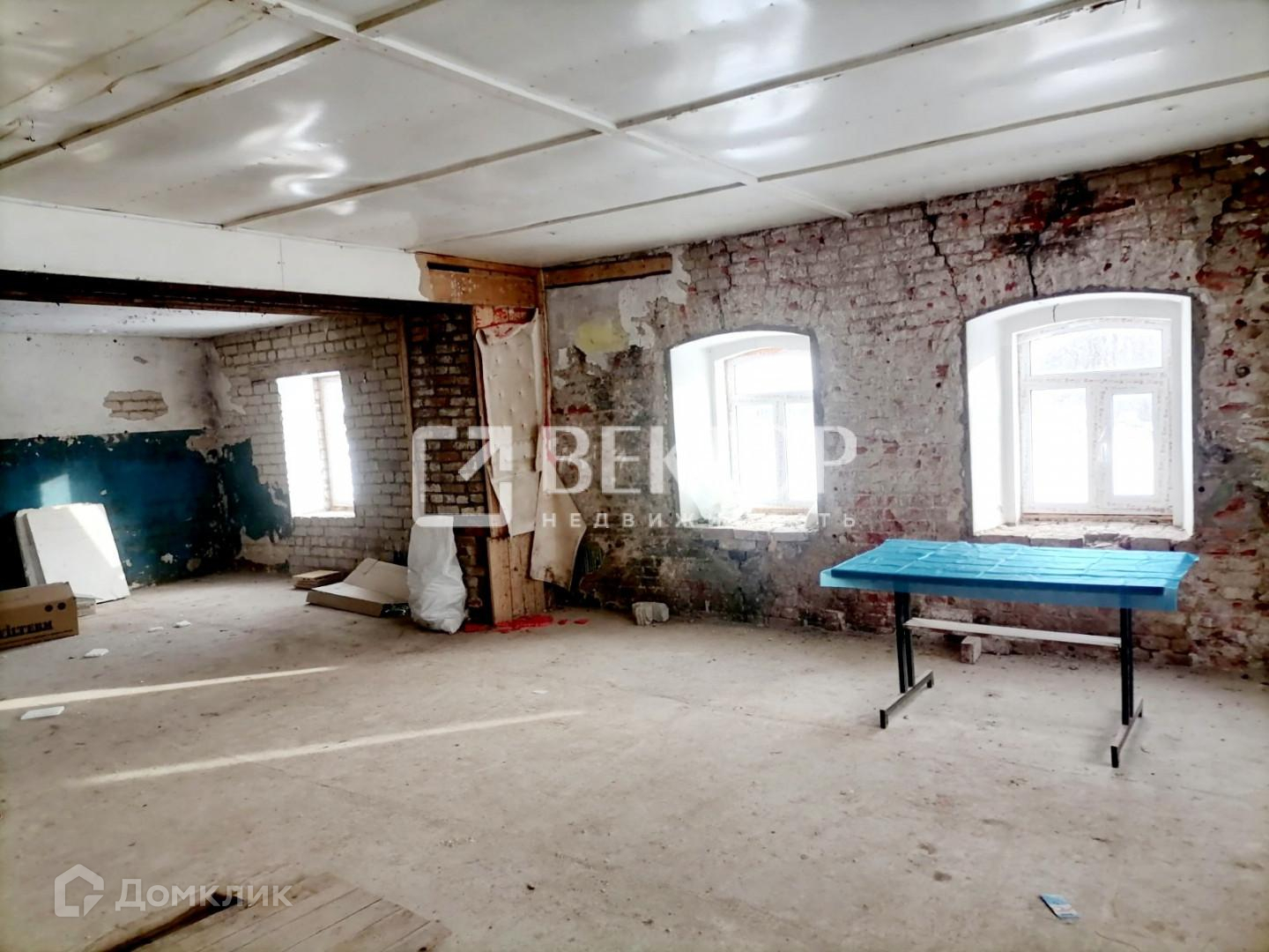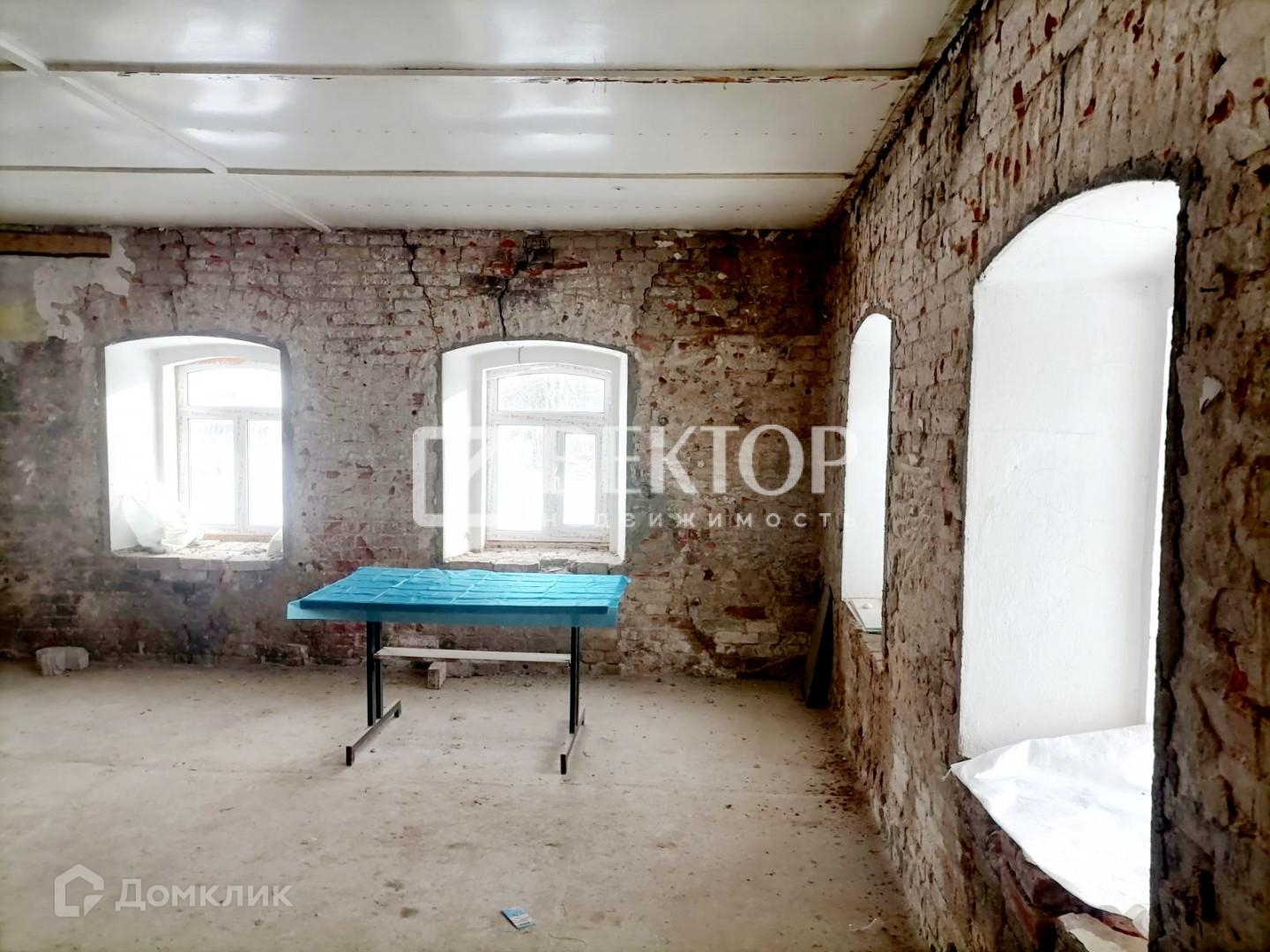 Два отдельных входа в здание. Произведен полный демонтаж стен внутри (толщина стен 70 см.), во всем здании установлены пластиковые окна, полы залиты бетоном, выровнены, перекрытия железобетонные плиты. Есть подвал.