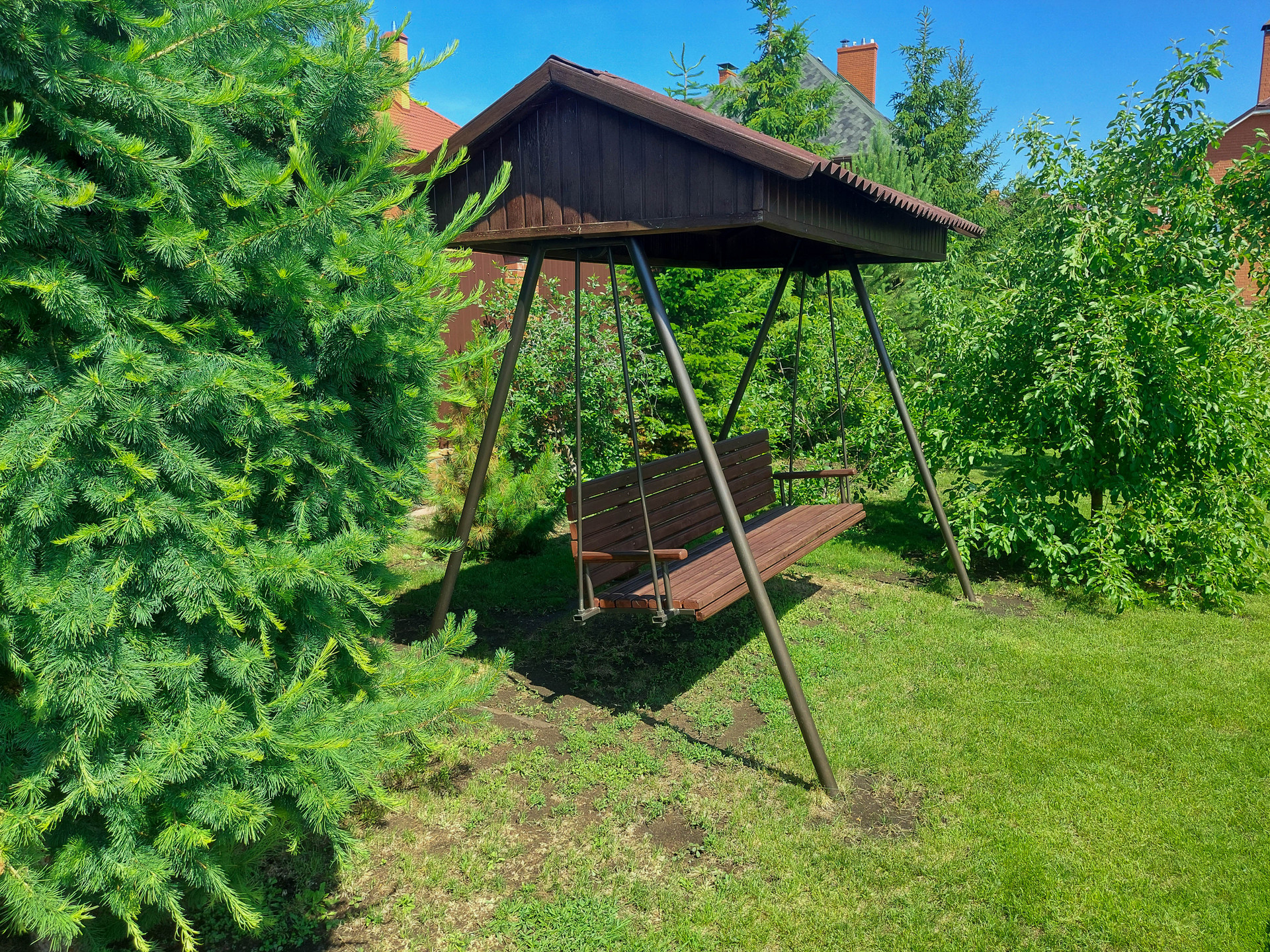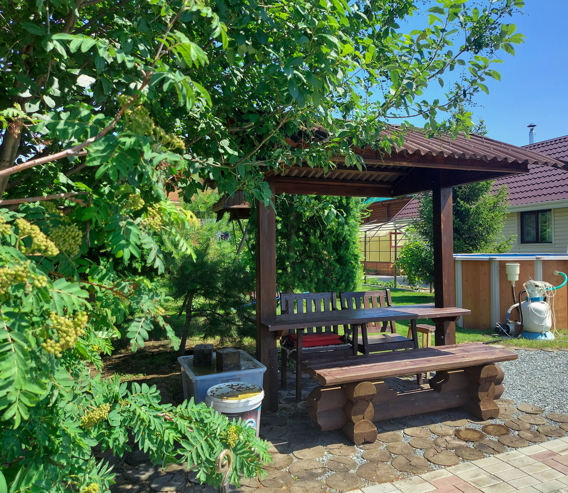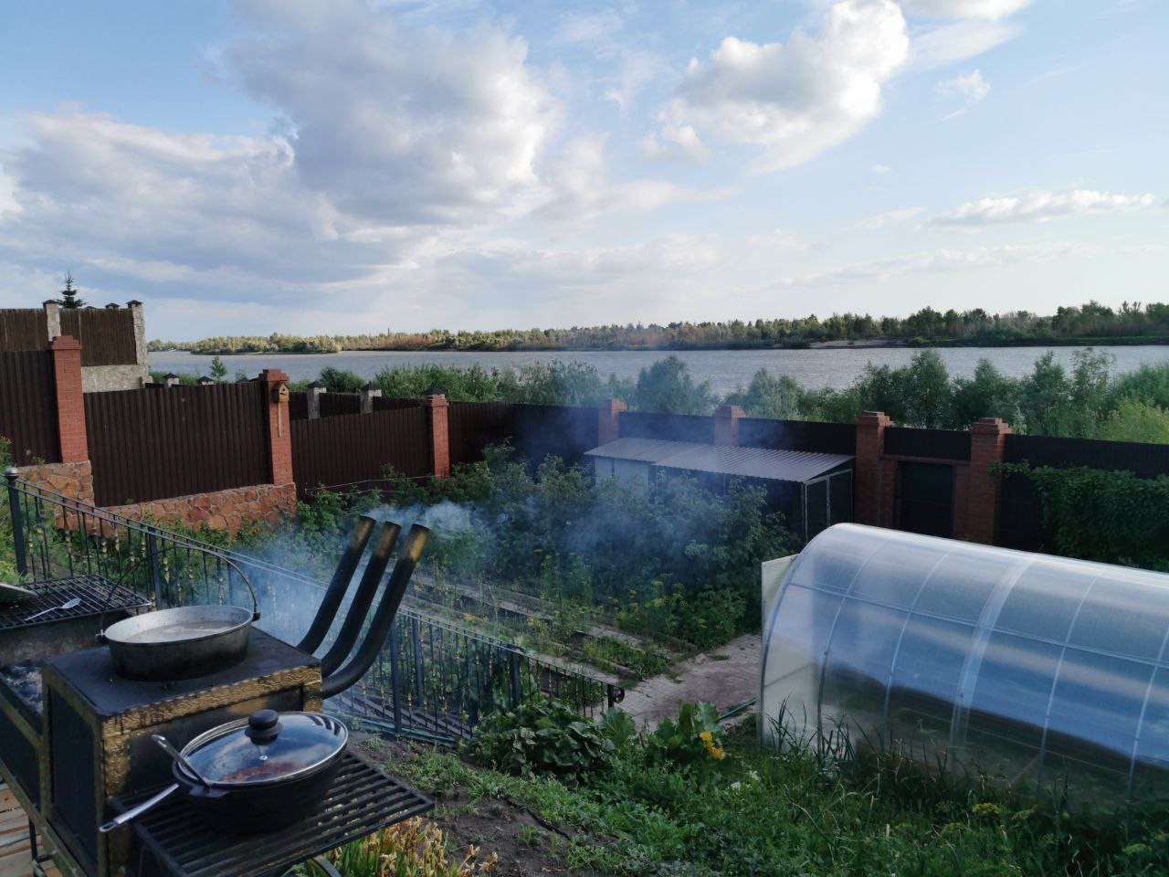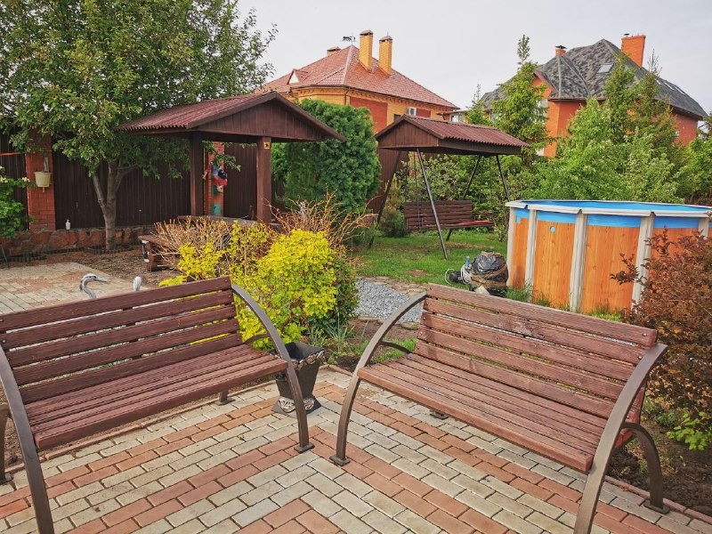 В центре усадьбы располагается двухэтажный дом ,за ним следуют летняя веранда с зоной барбекю кухней и баня.