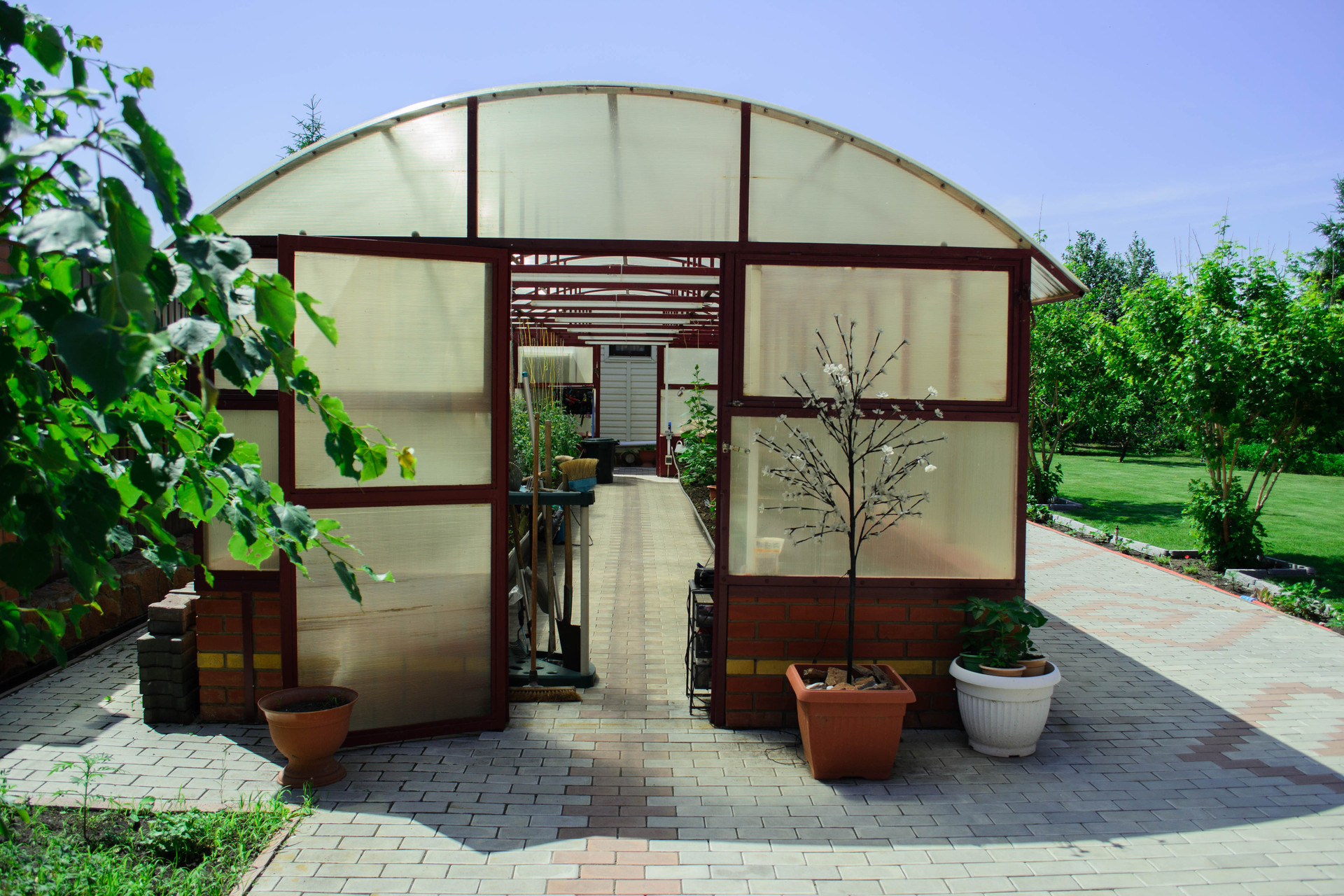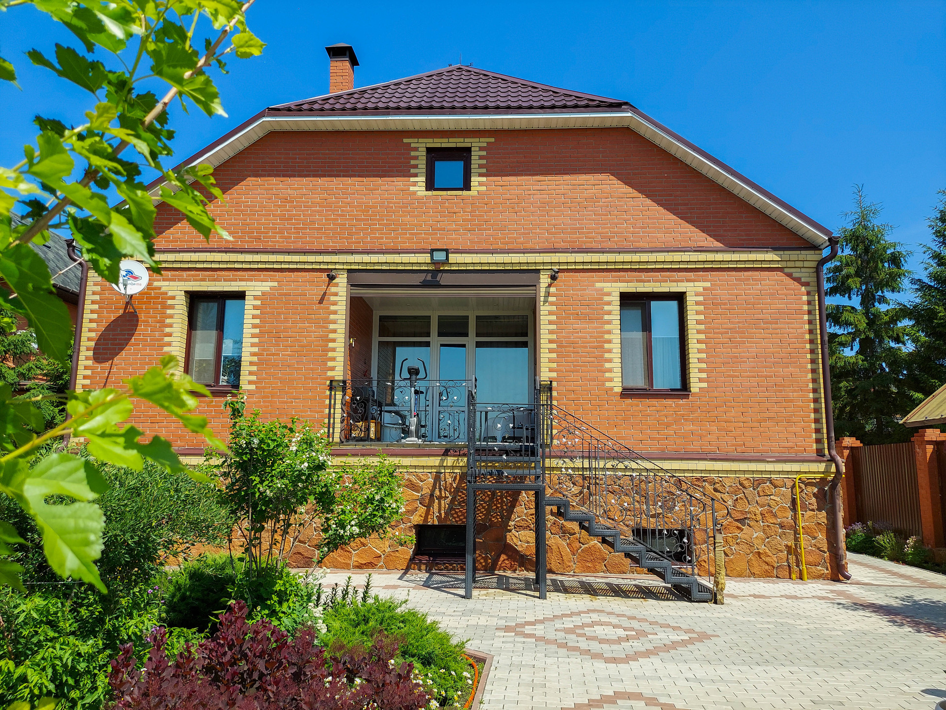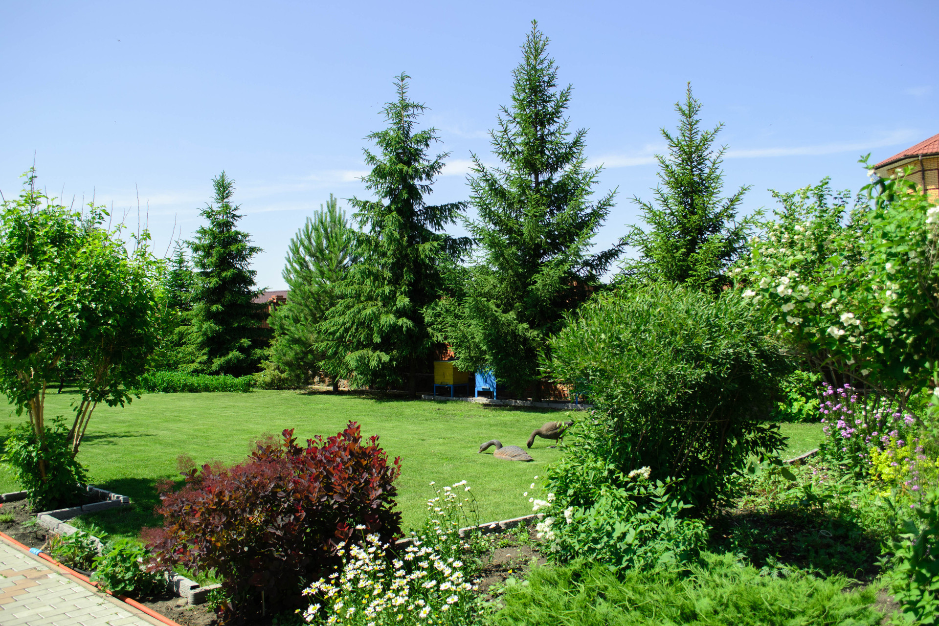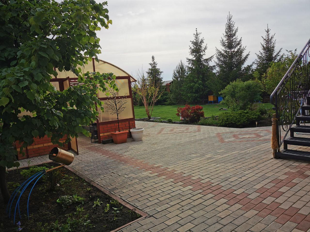 Территория участка полностью благоустроена :пешеходная зона вымощена тротуарной плиткой, в ландшафтном дизайне предпочтение отдано хвойным посадкам, плодоносящим кустарникам.