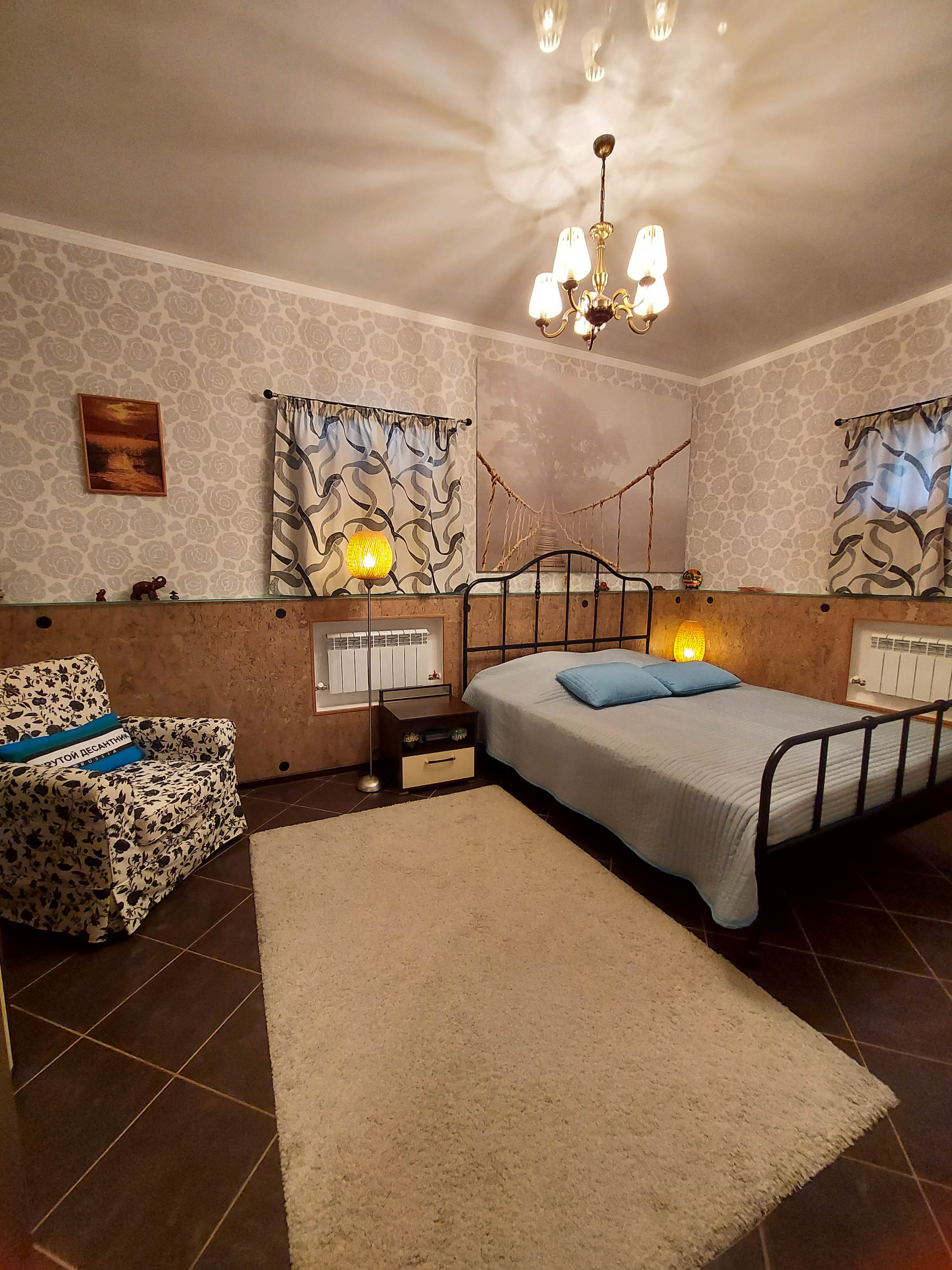 Этажом ниже: гостиная, спальня, гардеробная, ванная комната, подсобные помещения. В оформлении интерьера использованы натуральные материалы. В доме приятно и легко дышится.