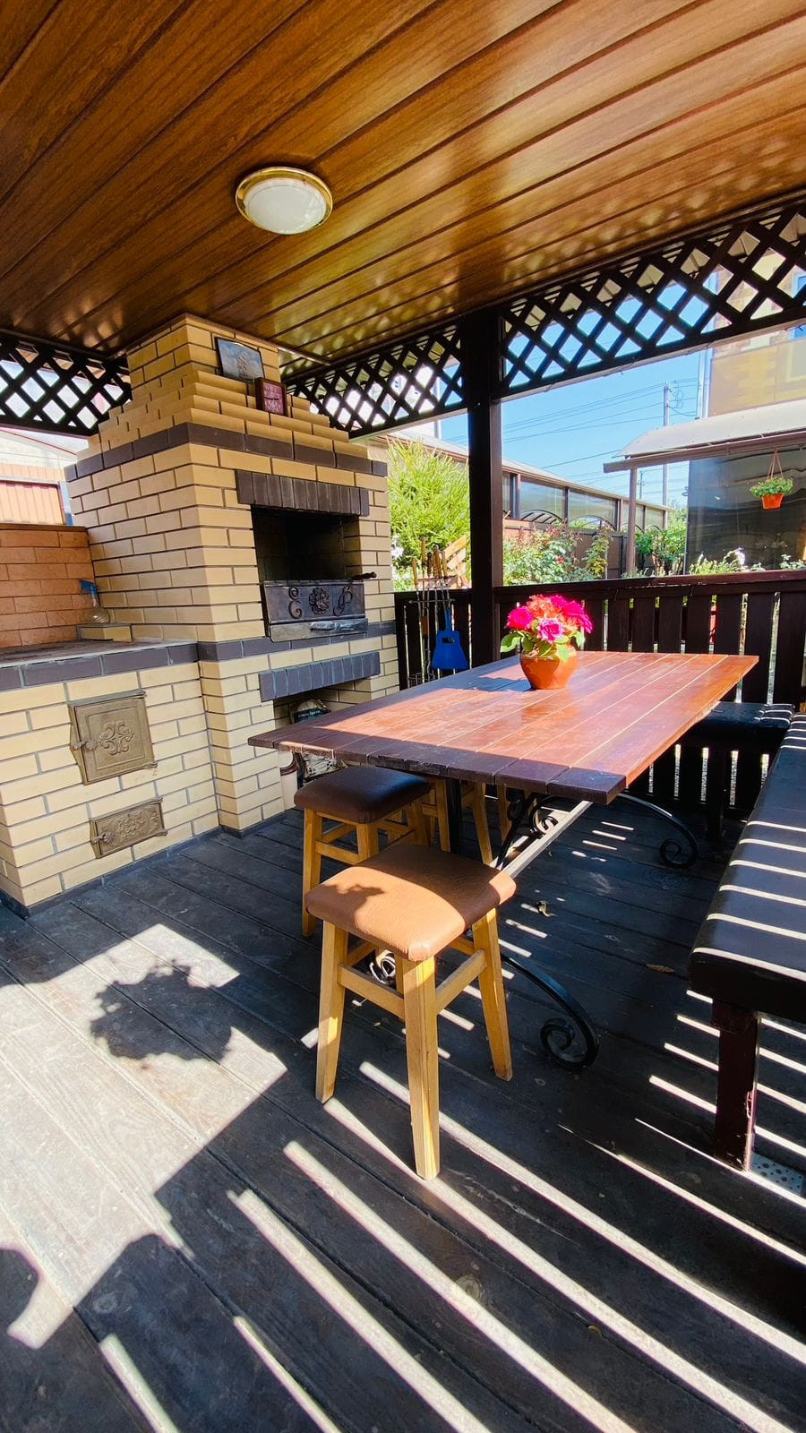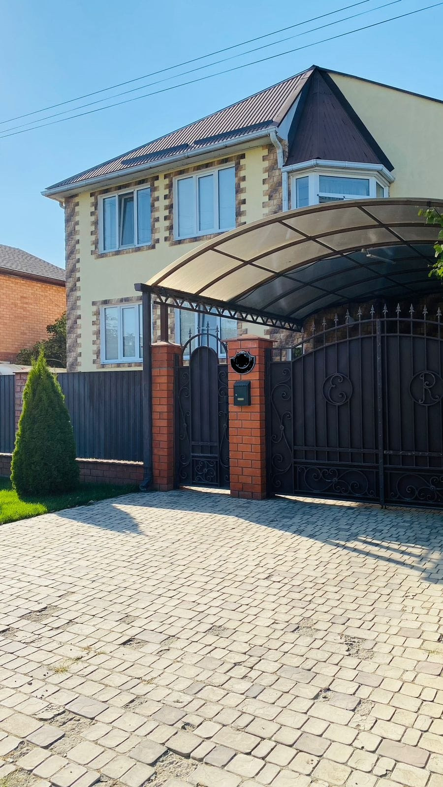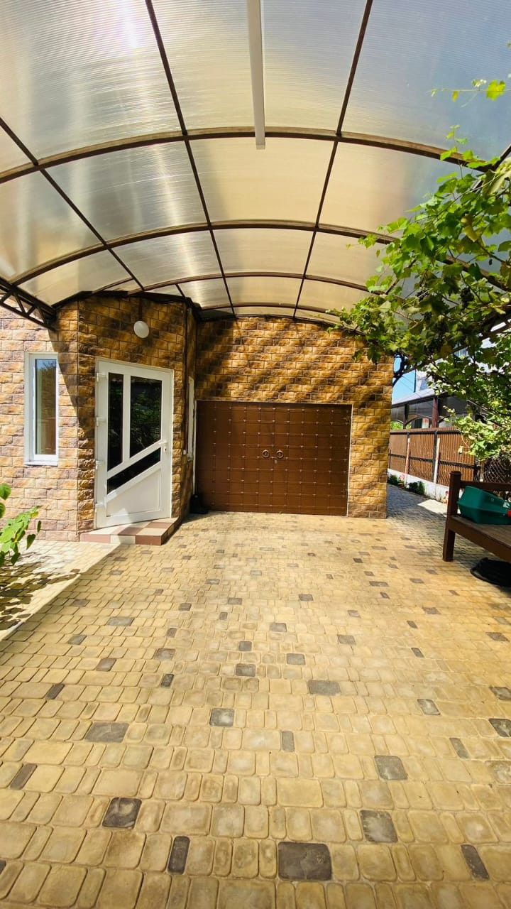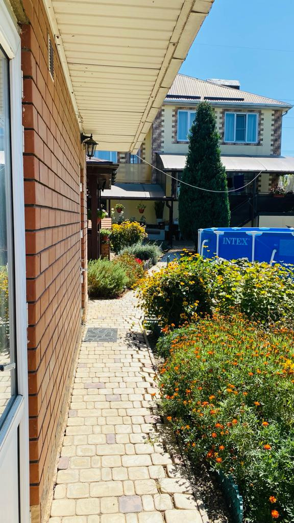 На участке: две теплицы, беседка с летней кухней и зоной барбекю, баня, детский домик, курятник, навес для одного автомобиля, плодовые деревья (вишня, персик, инжир , кизил, виноград несколько сортов), а также перед домом имеется сад с плодовыми деревьями (черешня, слива, персики, абрикосы, айва, груши и яблоки).