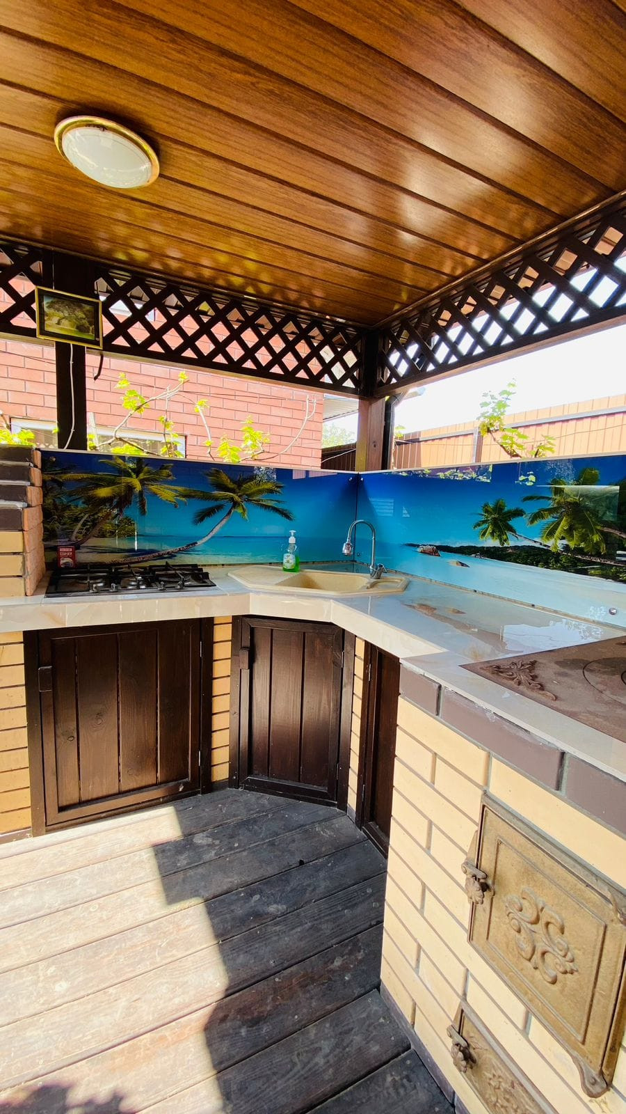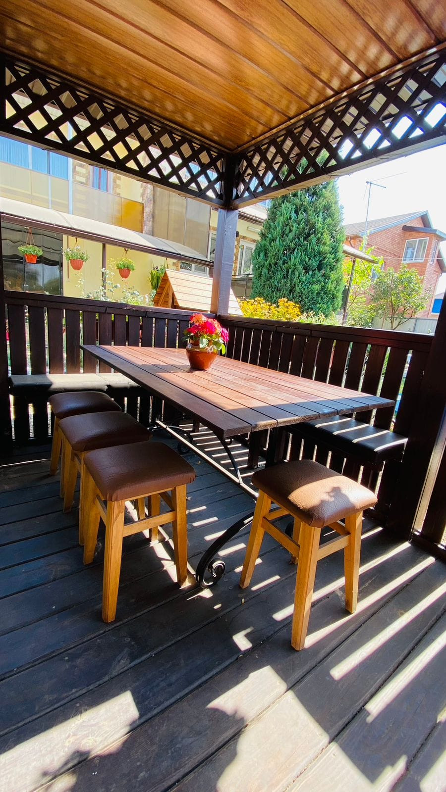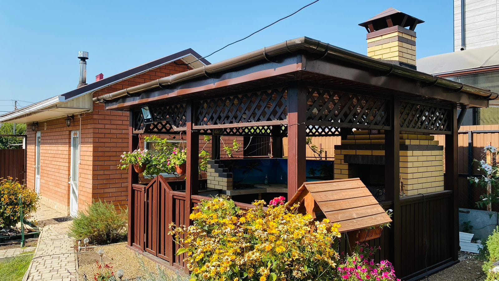 На участке: две теплицы, беседка с летней кухней и зоной барбекю, баня, детский домик, курятник, навес для одного автомобиля, плодовые деревья (вишня, персик, инжир , кизил, виноград несколько сортов), а также перед домом имеется сад с плодовыми деревьями (черешня, слива, персики, абрикосы, айва, груши и яблоки).