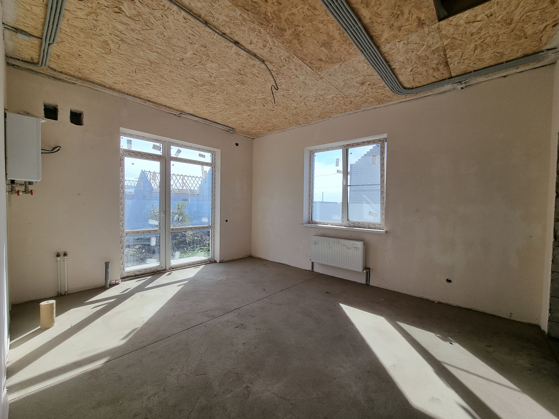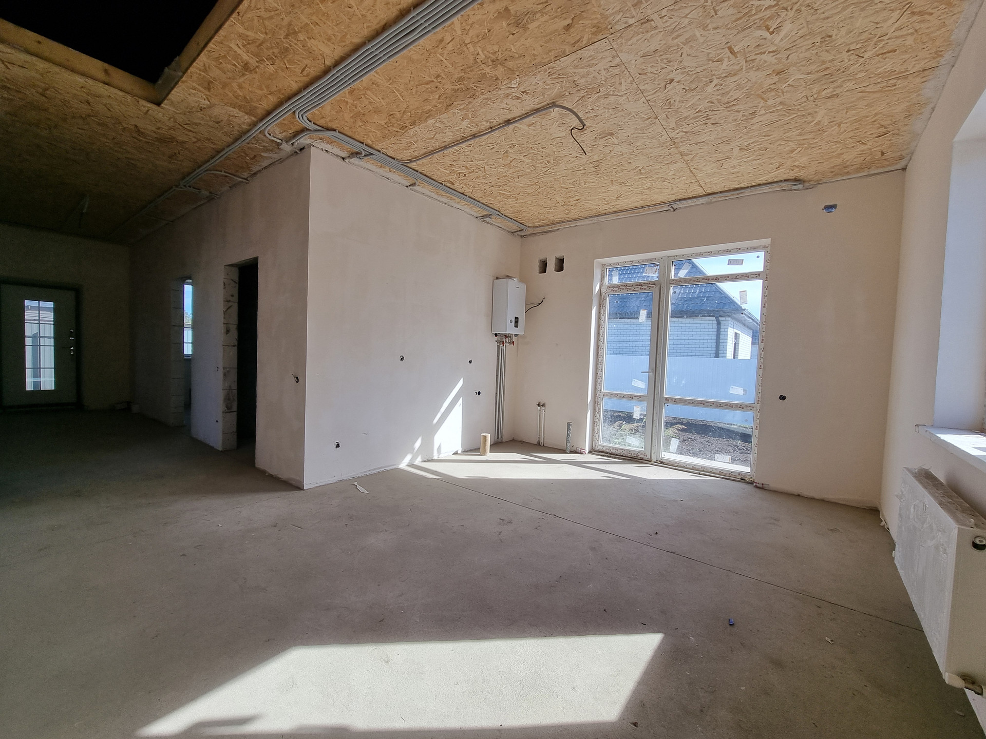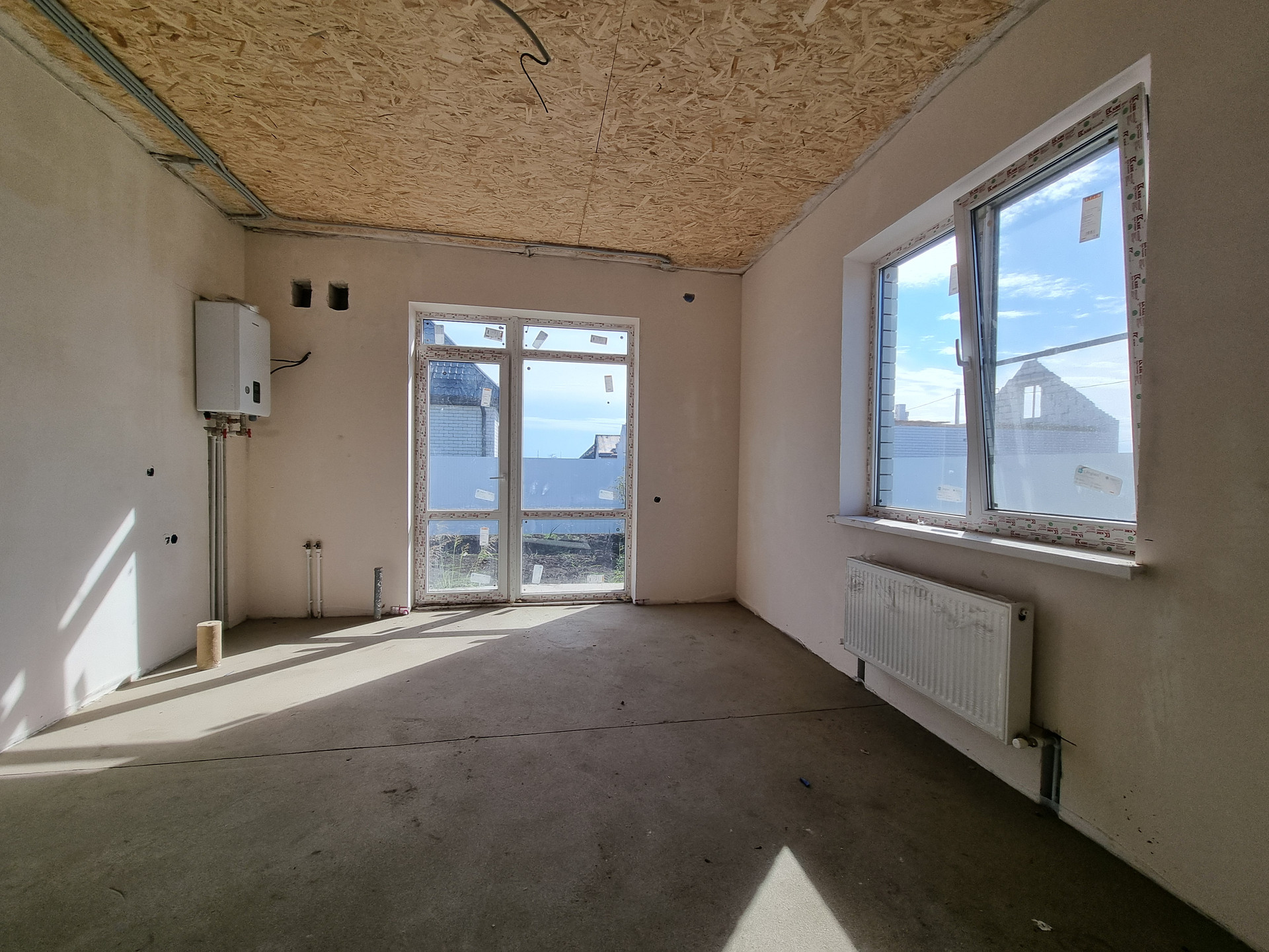 В доме выполнена качественная предчистовая отделка, полусухая стяжка пола. Разводка электрики, сантехники, установлен тёплый пол, радиаторы отопления, двухконтурный котёл.