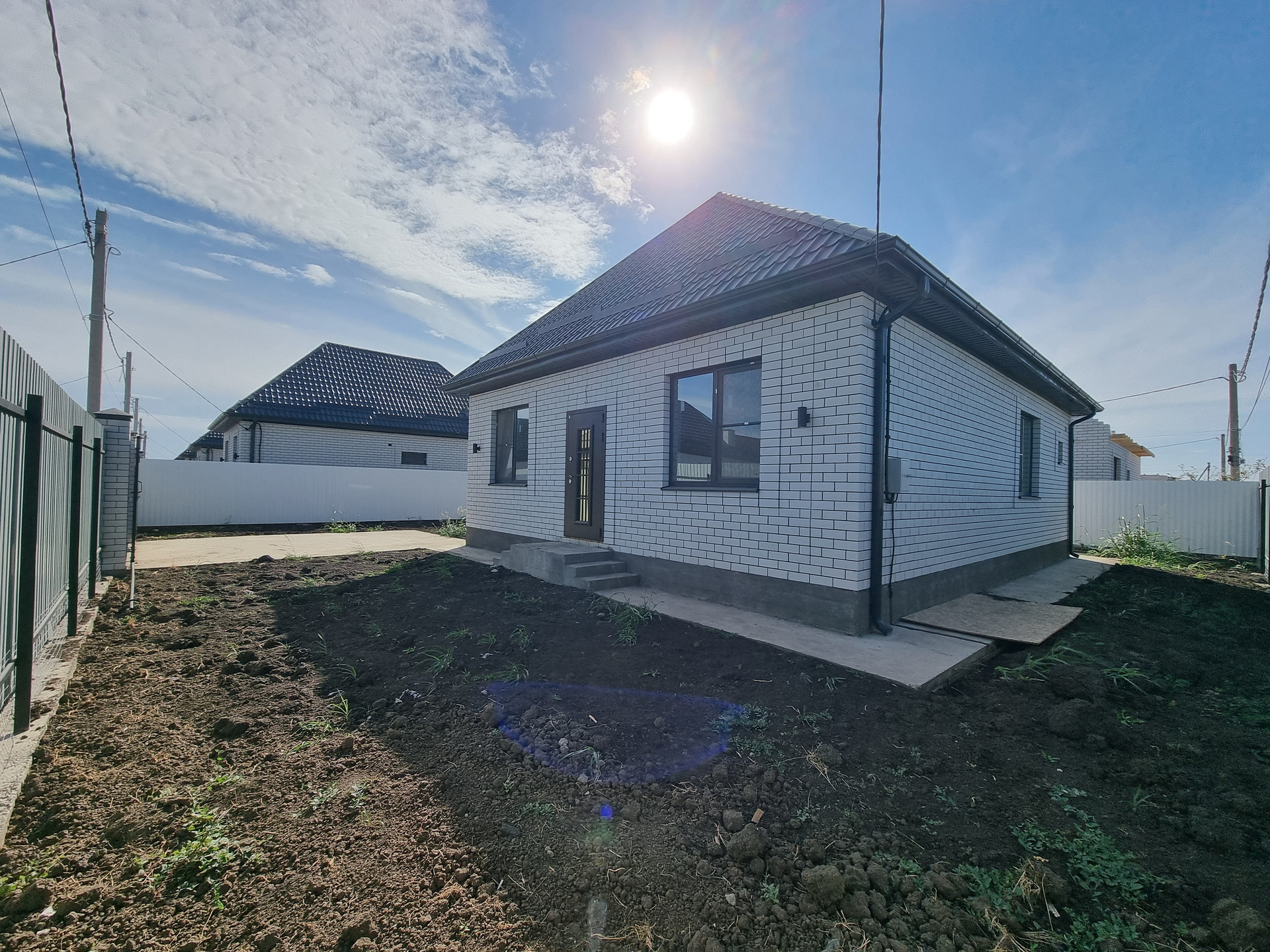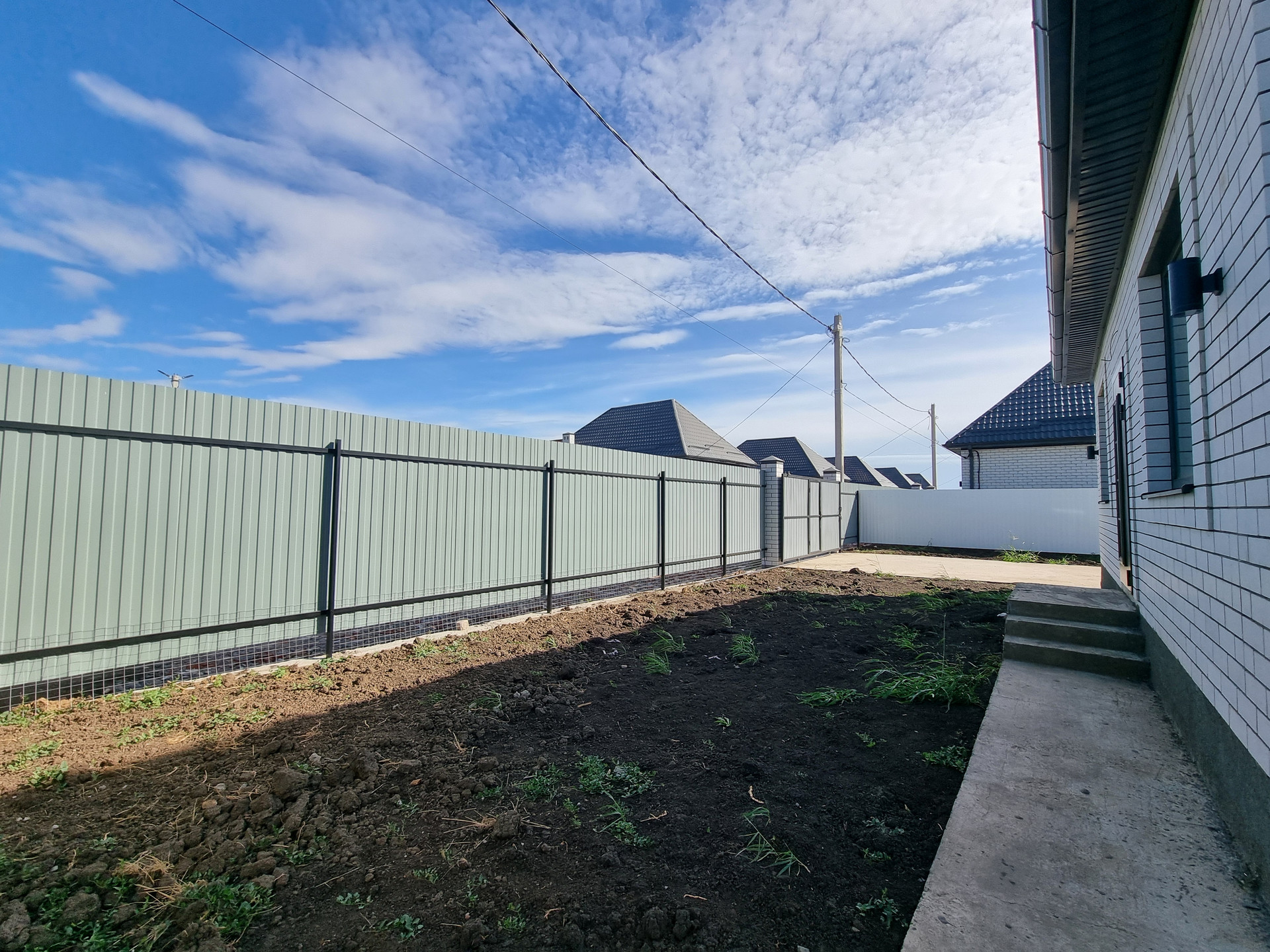 Земельный участок 3,7 сотки ИЖС, в дожди участок сухой. По фасаду участка установлены колонны, ворота, калитка. По периметру участка забор из металлопрофиля, устроена бетонированная зона для парковки двух автомобилей, вход от калитки до входа в дом, отмостка вокруг дома полностью готова к укладке тротуарной плитки.