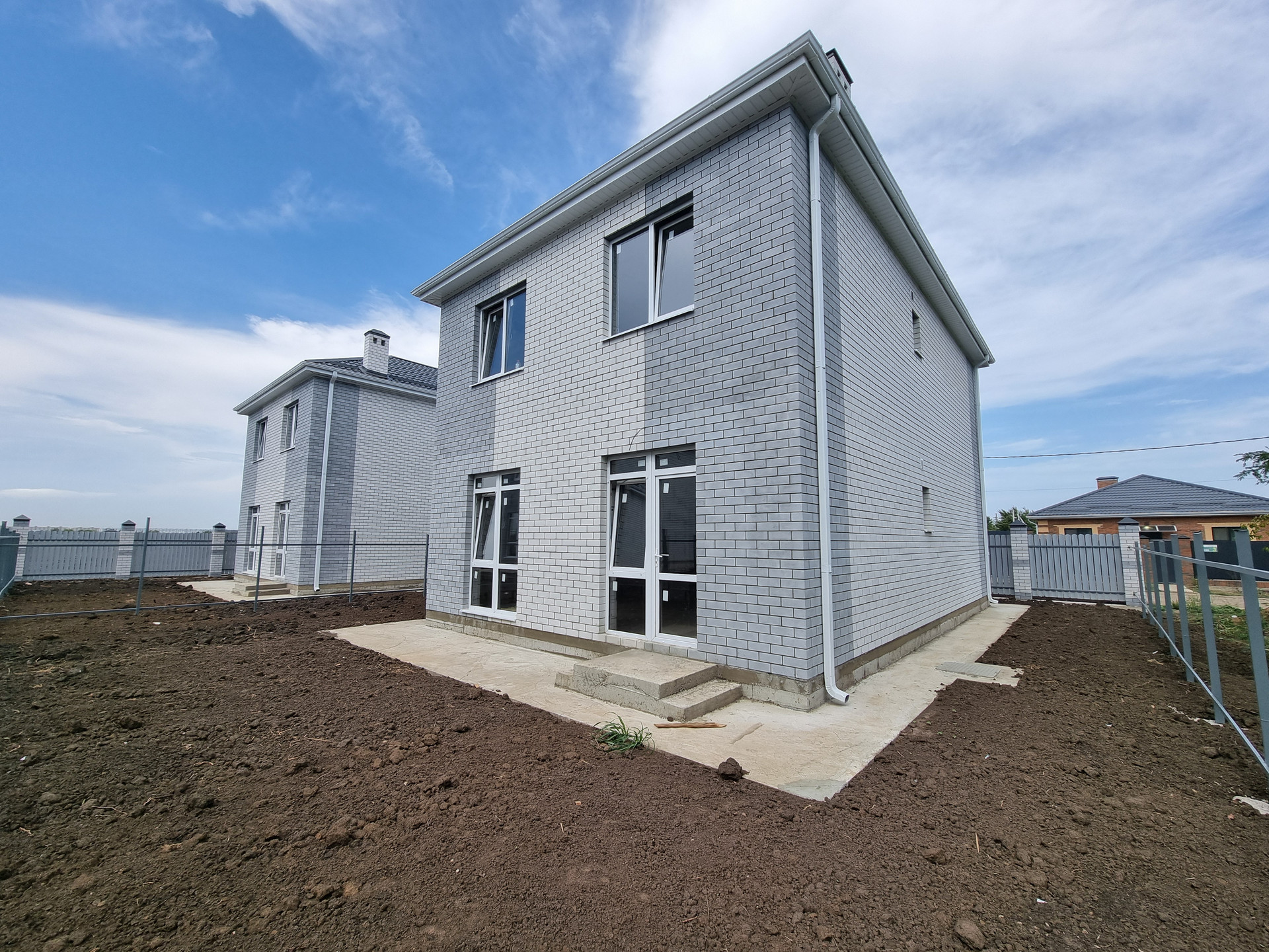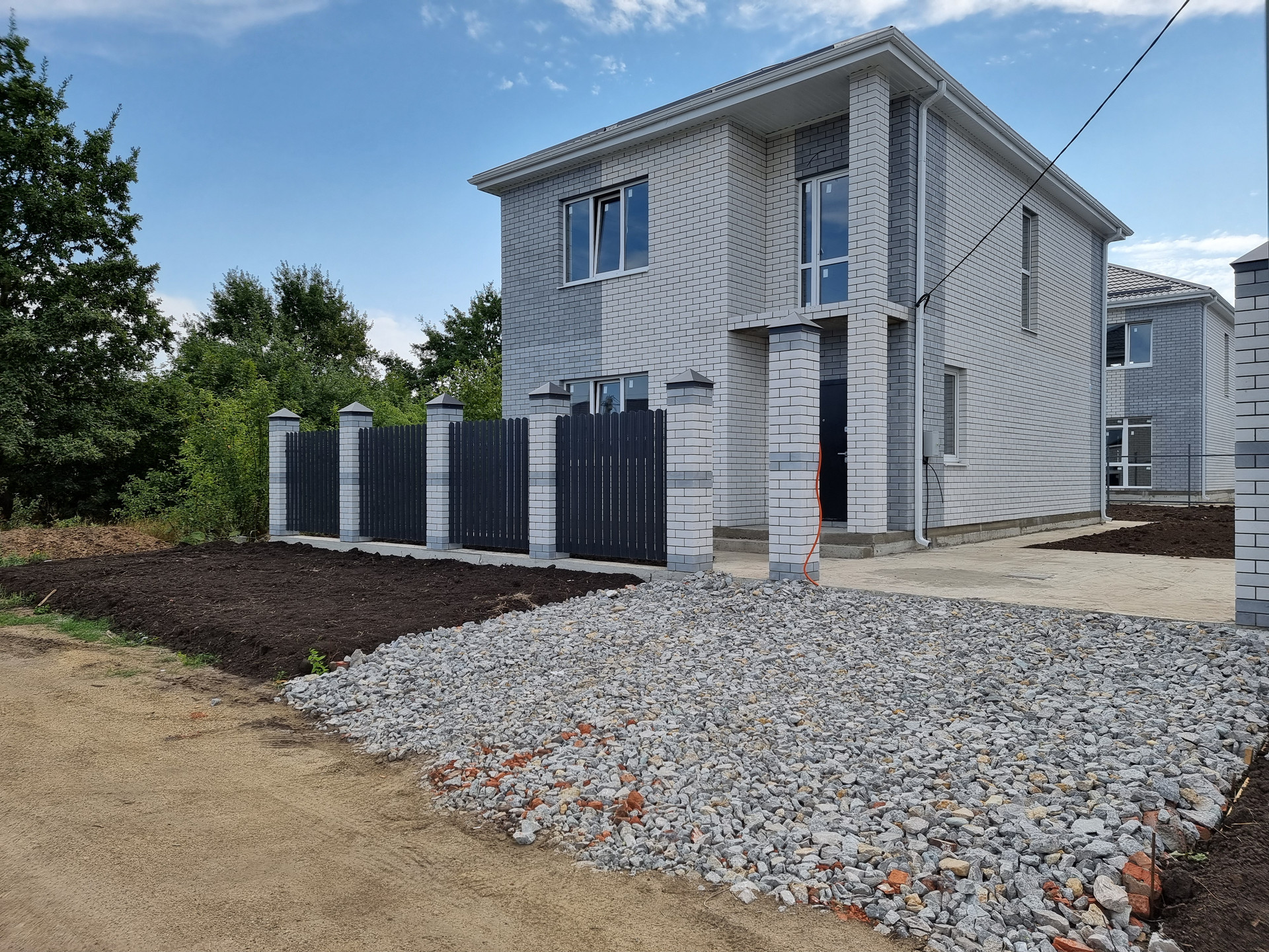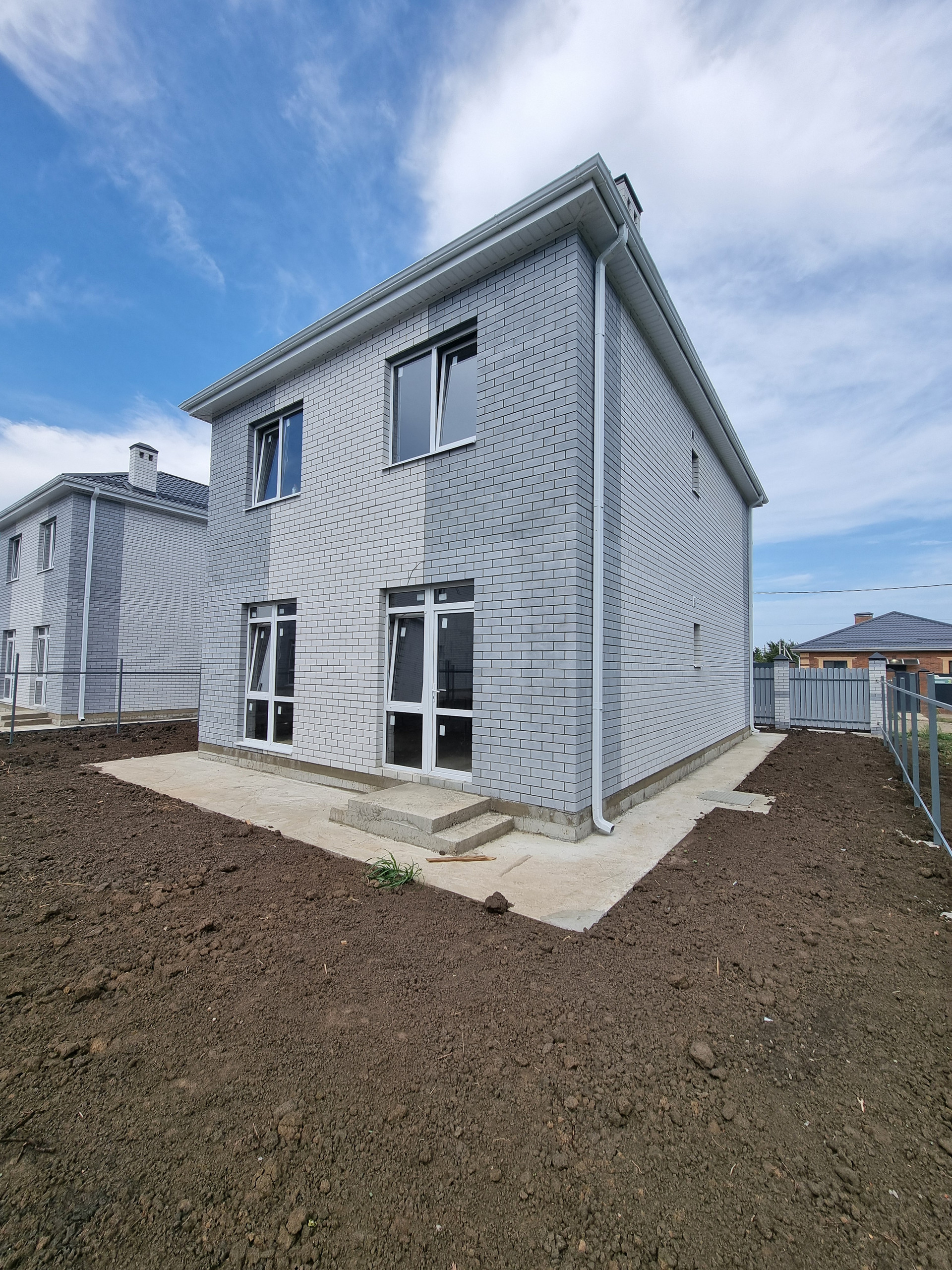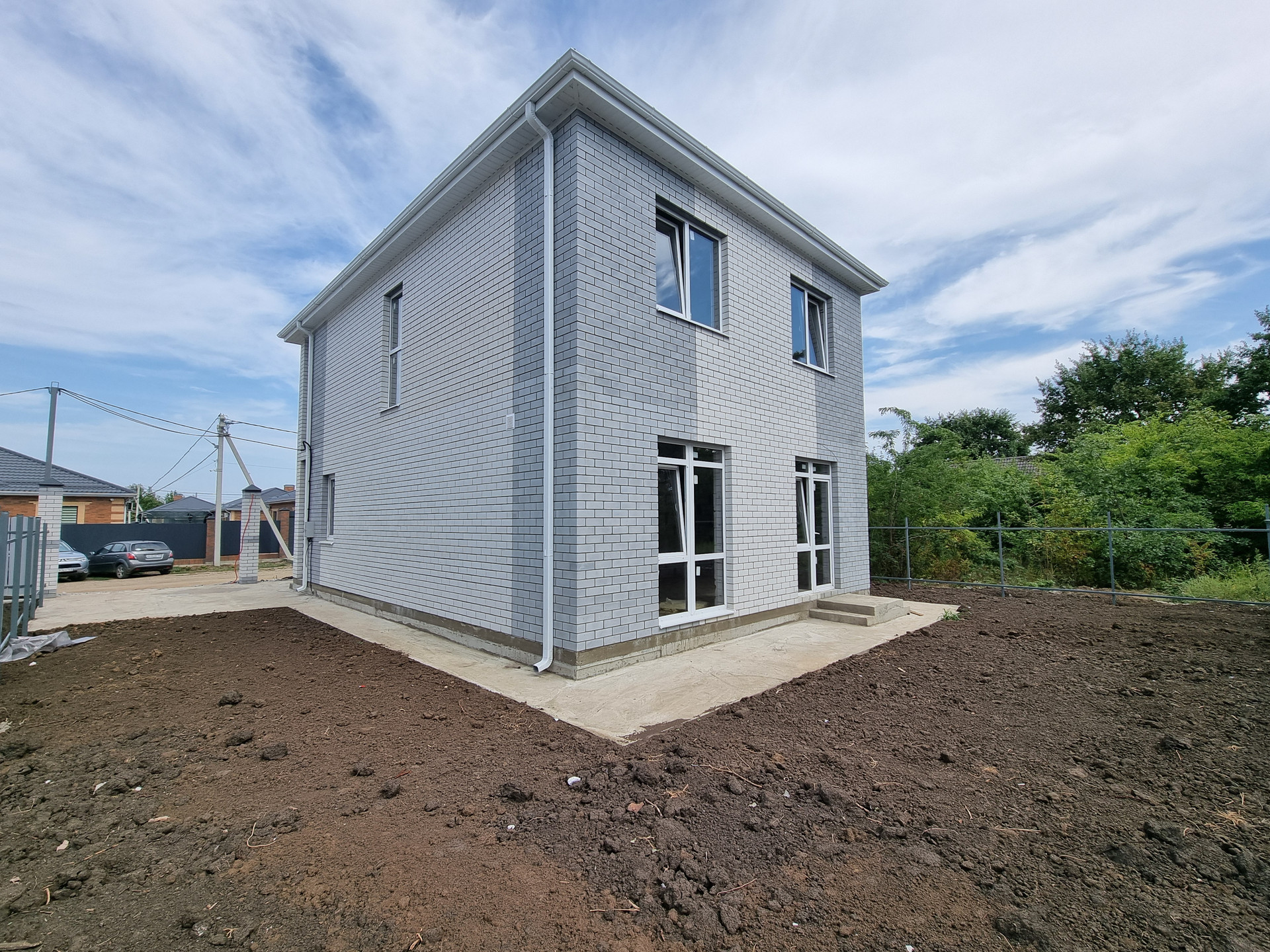 Земельный участок 3,4 сотки ИЖС, в дожди участок сухой. По фасаду участка установлены колонны, ворота, калитка. По периметру участка забор из металлопрофиля, устроена бетонированная зона для парковки двух автомобилей, вход от калитки до входа в дом, отмостка вокруг дома полностью готова к укладке тротуарной плитки.