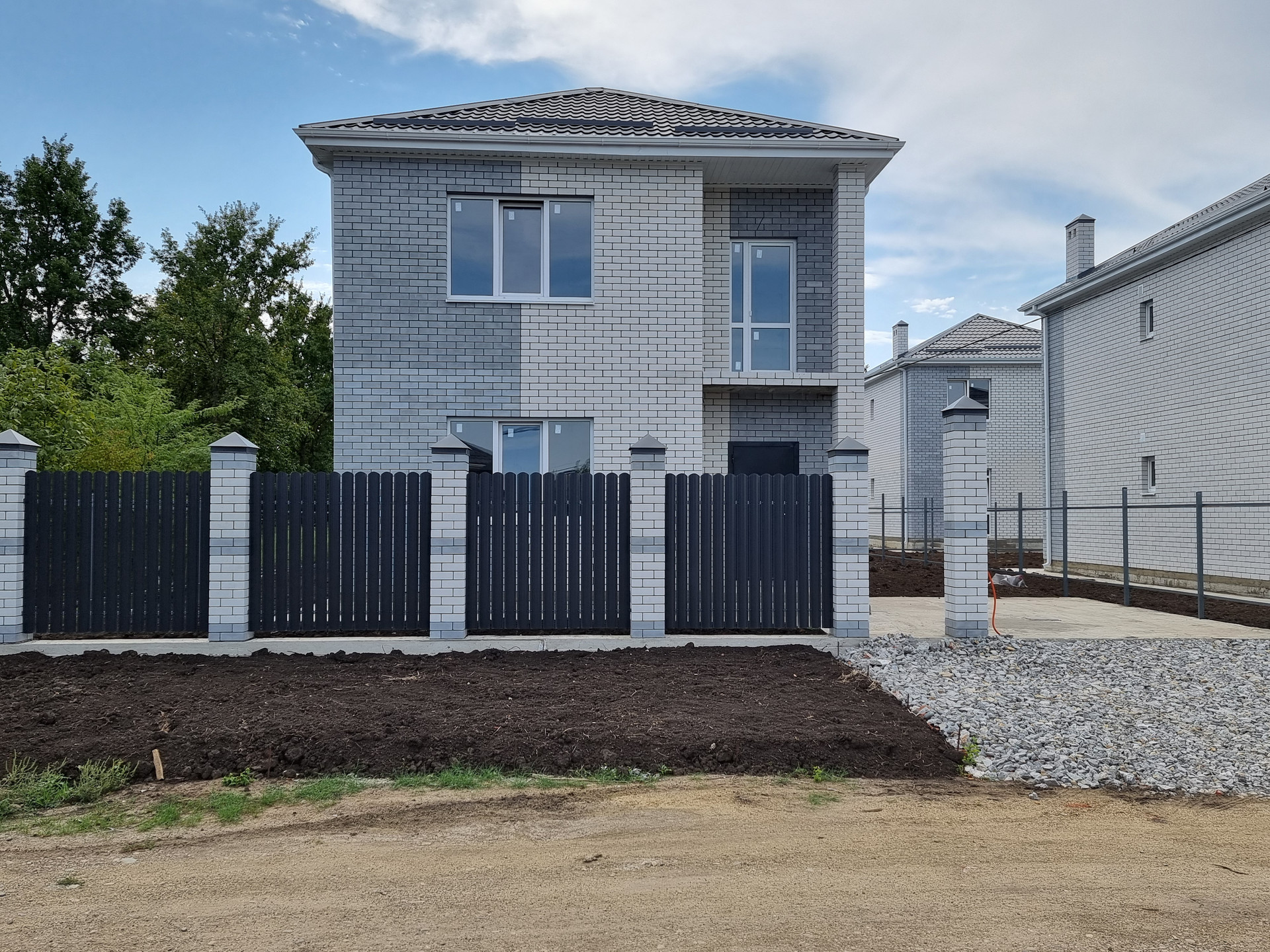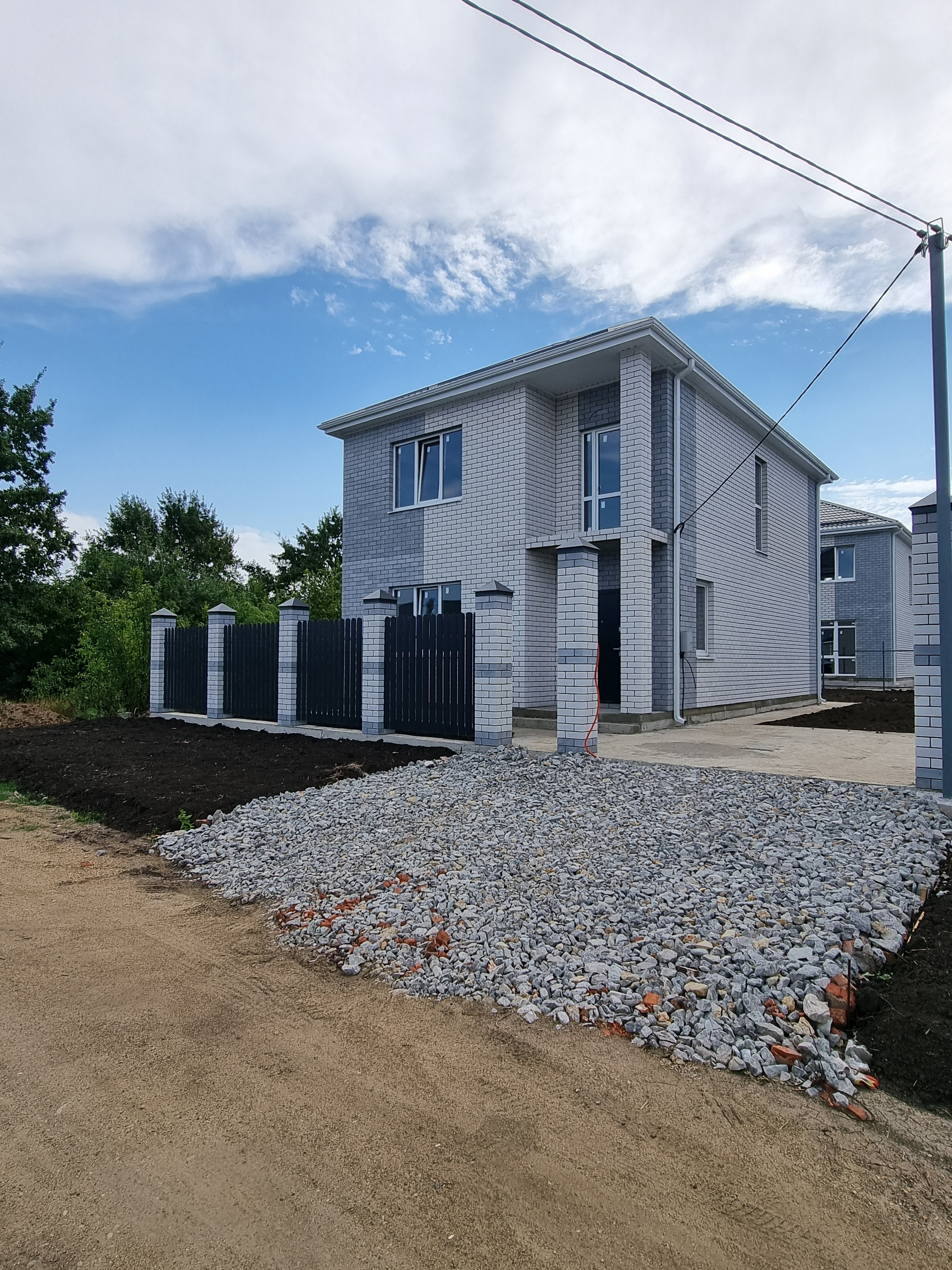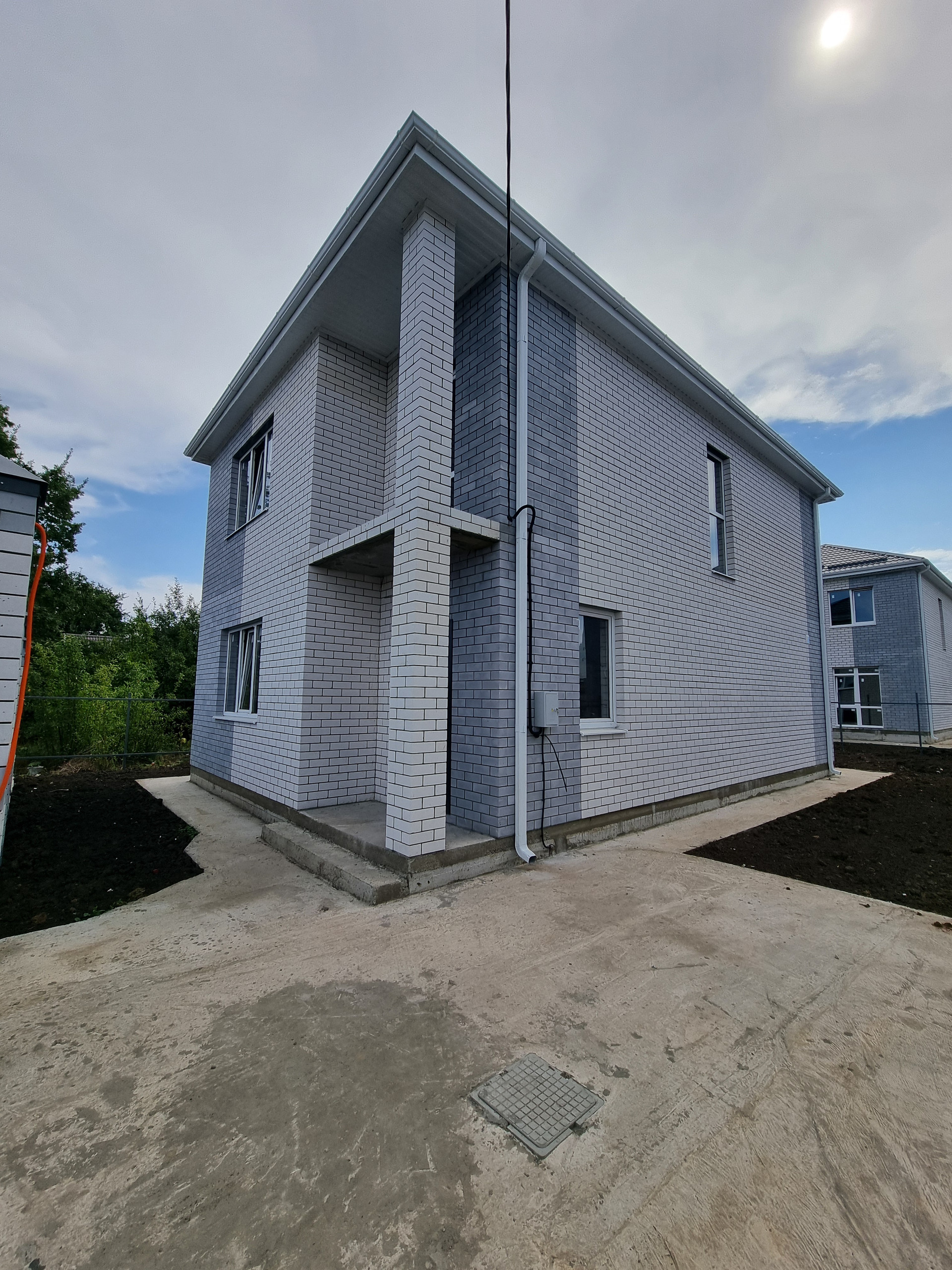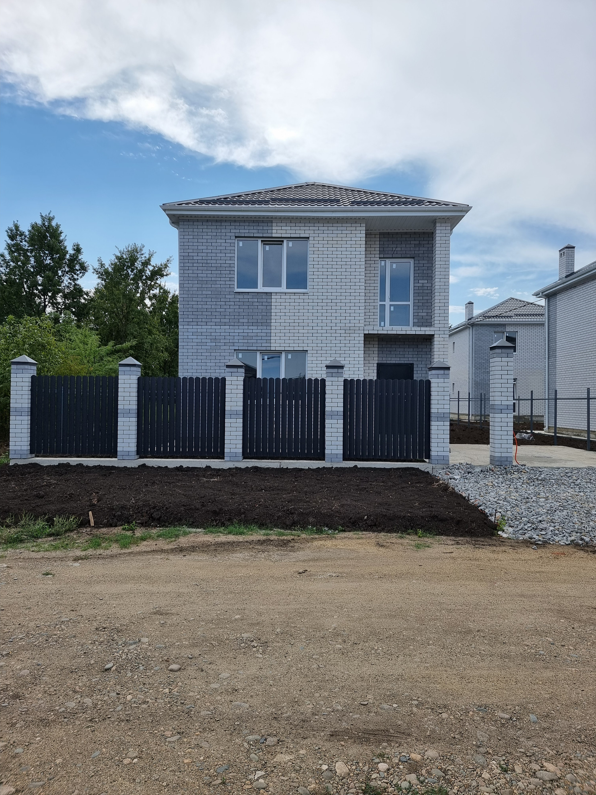 Земельный участок 3,4 сотки ИЖС, в дожди участок сухой. По фасаду участка установлены колонны, ворота, калитка. По периметру участка забор из металлопрофиля, устроена бетонированная зона для парковки двух автомобилей, вход от калитки до входа в дом, отмостка вокруг дома полностью готова к укладке тротуарной плитки.