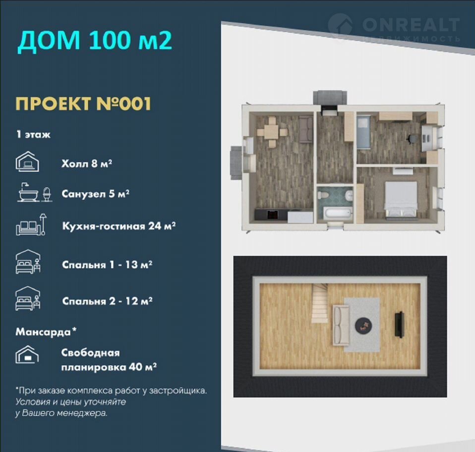 1. Дом двухэтажный (второй этаж мансарда свободной планировки), общей площадью 100 м2 (60 м 1 эт + 40 м 2 эт): кухня-гостиная + 2 комнаты (без учета мансарды, где можно сделать ещё две комнаты).