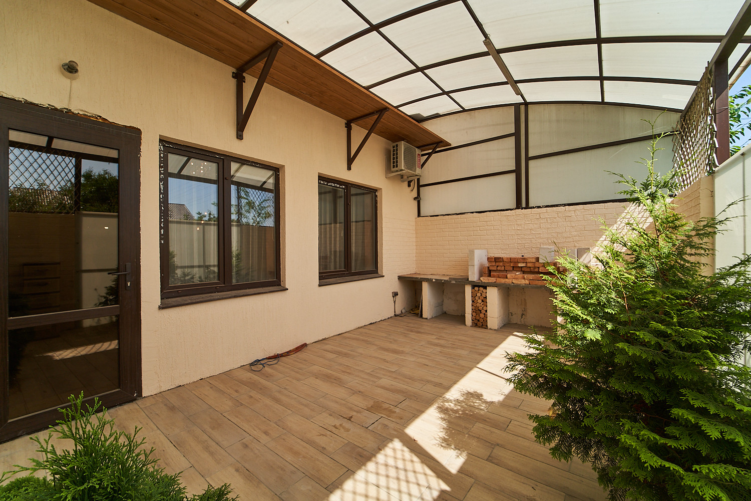 За домом зона отдыха и большой мангал под навесом из мягкой кровли, помещается большой бассейн.