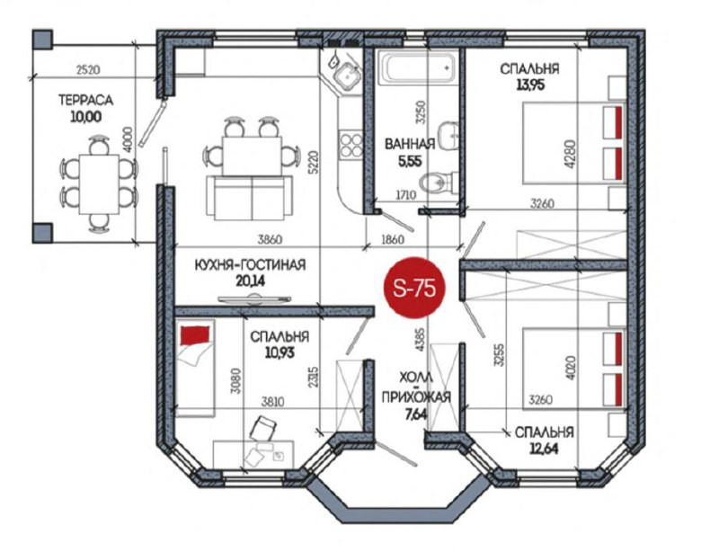 Общая площадь 75 м2